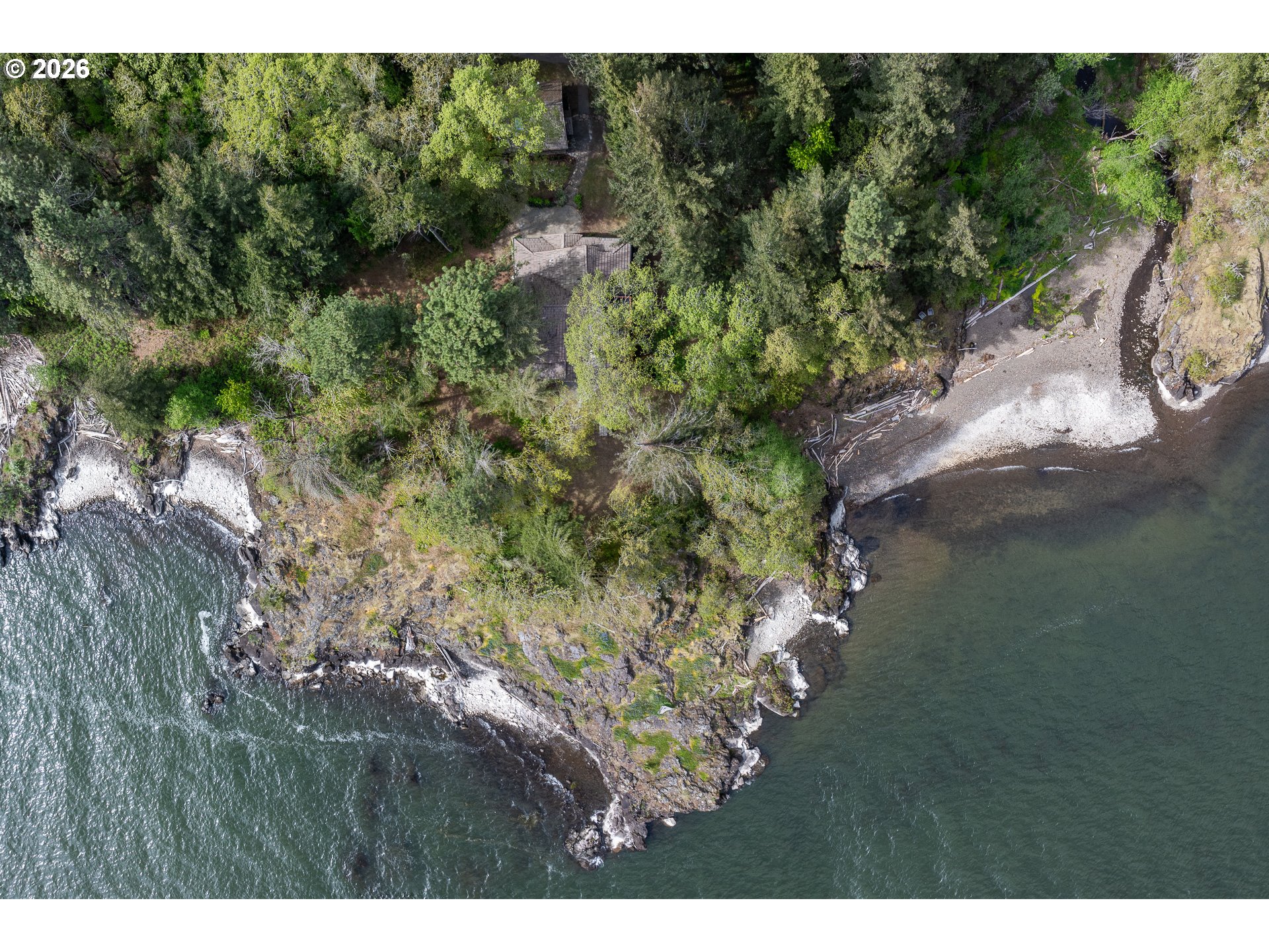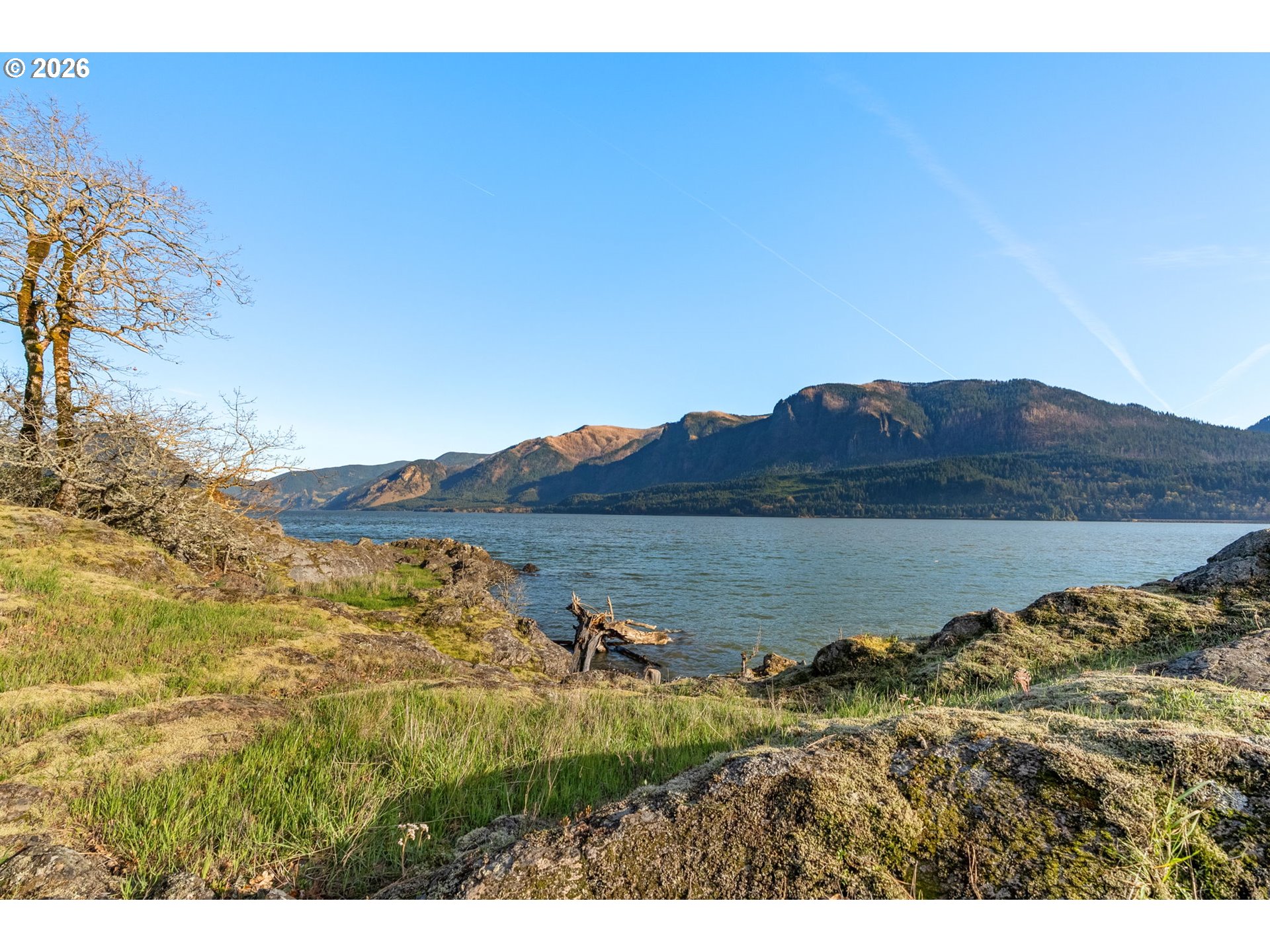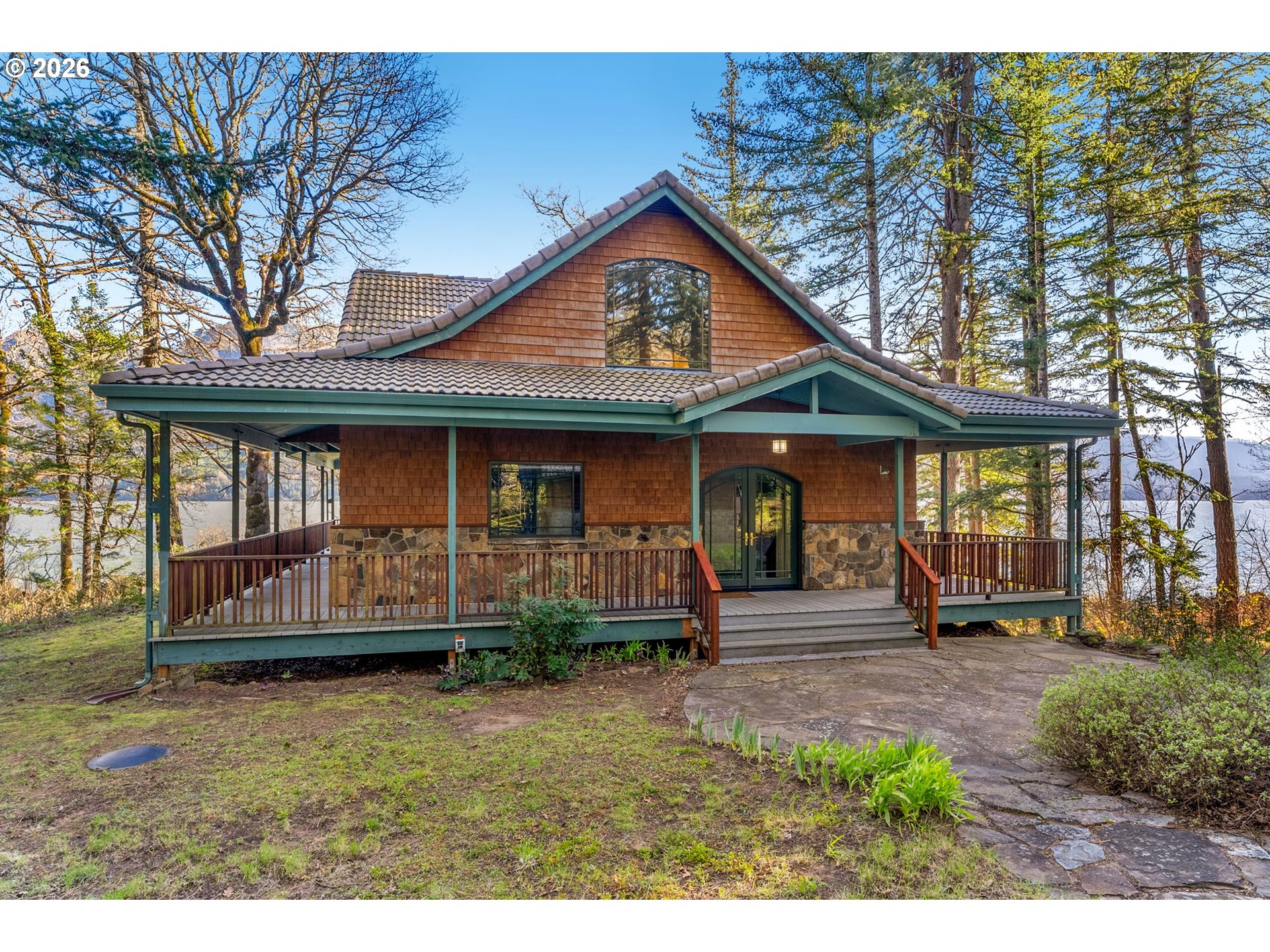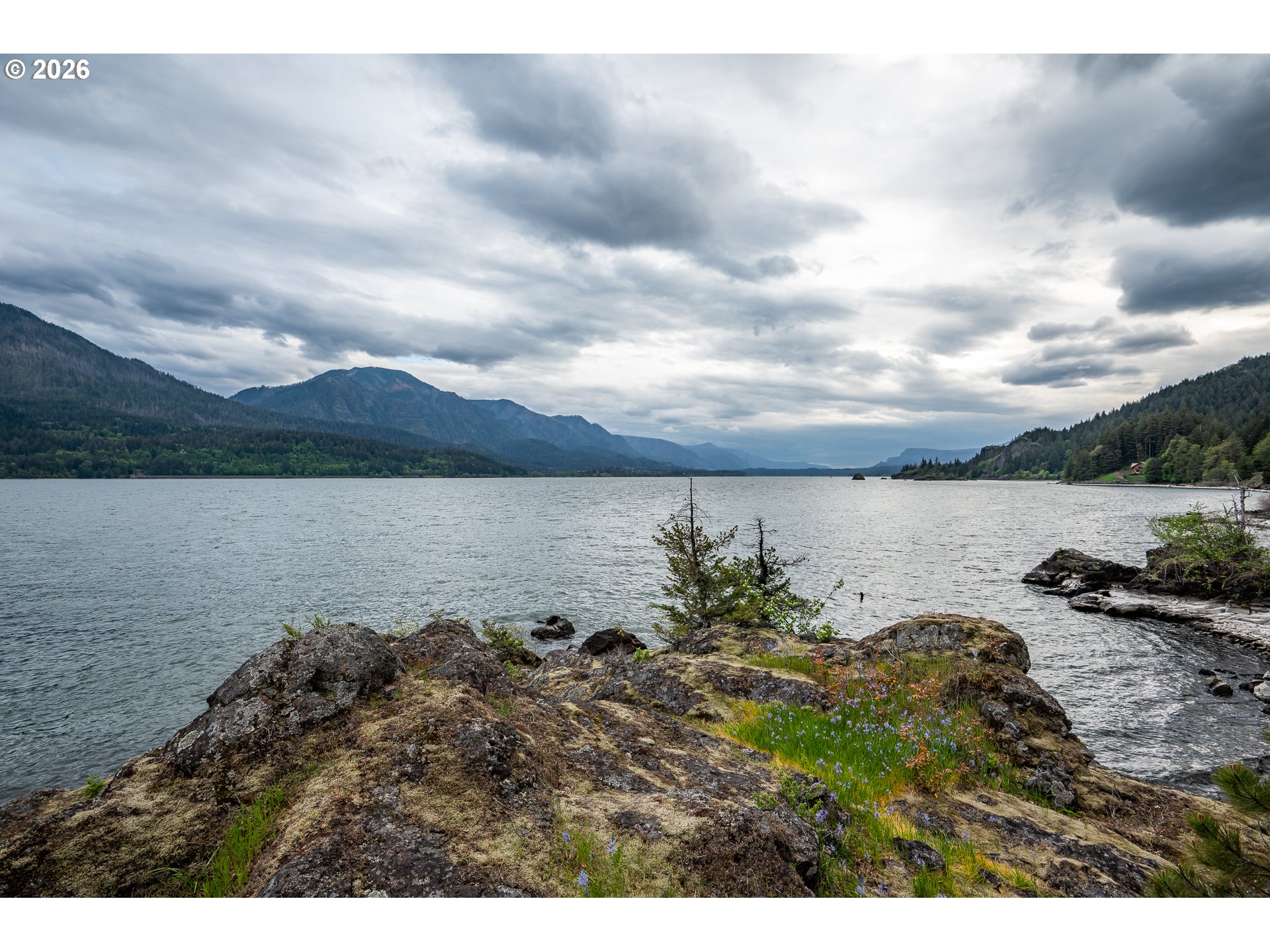 One-of-a-kind waterfront property in the heart of the Columbia River Gorge. Welcome to your own private paradise! Bordered to the south by the Columbia River, this property boasts an expansive beach, multiple inlets, and a bluff along 750+ feet of private waterfront. The beautiful year-round Carson Creek flows through the lush, forested acreage, providing a habitat for abundant wildlife. Just steps from the water lies a custom-built home offering stunning sunrise-to-sunset views. The home features stone siding quarried on-site and a covered wrap-around porch, inviting you to relax and enjoy the serene surroundings. Main Level Features: beamed ceilings, Australian Cypress floors, open-concept living area with a custom fireplace, primary suite, and laundry nook. Upper Level Features: large picture windows, family room, spacious office/bonus room, 2nd bedroom with private balcony, 2nd bathroom with walk-in shower and soaking tub. A custom-built detached guest studio provides privacy for your visitors, complete with a walk-in closet, bathroom, loft, and fireplace. Enjoy the abundant wildlife and breathtaking views from your private beach, explore the creek bed, or take advantage of river access as a watersports launch site! This property offers something for everyone. Located in the Columbia Gorge National Scenic Area. Buyer due diligence is recommended for any improvements or changes.