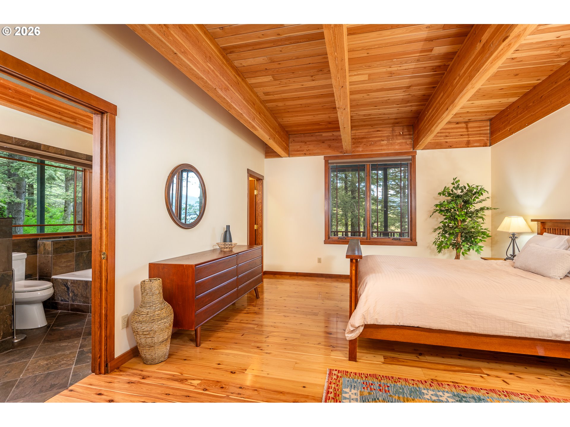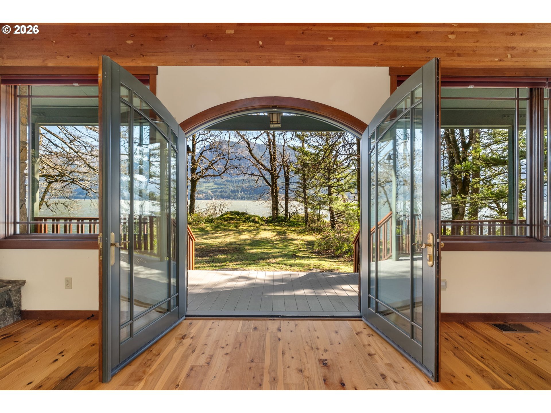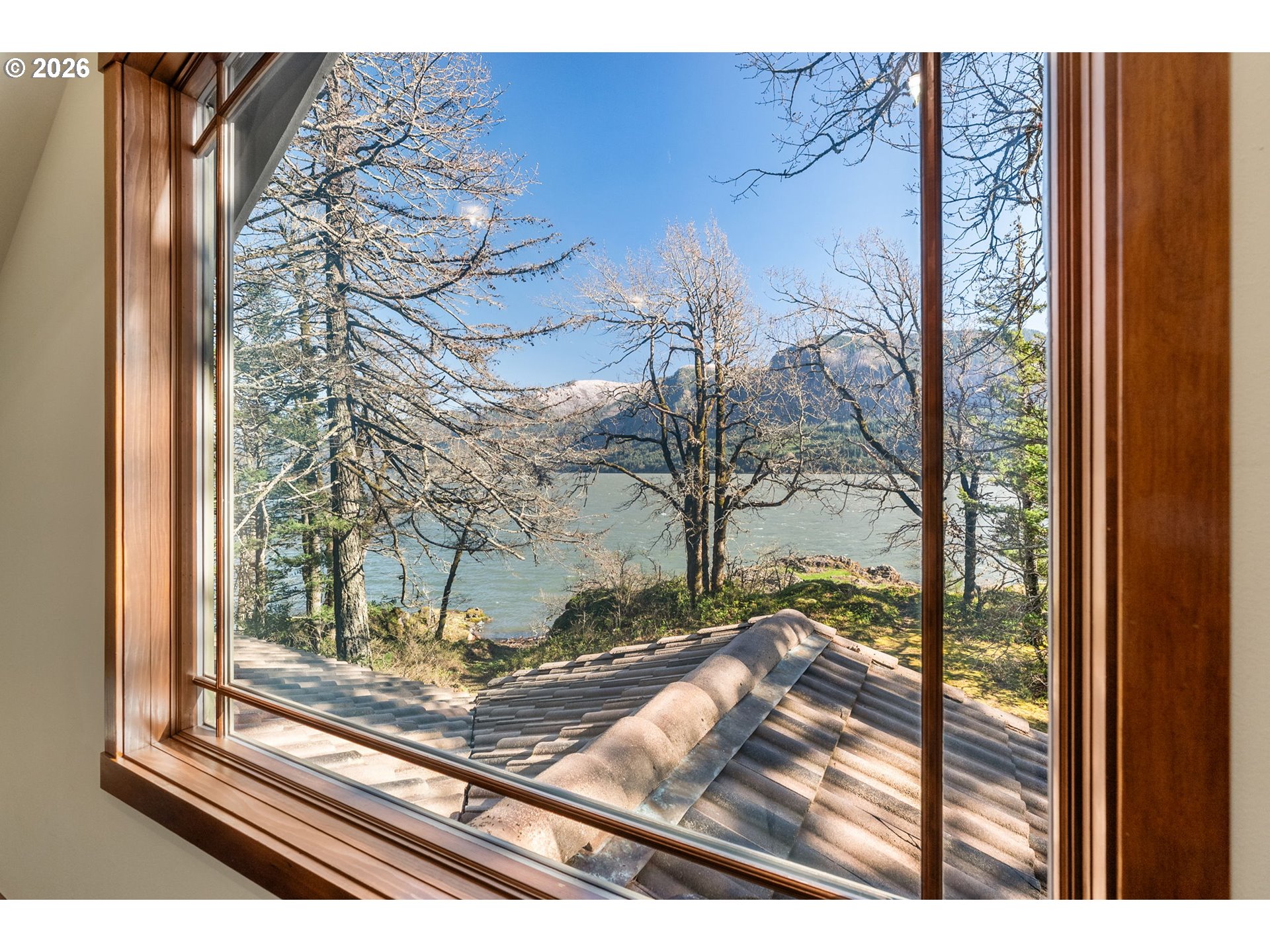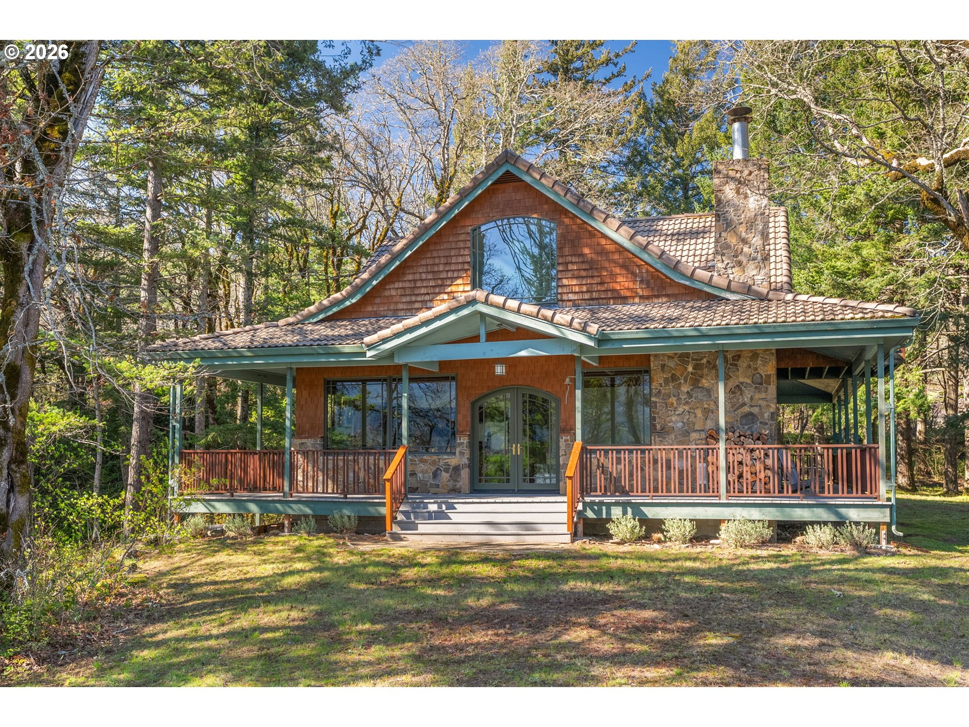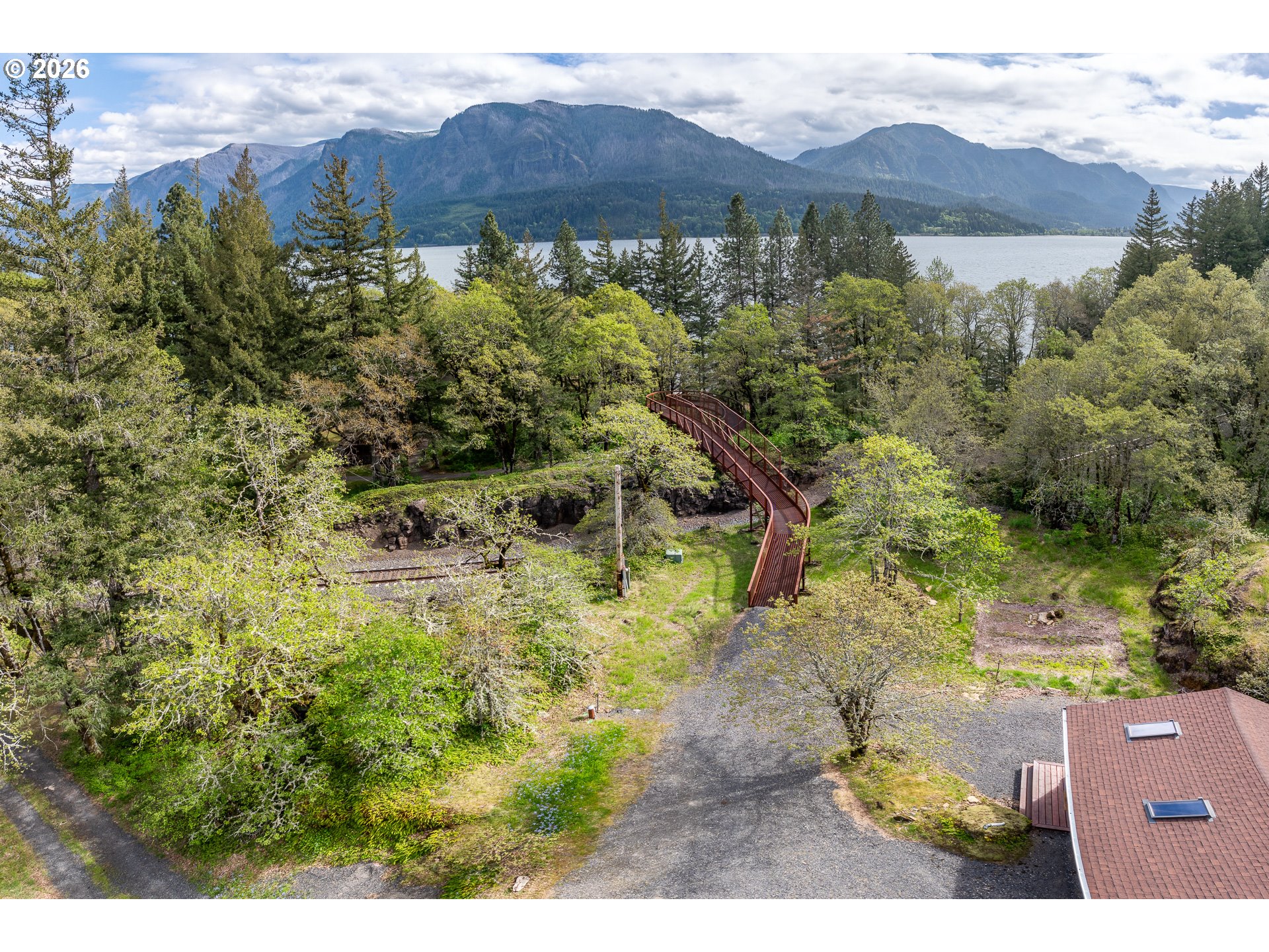 One-of-a-kind waterfront property in the heart of the Columbia River Gorge. Welcome to your own private paradise! Bordered to the south by the Columbia River, this property boasts an expansive beach, multiple inlets, and a bluff along 750+ feet of private waterfront. The beautiful year-round Carson Creek flows through the lush, forested acreage, providing a habitat for abundant wildlife. Just steps from the water lies a custom-built home offering stunning sunrise-to-sunset views. The home features stone siding quarried on-site and a covered wrap-around porch, inviting you to relax and enjoy the serene surroundings. Main Level Features: beamed ceilings, Australian Cypress floors, open-concept living area with a custom fireplace, primary suite, and laundry nook. Upper Level Features: large picture windows, family room, spacious office/bonus room, 2nd bedroom with private balcony, 2nd bathroom with walk-in shower and soaking tub. A custom-built detached guest studio provides privacy for your visitors, complete with a walk-in closet, bathroom, loft, and fireplace. Enjoy the abundant wildlife and breathtaking views from your private beach, explore the creek bed, or take advantage of river access as a watersports launch site! This property offers something for everyone. Located in the Columbia Gorge National Scenic Area. Buyer due diligence is recommended for any improvements or changes.