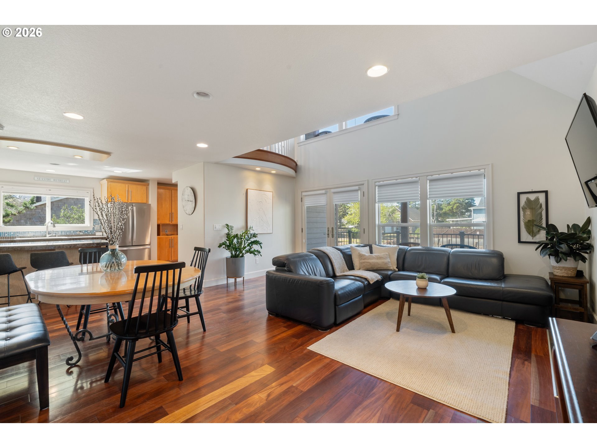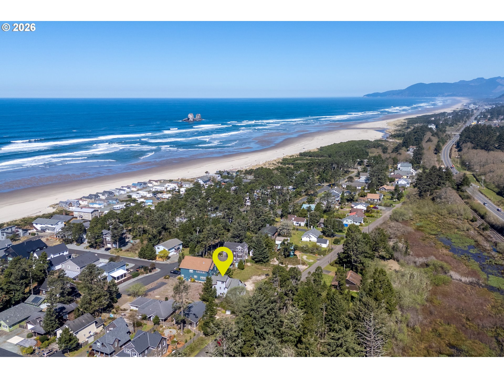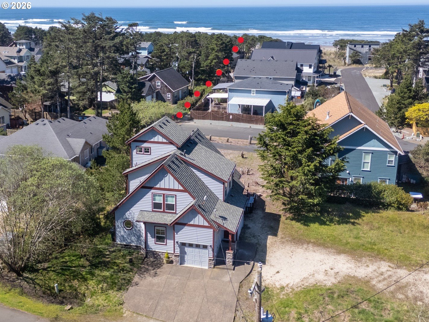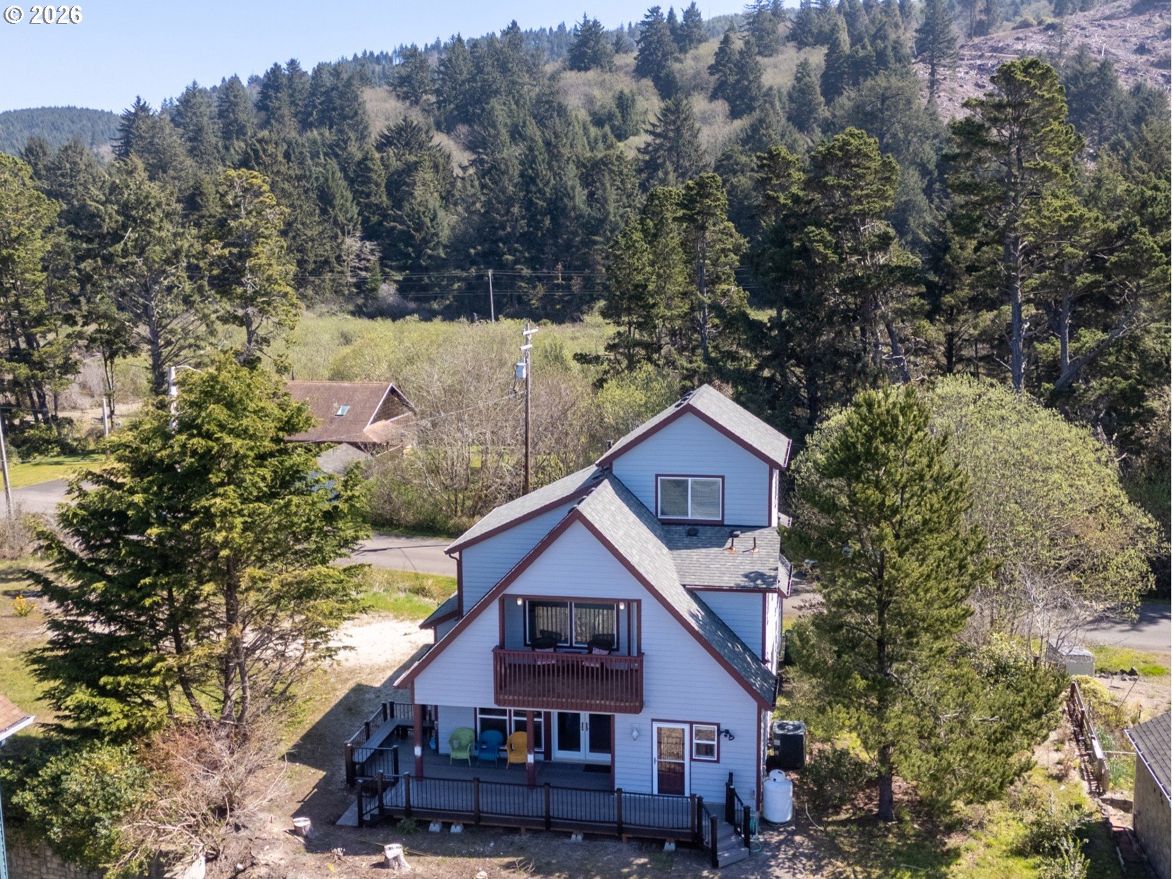 Income-ready and exceptionally located, this custom-built 4-bedroom, 4-bathroom coastal home located outside the FEMA-designated flood zone—a rare and highly desirable coastal advantage—offered with a transferable short-term rental permit for immediate income potential and partially furnished for a seamless transition. Ideally positioned just one block from the beach and bordering the coveted Pine Beach Loop neighborhood, the property includes deeded access to a beautifully maintained private beach trail, all without HOA dues or restrictions.From the moment you enter, the home opens dramatically with a stunning wall of clerestory windows in the living room, filling the space with natural light and capturing the coastal atmosphere. Warm cherry hardwood floors, a welcoming propane fireplace, and generous living spaces create a warm yet expansive main gathering area.The kitchen blends craftsmanship and function with custom maple cabinetry, granite surfaces, quality appliances, a propane cooktop, and a secondary prep/cleaning station—ideal for coastal living and entertaining.The main-level primary suite offers a peaceful retreat with a spacious en suite bath featuring a walk-in shower and oversized jetted tub. Upstairs, additional bedrooms, two full bathrooms, and a flexible sitting area open to covered decks and outdoor living spaces. At the top, a private crow’s nest bedroom captures ocean views and provides a quiet, elevated escape.Outdoor living is enhanced by expansive updated composite decking and hot/cold water already in place for a future outdoor shower or hot tub. With central A/C, on-demand hot water, and quality construction throughout, the home balances comfort, durability, and long-term flexibility.A rare North Coast offering combining architectural character, privacy, and strong income potential in one of Rockaway Beach’s most desirable coastal settings.
