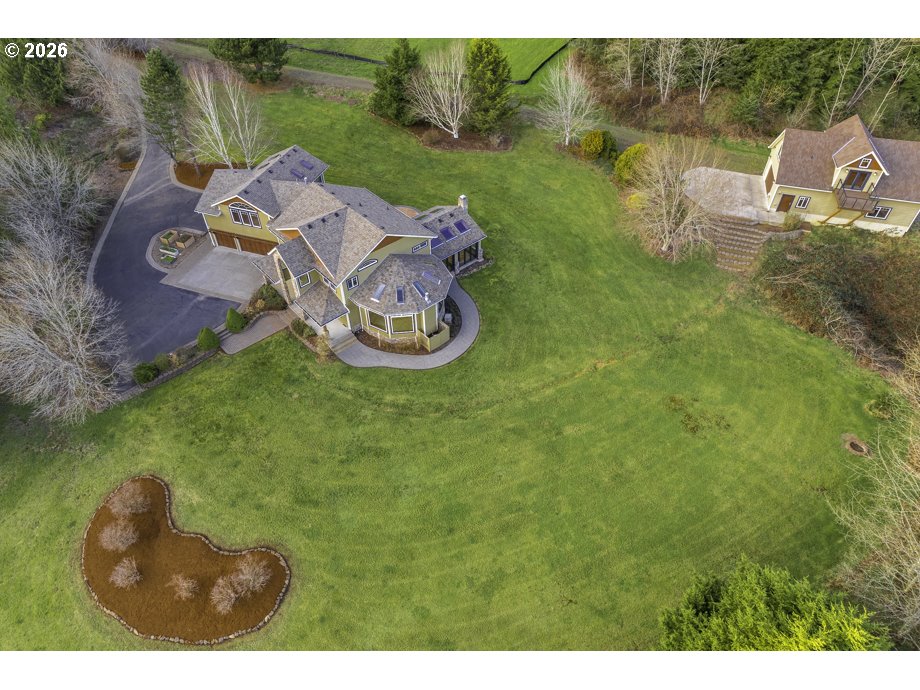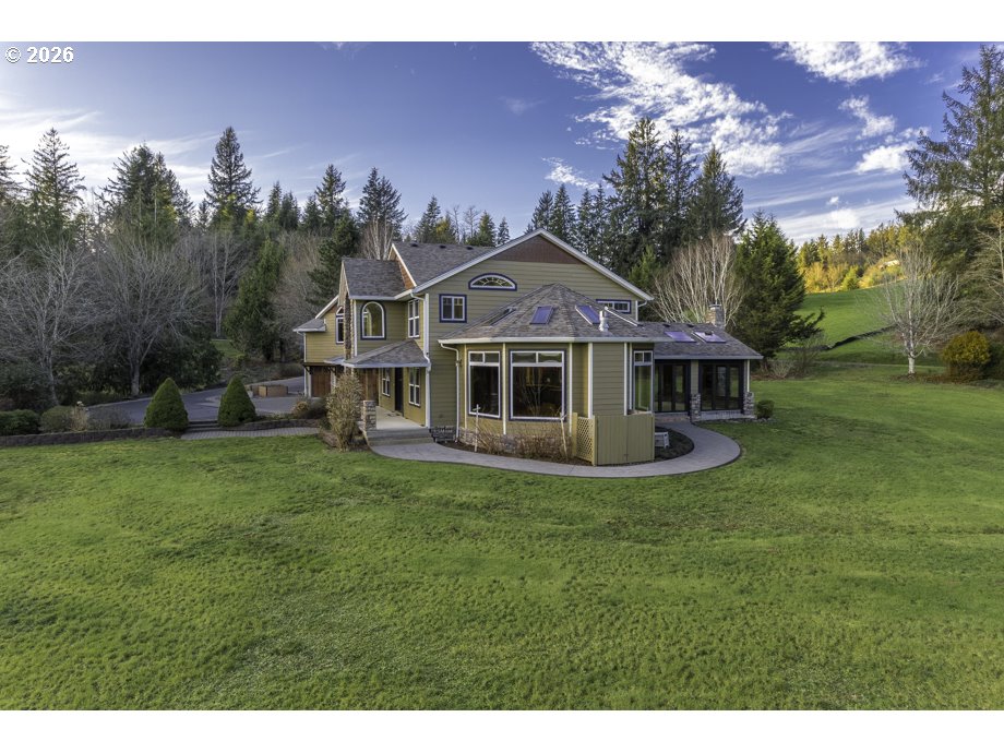 Custom estate on over 2 private acres w/stunning valley views & large detached shop. At the end of a quiet road, this home offers privacy, a brand-new roof & over 4000 sq ft of light-filled living space w/vaulted ceilings, granite CT, wood floors & custom woodwork. Great room features a stone fireplace & walls of windows. Gourmet kitchen w/cherry cabs & 6-burner gas Wolfe stove. Sun porch with stamped concrete, fireplace & indoor-outdoor flow. Finished shop includes 700sf flex space with full bath.