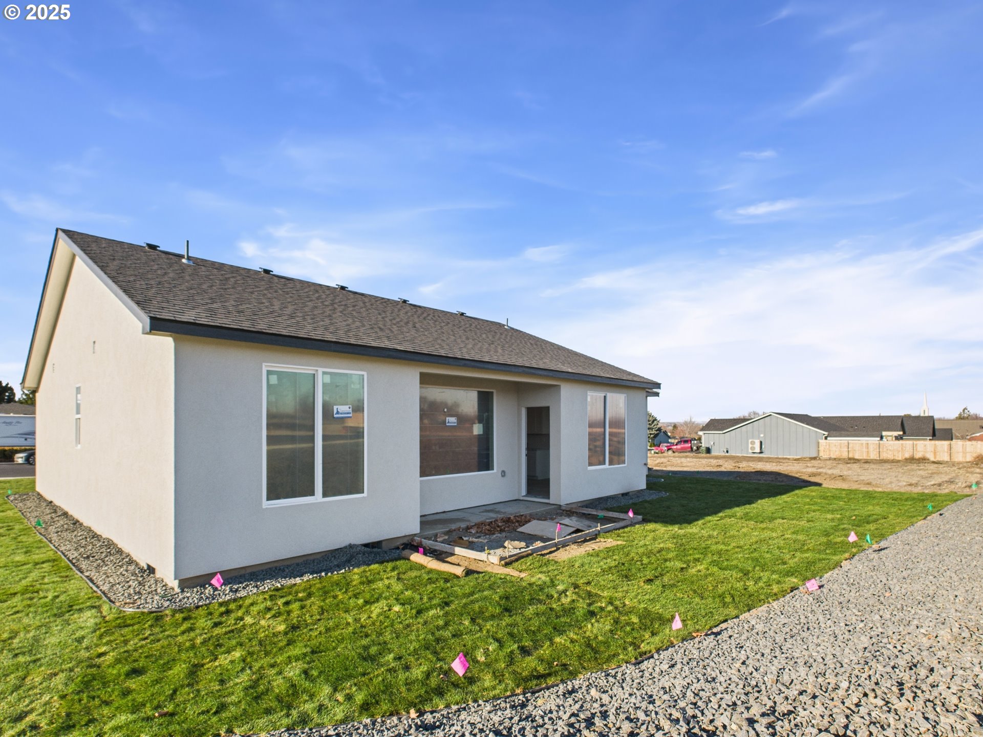 Imagine celebrating the holidays in a brand new home. Welcome to this exquisite, one-of-a-kind residence located on a desirable corner lot in a brand-new Hermiston subdivision.An expansive, open-concept layout greets you, highlighted by soaring ceilings and a modern linear fireplace that provides a stunning focal point. The home flows beautifully across luxury vinyl plank floors, leading to a chef's kitchen with pristine quartz countertops.Retreat to your spacious primary suite, featuring an expansive closet and a spa-like, walk-in tile shower. Every detail, from the modern lighting to the high-end fixtures, has been curated for a high-end living experience.This home is nearly complete and is being offered fully move-in ready with free backyard landscaping included.Located for convenience, you're just moments from Highway 395, with easy access to schools, restaurants, and your commute.This is your chance to be the first. Set an appointment to view this stunning home today!