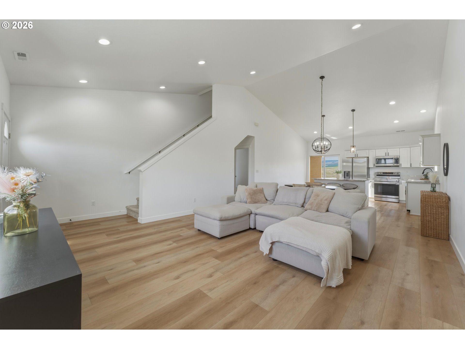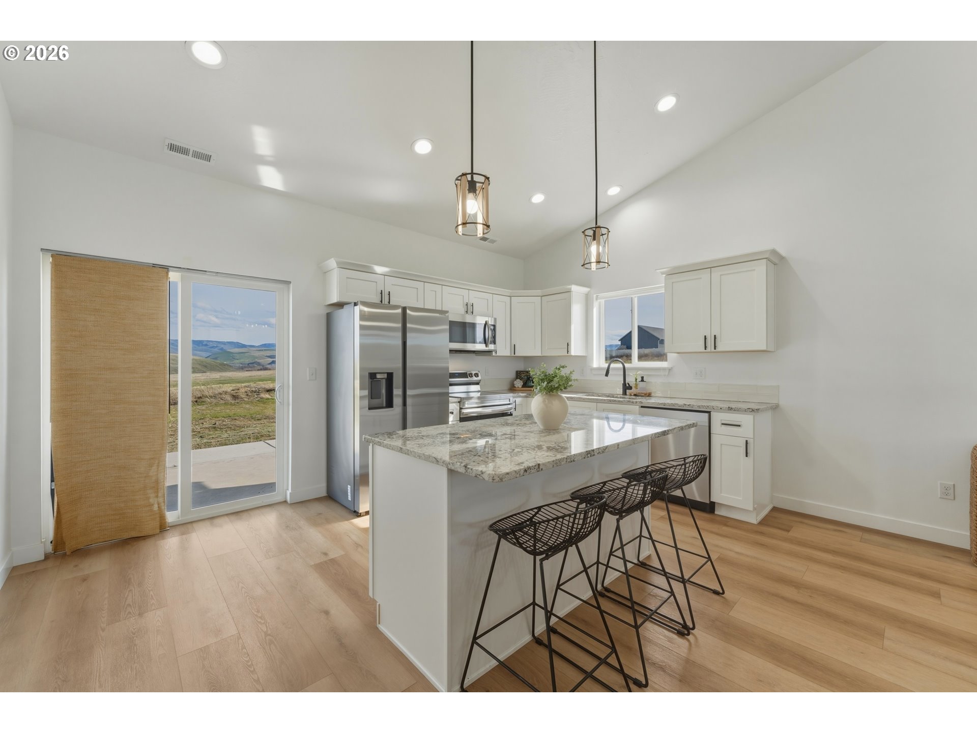 Built in 2022 and impeccably maintained, this 4-bedroom, 2.5-bath two-story home offers modern finishes, open-concept living, and beautiful views on a generous 0.28-acre lot. The main living area features vaulted ceilings and abundant natural light, creating a bright and airy feel throughout. The kitchen is thoughtfully designed with granite countertops, soft-close cabinetry, subway tile backsplash, and Samsung appliances (all included except washer and dryer). Granite surfaces continue into the bathrooms for a cohesive, upgraded finish. The spacious primary suite includes a double vanity and well-appointed bath, while the guest bathroom offers a full tub. Flooring includes a blend of carpet and durable vinyl for both comfort and functionality. Outdoor spaces have been enhanced with extended front and back patios, newly installed front lawn with stone walkway accents, and open views with no HOA restrictions. The yard is clean and ready for customization, offering plenty of room to create your ideal outdoor space. This home includes an attached garage with additional driveway parking, and great curb appeal. Move-in ready and better than new.