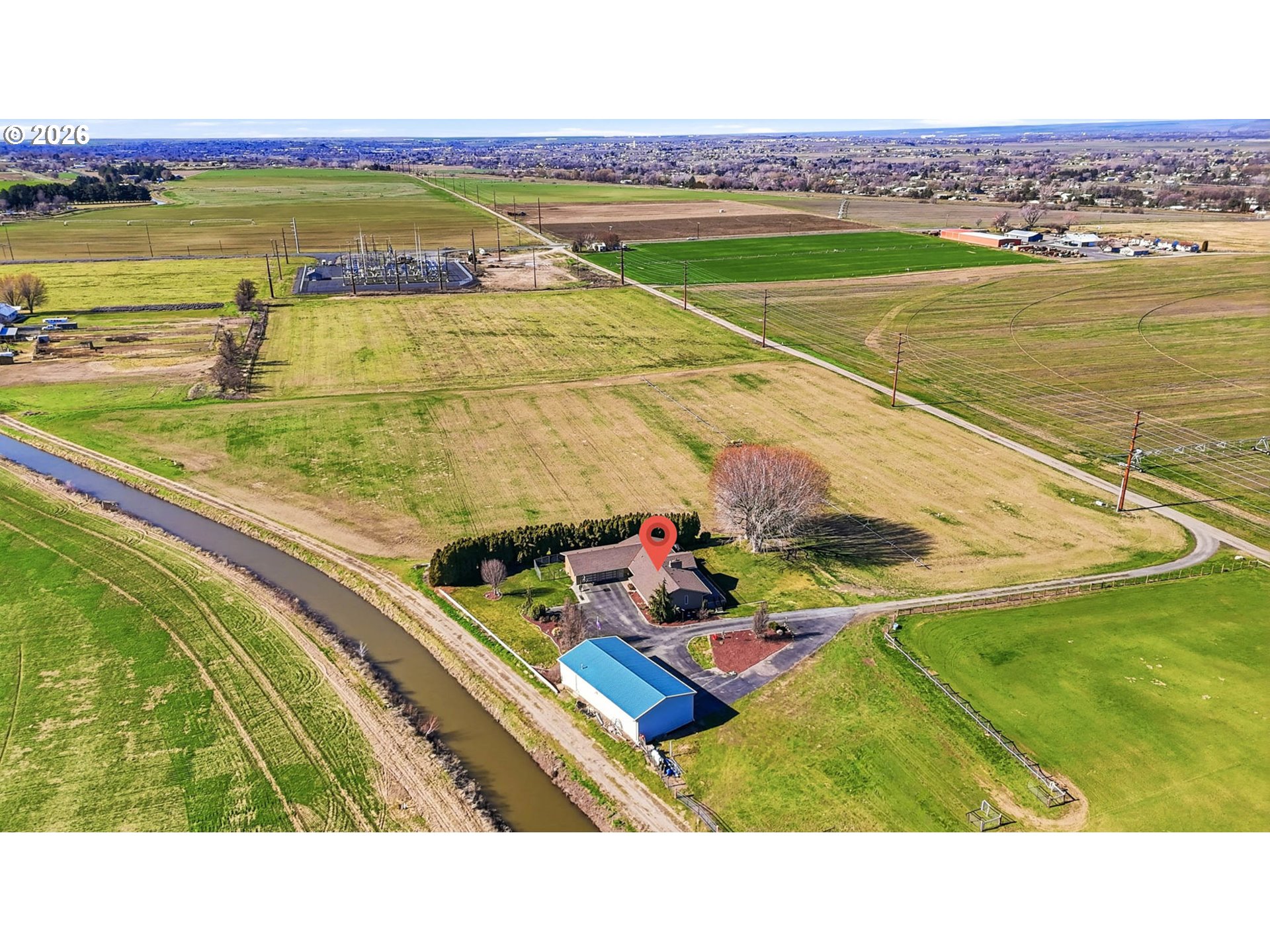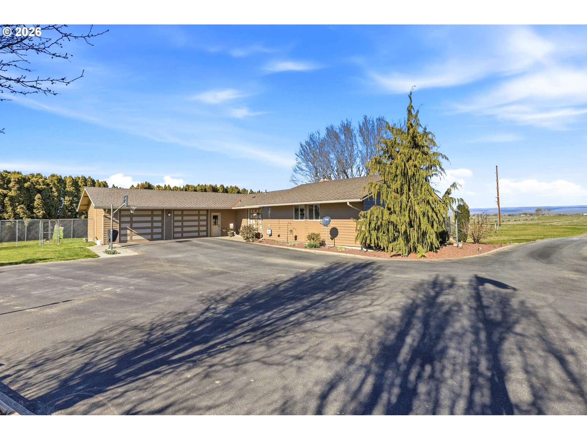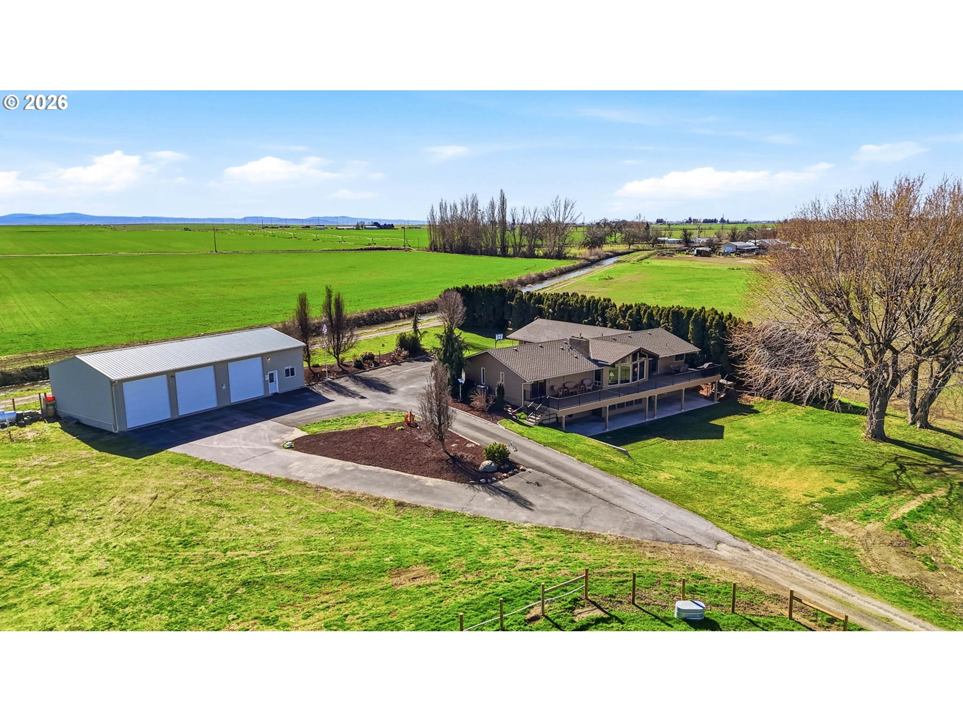 Here's the remarkable small farm lifestyle you’ve been searching for! Set on 15.45 irrigated acres and planted in a new crop of alfalfa. Ready for your animals, equipment, projects, and gardening. The centerpiece for projects is the 30x60 insulated shop. Features propane heat, a loft, dedicated office space, and a bathroom (sewer connection needed). Three 12-ft automatic roll-up doors provide access for equipment, RVs, trailers, or toys, supporting a small business operation, building or restoring. The 2908 sq ft home has been extensively updated with new flooring, paint, and entirely new kitchen, bathrooms and laundry. The kitchen is designed to be the gathering spot and opens to a dining area. From the dining you have access to the newly expanded upper deck—perfect for BBQ-ing and entertaining. The adjacent living room features a stone fireplace as its focal point and vaulted ceilings. The entire North-facing wall in the kitchen, dining and living has expansive windows offering views of the surrounding farm land and the Columbia River gorge. A bonus area off the kitchen serves as a sitting room or second eating area. The spacious primary suite highlights a fully remodeled bathroom with a tiled walk-in shower and dual shower heads. Doors from the suite lead out to the deck for private morning and evening moments. The lower level is built for entertainment, featuring a large game/TV area, a small kitchenette, two spare bedrooms, and a fully remodeled bathroom.This level provides access to the tuck-under garage, ideal for tinkering with small toys or use as a home gym. The home also includes an attached two-car garage, accessible from the upper living space. The homes exterior has been freshly painted and the roof was replaced in 2016. If your vision includes acreage, a substantial shop, and the opportunity to enjoy your own income-producing farm, this property delivers on all fronts. Schedule a private showing to see how it fits your needs.