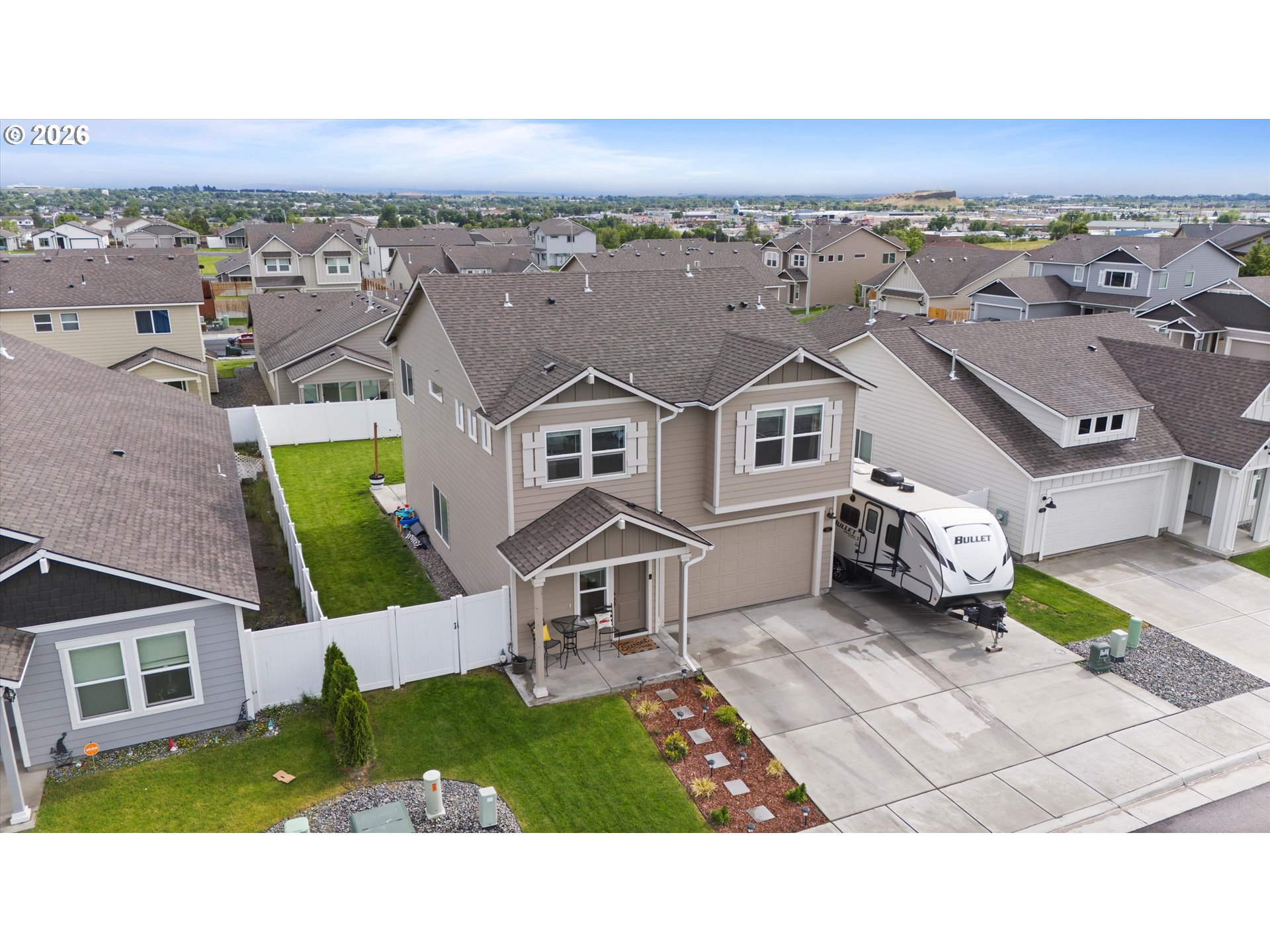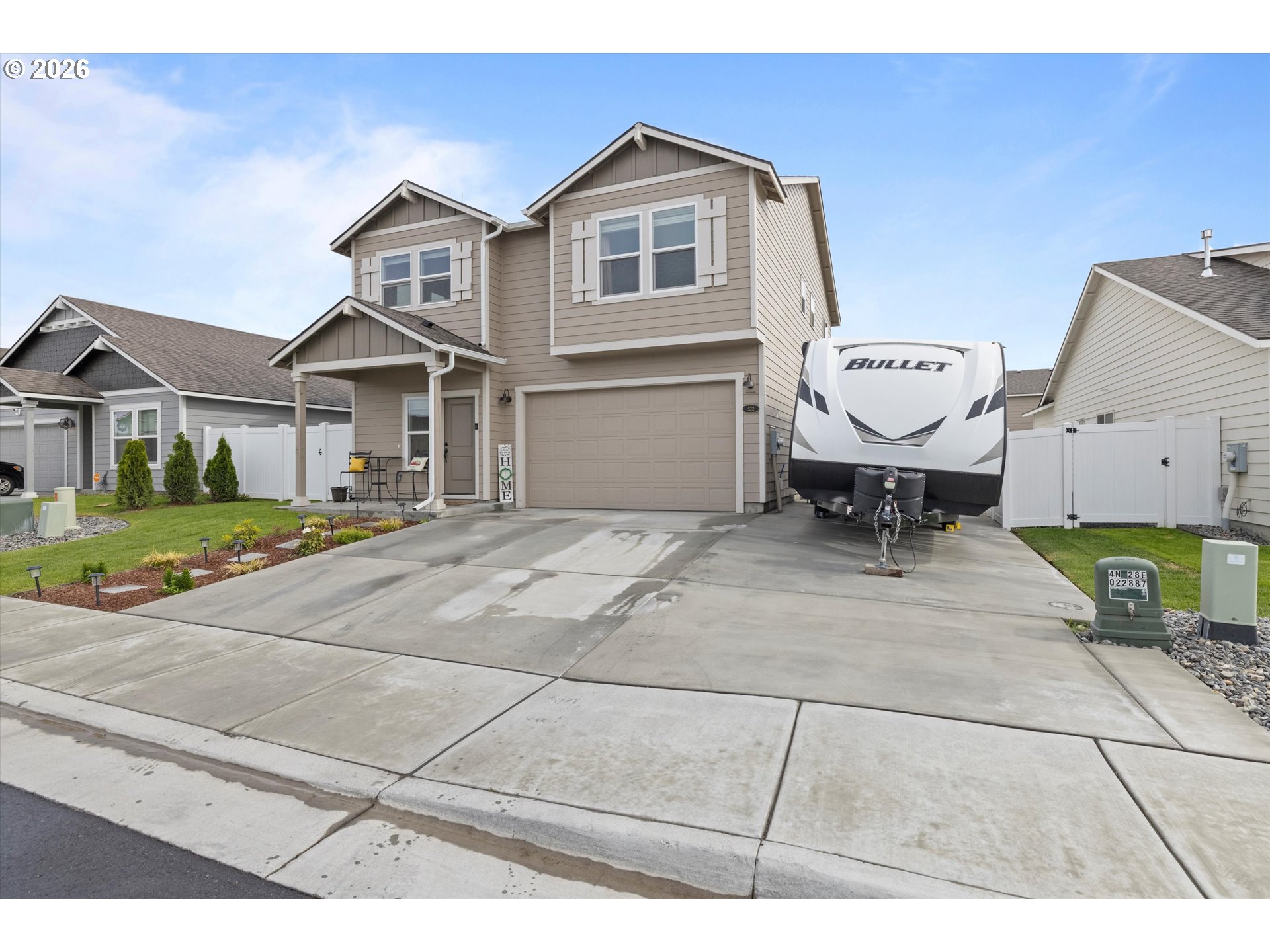 Welcome to this stunning new home built in 2022, boasting modern features and thoughtful upgrades throughout. This two-story residence offers a unique touch with extra concrete poured in the back, extending the patio and providing ample space for outdoor enjoyment. The side area includes additional concrete, perfect for storing a boat or RV with ease.The property is completely fenced, offering privacy and security, while the covered patio in the backyard provides an ideal spot to relax and enjoy the 4th of July fireworks display. Upstairs, you'll find a charming bonus room area alongside well-appointed bedrooms that offer comfort and space for the entire family.The lower level features a convenient half bath and an open-concept kitchen, making it ideal for entertaining guests and creating cherished memories. This home seamlessly blends functionality with modern design, offering a welcoming sanctuary for you and your loved ones. Don't miss the opportunity to make this beautifully crafted home your own and experience the perfect blend of comfort and luxury in every detail.