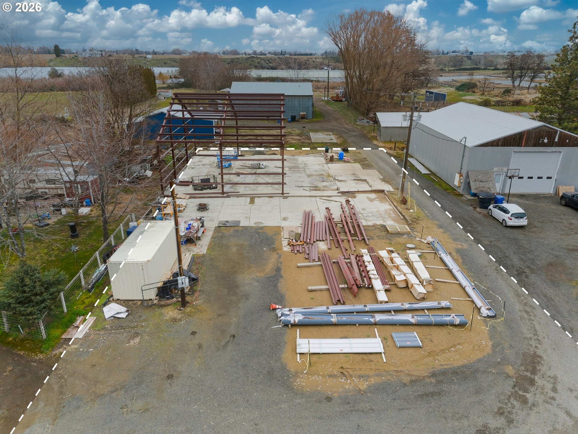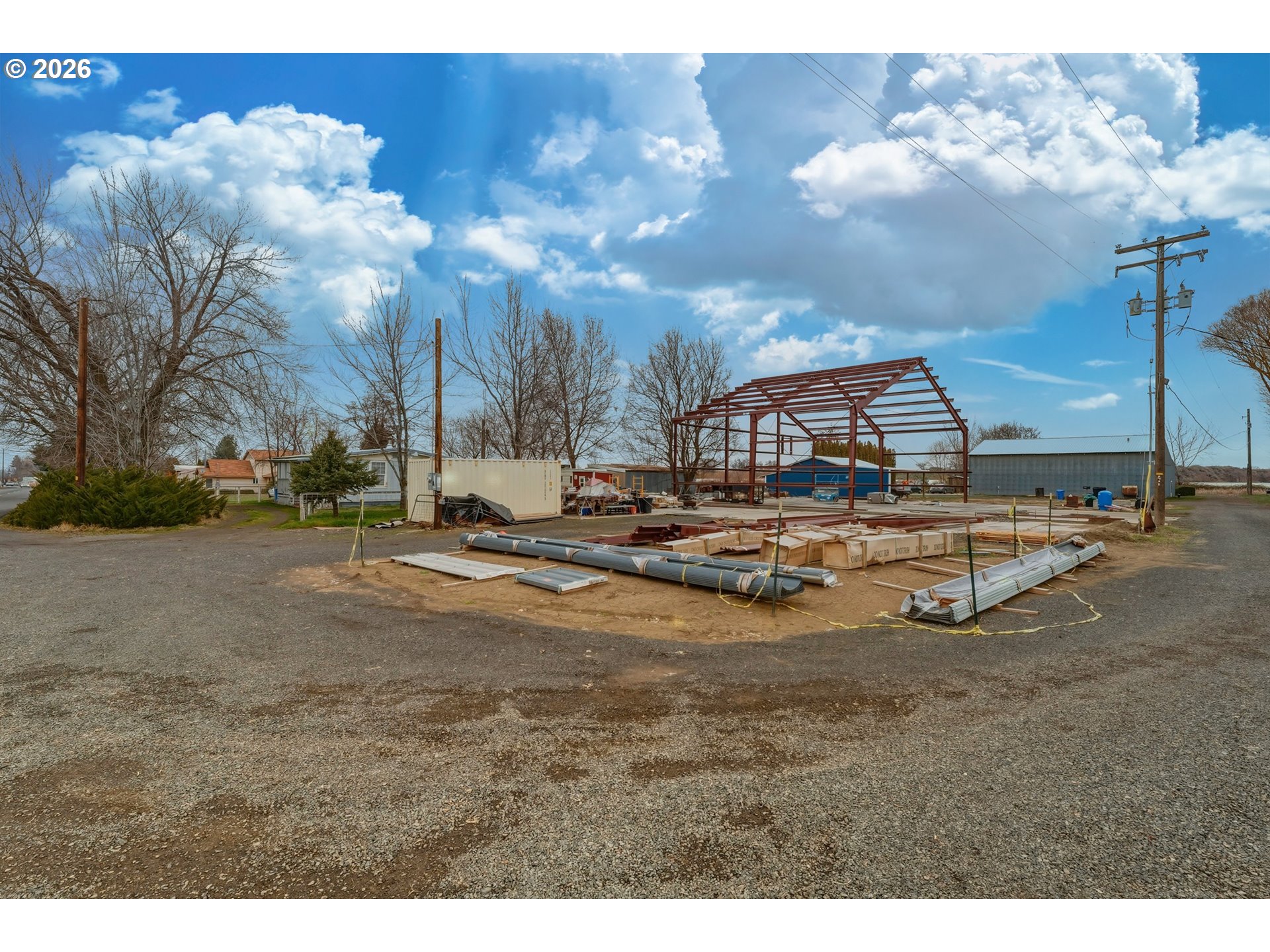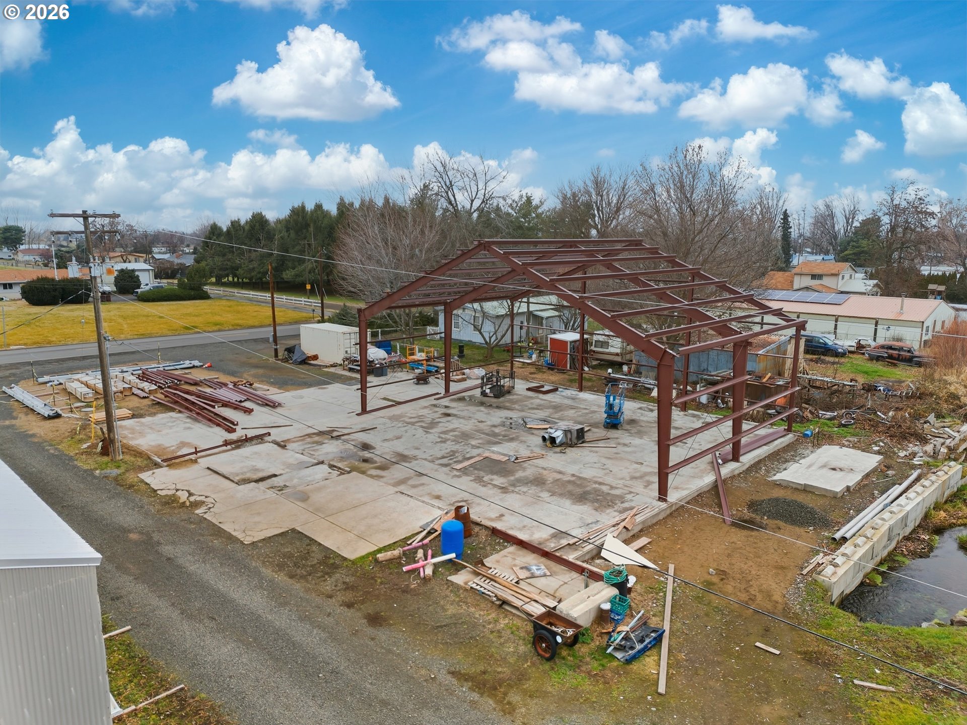 This is a golden opportunity to get in on the ground floor of a new build which you can complete on your own, with your contractor, or with seller's help. Parts and plans for a large shopominium included in the sale. Well and septic are installed, power is run to the property. Slab is intact and framing has been started. Parts to complete the project, scissor lift and tele-handler included. Please do not visit property without your real estate agent. First picture is an artists representation of what the shop might look like when completed.