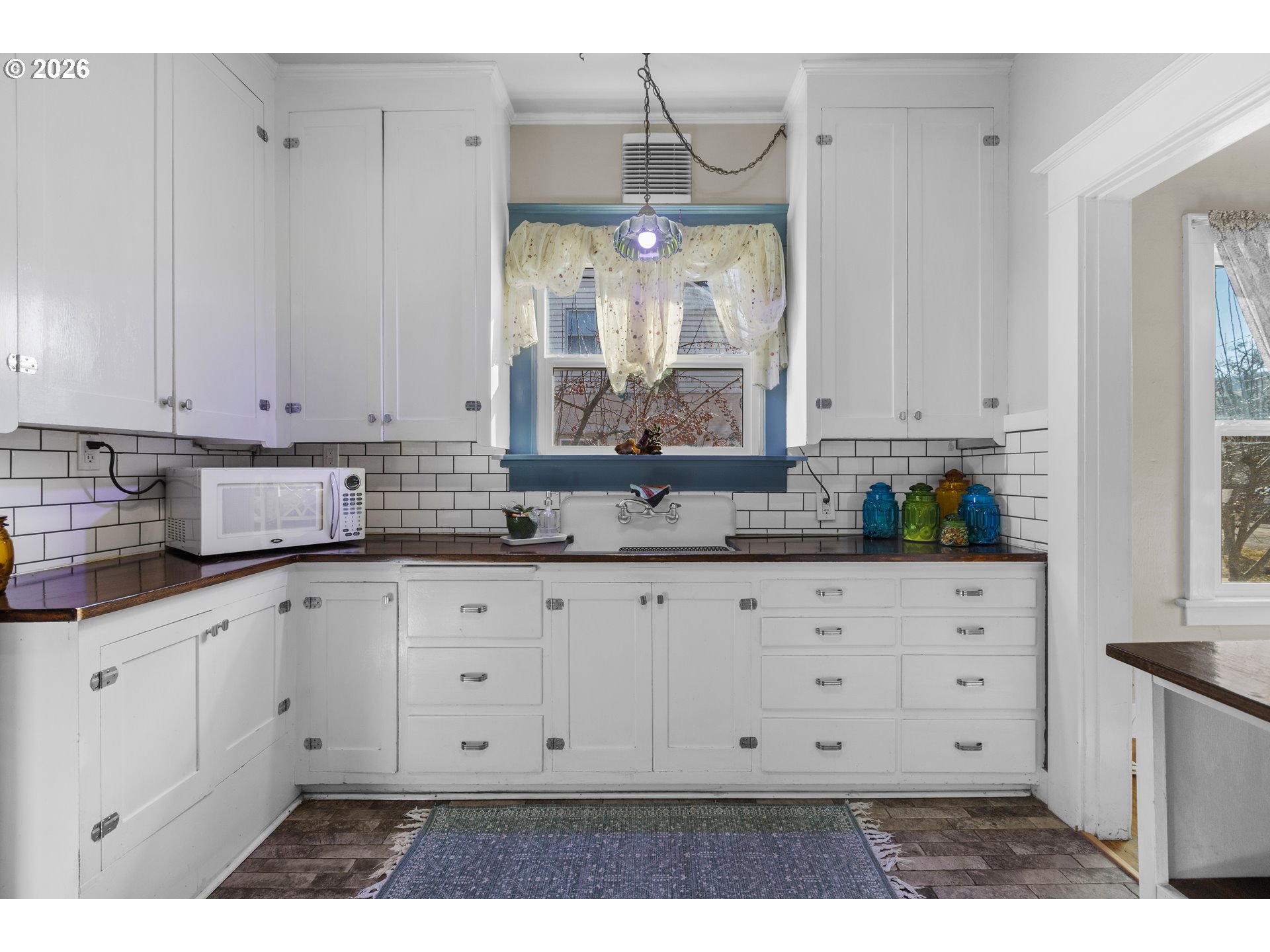 Charming and well-located, this 2/3 bedroom, one-bath bungalow sits just two blocks from EOU and only a few blocks from downtown La Grande. Recent updates include a 50-year roof, newer exterior paint, vinyl windows, and a deck overlooking a fully fenced backyard that grows into a beautiful, flower-filled sanctuary. A chicken coop adds both character and possibility and may be included if the buyer desires. Inside, original wood flooring in the living, dining and bedrooms pairs beautifully with classic coved ceilings, preserving the home’s timeless appeal. The kitchen offers ample storage with tall painted cabinets complemented by warm wood countertops. Two comfortable main-level bedrooms share a charming bathroom featuring penny tile and tasteful updates. The basement provides excellent storage along with a small apartment-style space with kitchenette, plus laundry, offering flexibility for guests, extended living, or additional income potential.