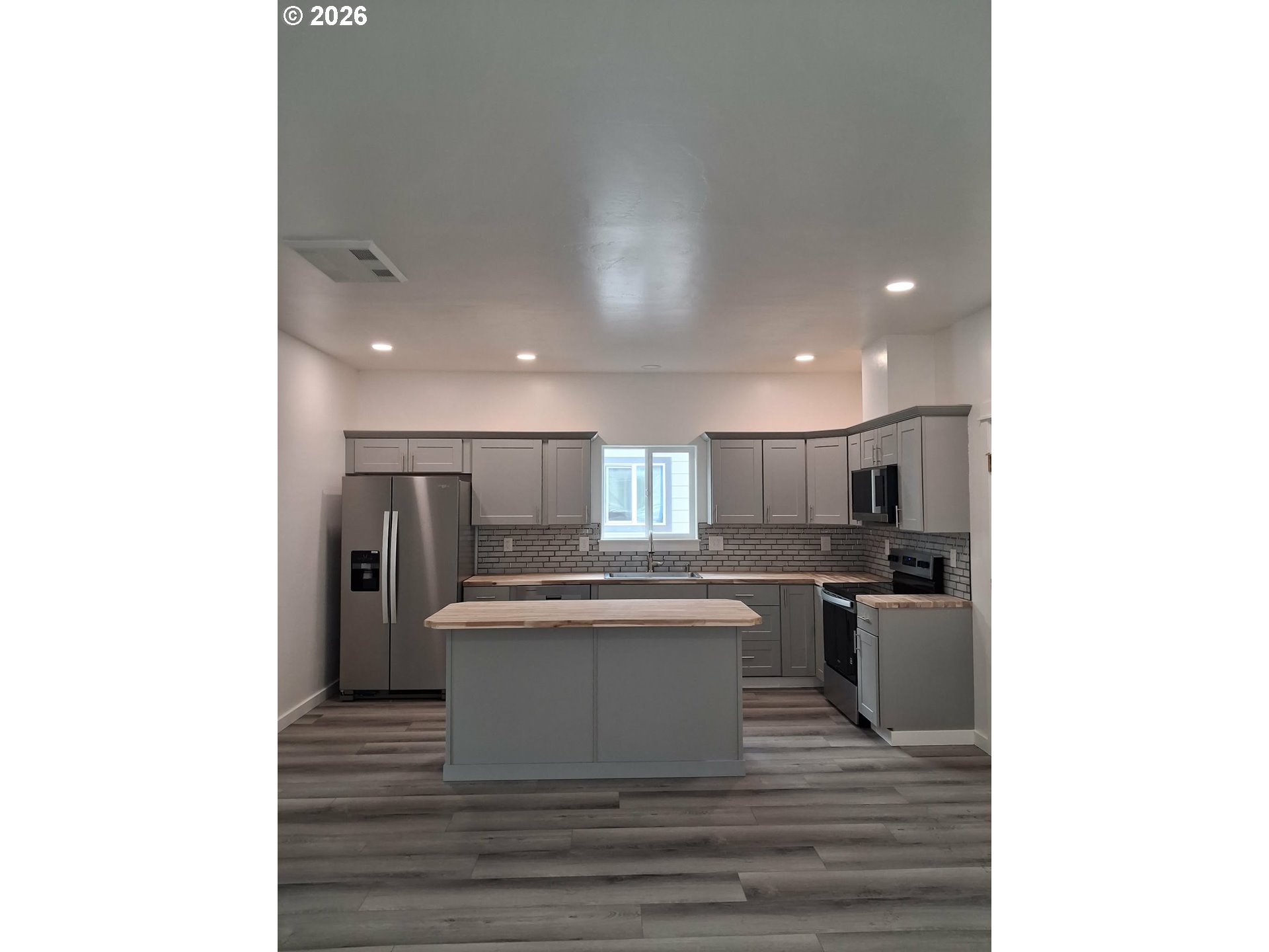 Beautiful new construction in La Grande’s True Subdivision offers thoughtfully planned single-level living with 3 bedrooms, 2 full bathrooms, and an open floor plan designed for comfort and function. The kitchen features butcher block countertops, a stylish tile backsplash, and flows easily into the main living area, creating an inviting space for gathering or everyday living. Durable LVP flooring carries through the main spaces, with soft neutral carpet in the bedrooms for added comfort. The primary suite includes a walk-in shower and private bath for a relaxing retreat. Situated on a slightly larger lot in this phase, the home also offers a fenced backyard with grassy space for pets, gardening, or outdoor enjoyment, plus a covered carport for convenient parking and additional outdoor living. Guest parking is available near the subdivision entrance. With modern finishes, efficient design, and low-maintenance appeal, this home offers a wonderful opportunity to enjoy easy living in a thoughtfully designed newer home.
