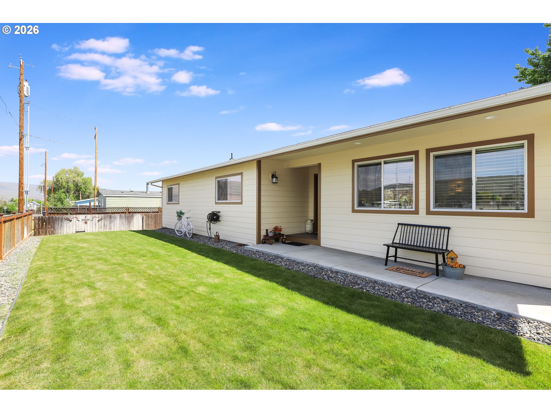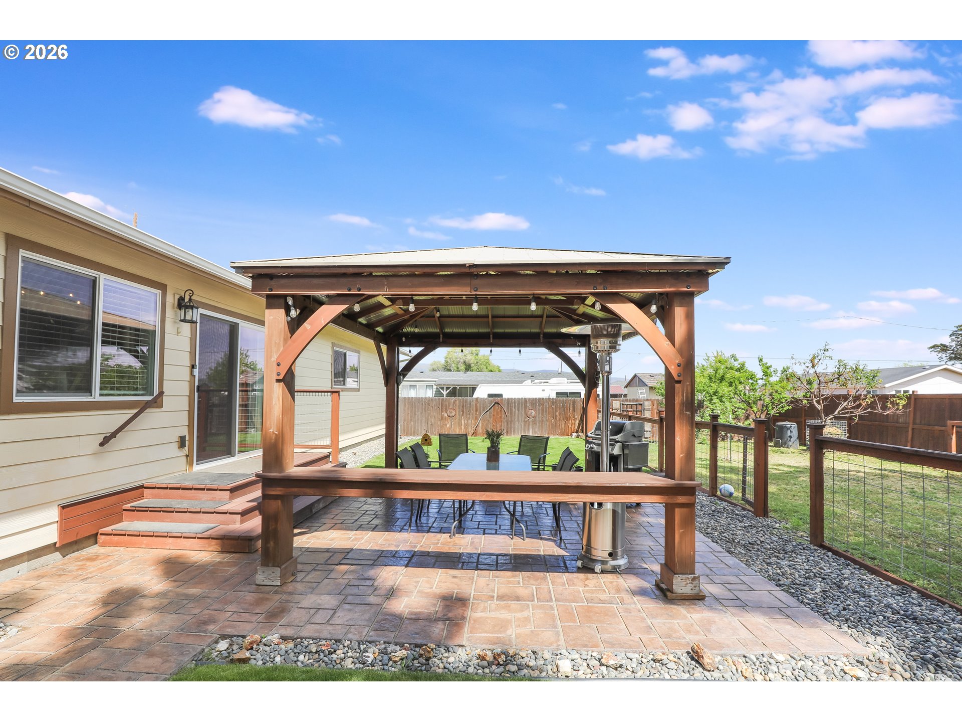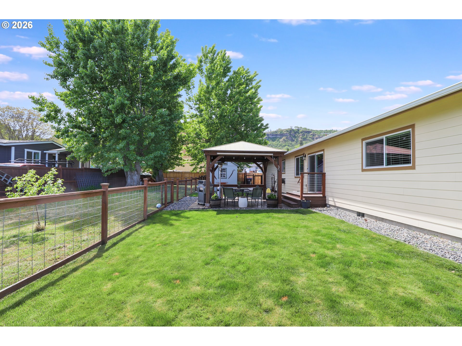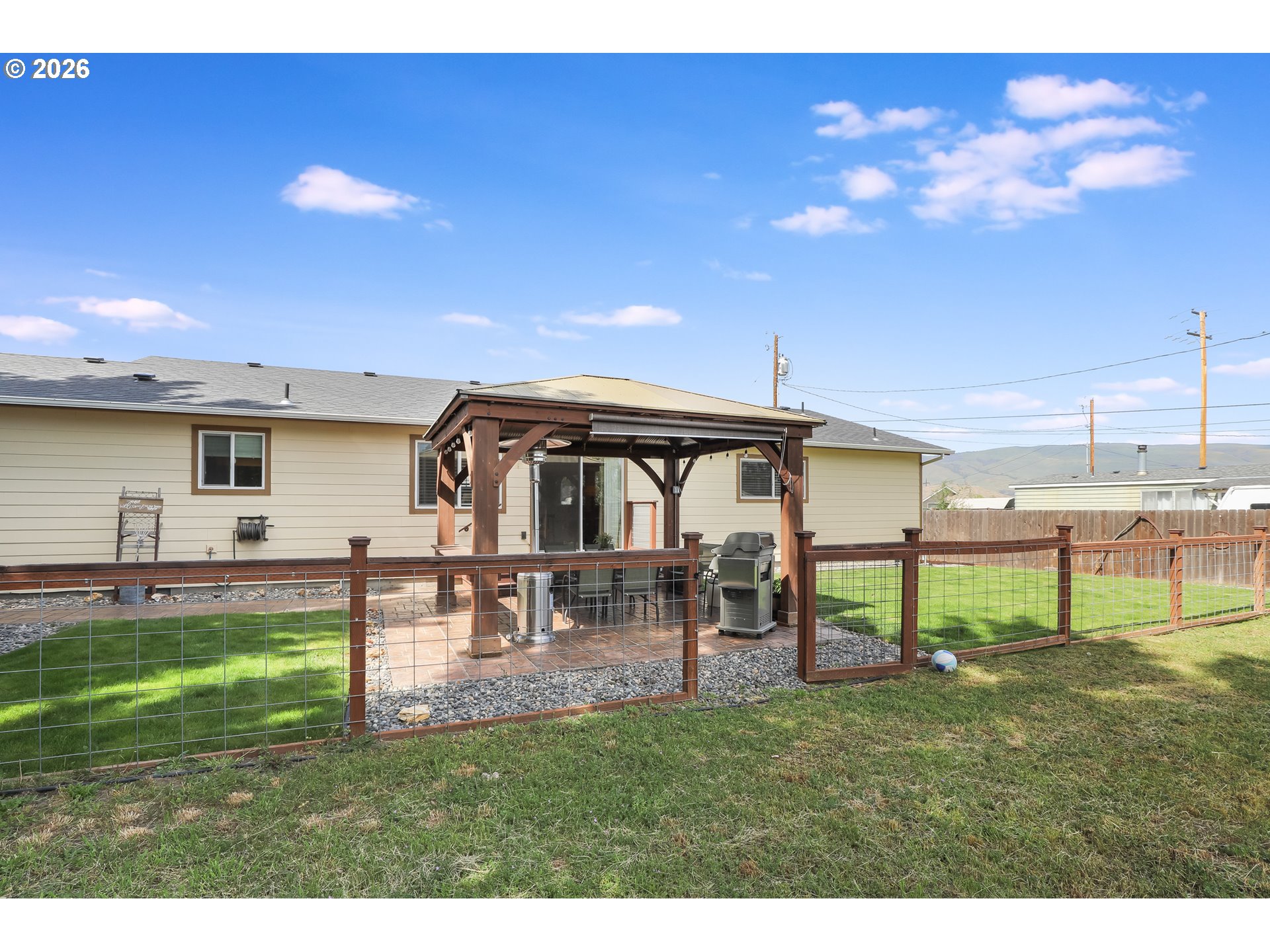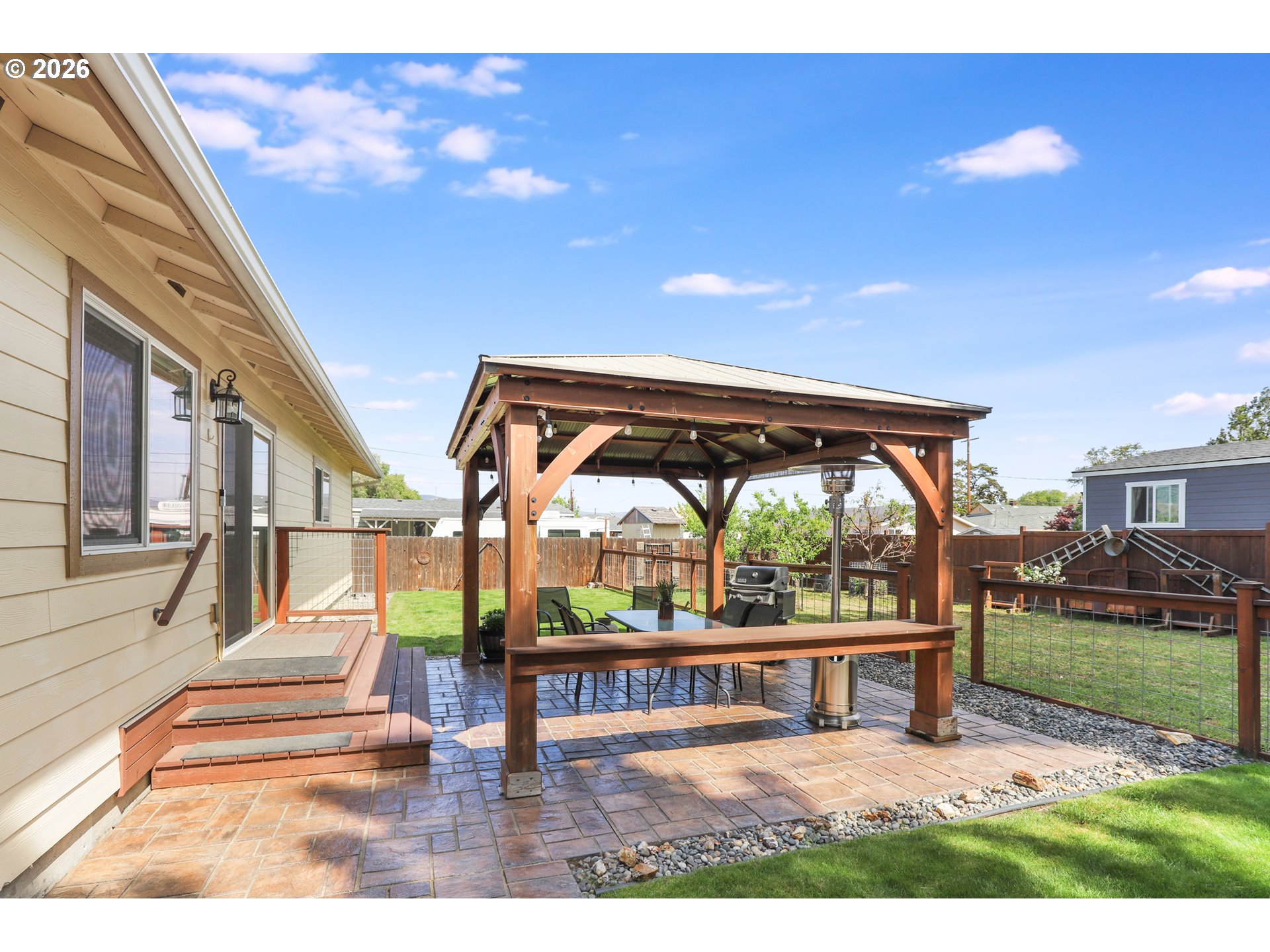 This beautifully maintained single-level home offers comfort, functionality, and thoughtful upgrades throughout. The 1,644 sq ft layout features 3 bedrooms and 2 bathrooms, all designed with ease of living in mind, including just one small step up into the home. Vaulted ceilings enhance the sense of openness and natural light, adding to the home’s inviting feel. Inside, you’ll find a semi-open floor plan with an extra-wide hallway that creates a greater sense of space and accessibility. The kitchen stands out with two-tone cabinetry, copper accents, and a decorative tin copper penny backsplash that adds warmth and character. The primary suite includes a private ensuite bath with a brand-new step-in shower, while two generously sized guest bedrooms provide flexibility for family, visitors, or a home office. At the end of the hallway, a dedicated laundry room adds everyday convenience.The oversized lot is fully fenced with wood privacy fencing, creating a peaceful outdoor retreat. The backyard is thoughtfully landscaped with a lawn bordered by river rock, a stained and stamped concrete patio and walkway, and a charming wood-framed gazebo complete with string lights and roller shades, perfect for relaxing or entertaining. A tool shed adds convenience, while a separate fenced area offers space for a dog run or garden. You’ll also enjoy the backyard orchard featuring apple, apricot, peach, and plum trees, bringing seasonal beauty and fresh fruit right to your backyard. With an attached garage and evident pride of ownership throughout, this home is a standout opportunity.