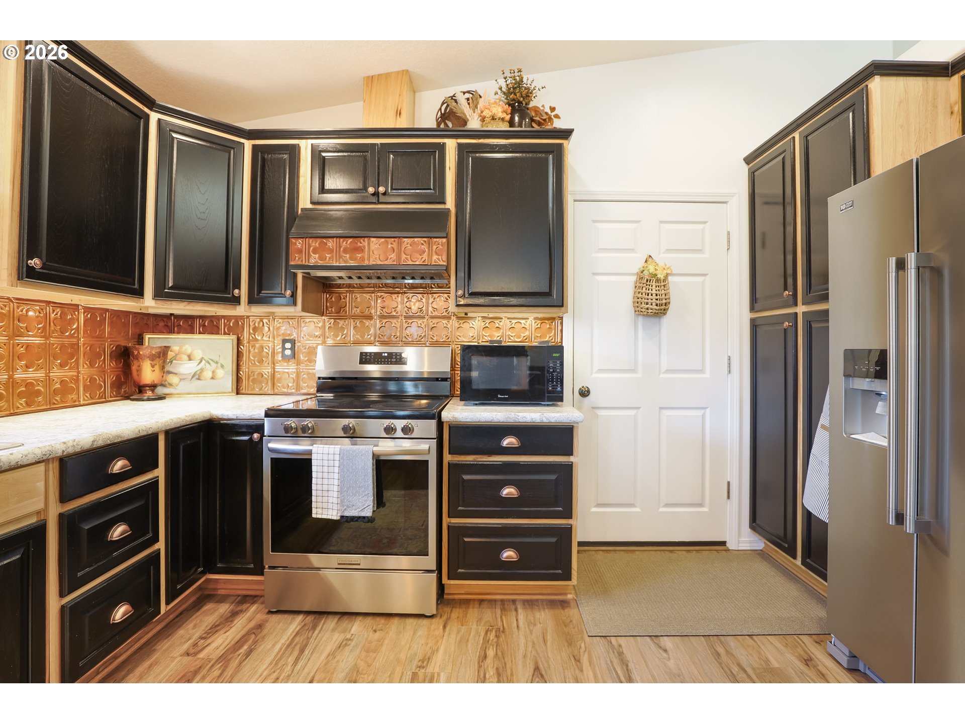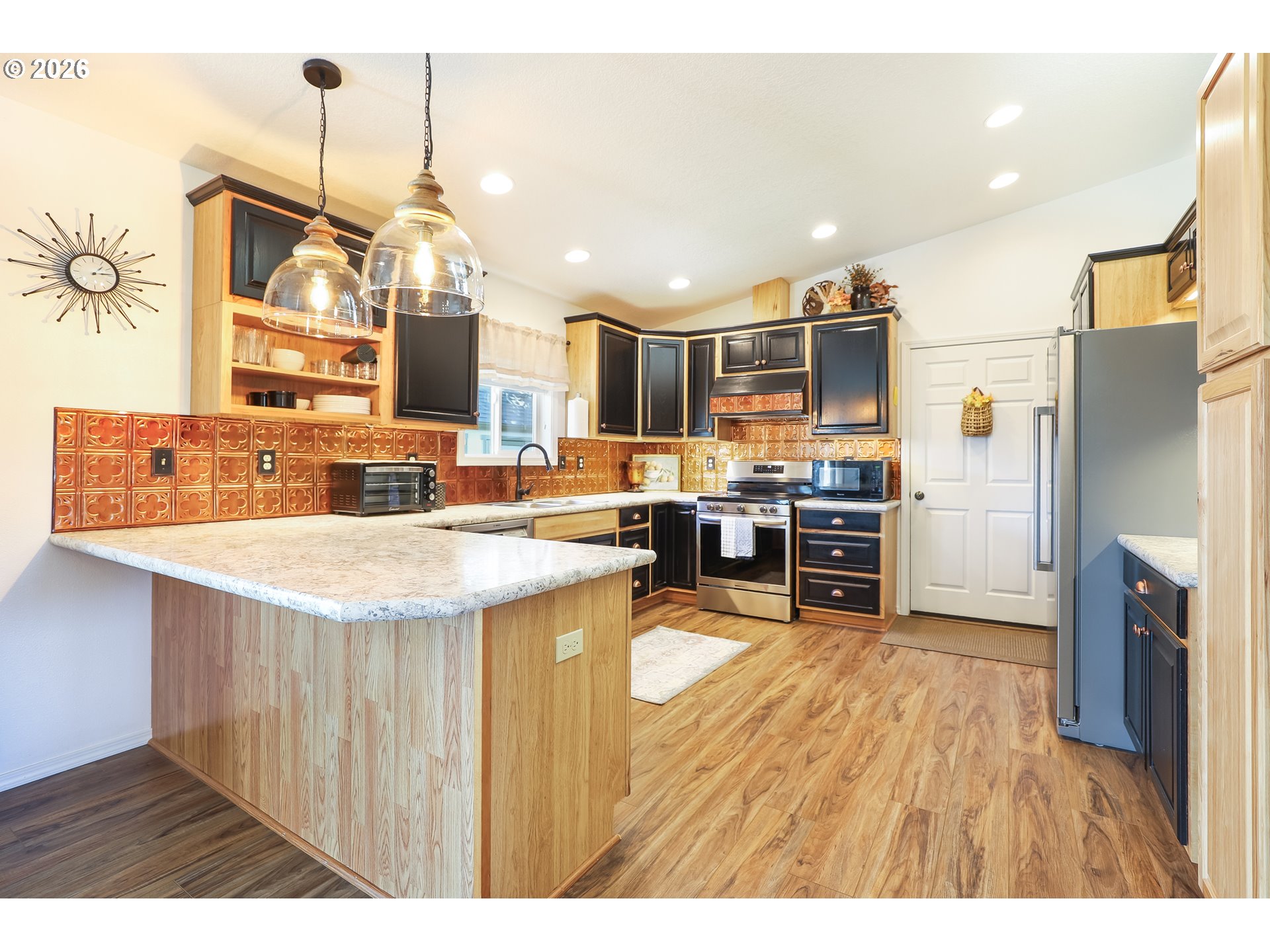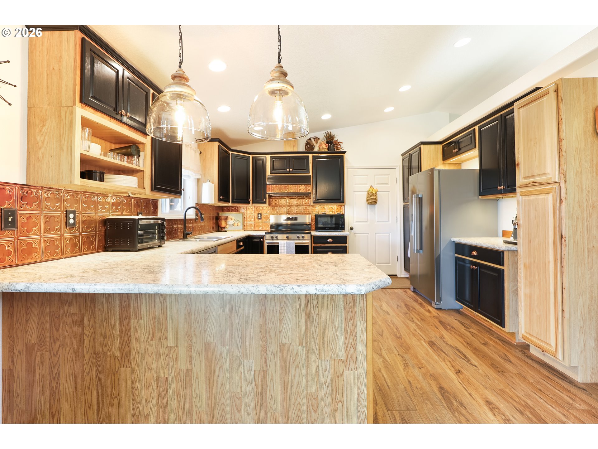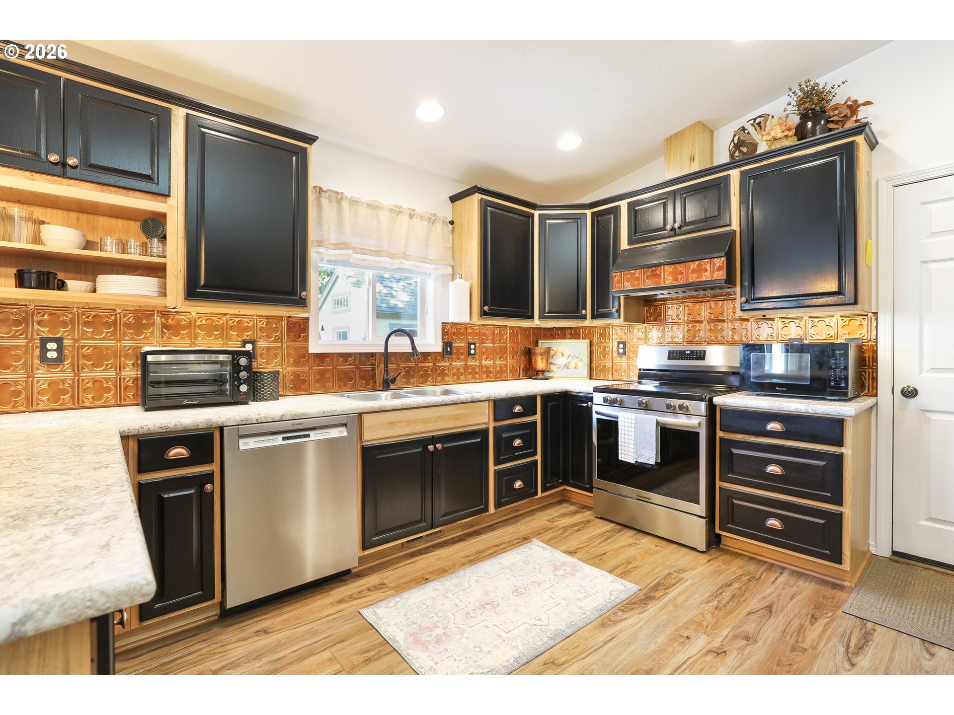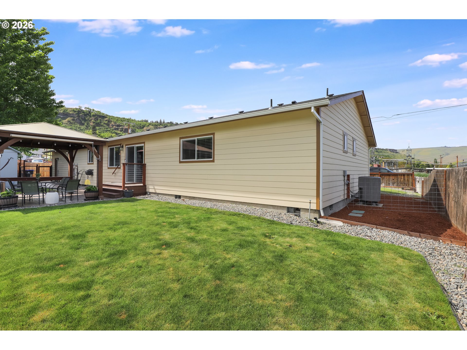 This beautifully maintained single-level home offers comfort, functionality, and thoughtful upgrades throughout. The 1,644 sq ft layout features 3 bedrooms and 2 bathrooms, all designed with ease of living in mind, including just one small step up into the home. Vaulted ceilings enhance the sense of openness and natural light, adding to the home’s inviting feel. Inside, you’ll find a semi-open floor plan with an extra-wide hallway that creates a greater sense of space and accessibility. The kitchen stands out with two-tone cabinetry, copper accents, and a decorative tin copper penny backsplash that adds warmth and character. The primary suite includes a private ensuite bath with a brand-new step-in shower, while two generously sized guest bedrooms provide flexibility for family, visitors, or a home office. At the end of the hallway, a dedicated laundry room adds everyday convenience.The oversized lot is fully fenced with wood privacy fencing, creating a peaceful outdoor retreat. The backyard is thoughtfully landscaped with a lawn bordered by river rock, a stained and stamped concrete patio and walkway, and a charming wood-framed gazebo complete with string lights and roller shades, perfect for relaxing or entertaining. A tool shed adds convenience, while a separate fenced area offers space for a dog run or garden. You’ll also enjoy the backyard orchard featuring apple, apricot, peach, and plum trees, bringing seasonal beauty and fresh fruit right to your backyard. With an attached garage and evident pride of ownership throughout, this home is a standout opportunity.