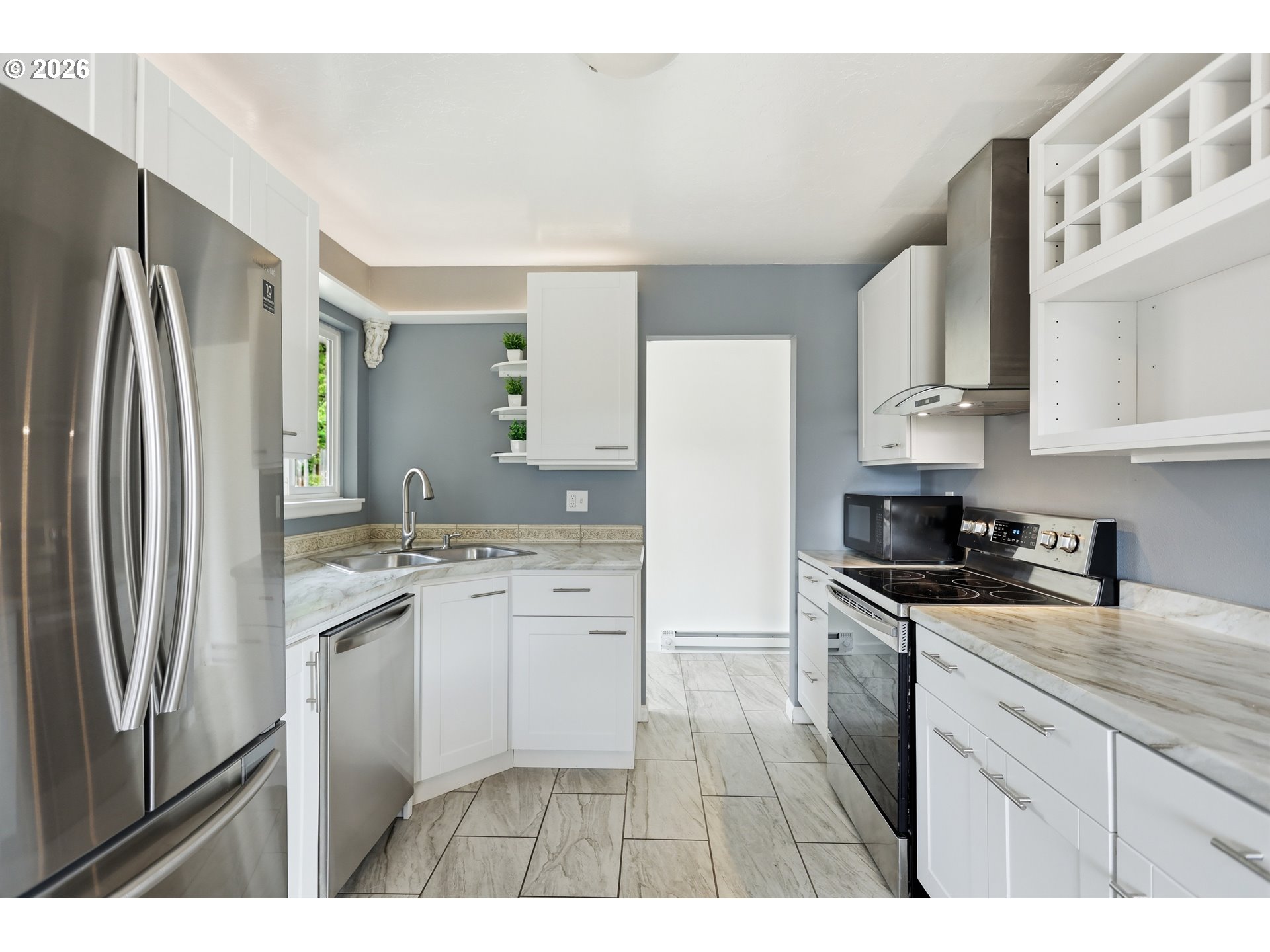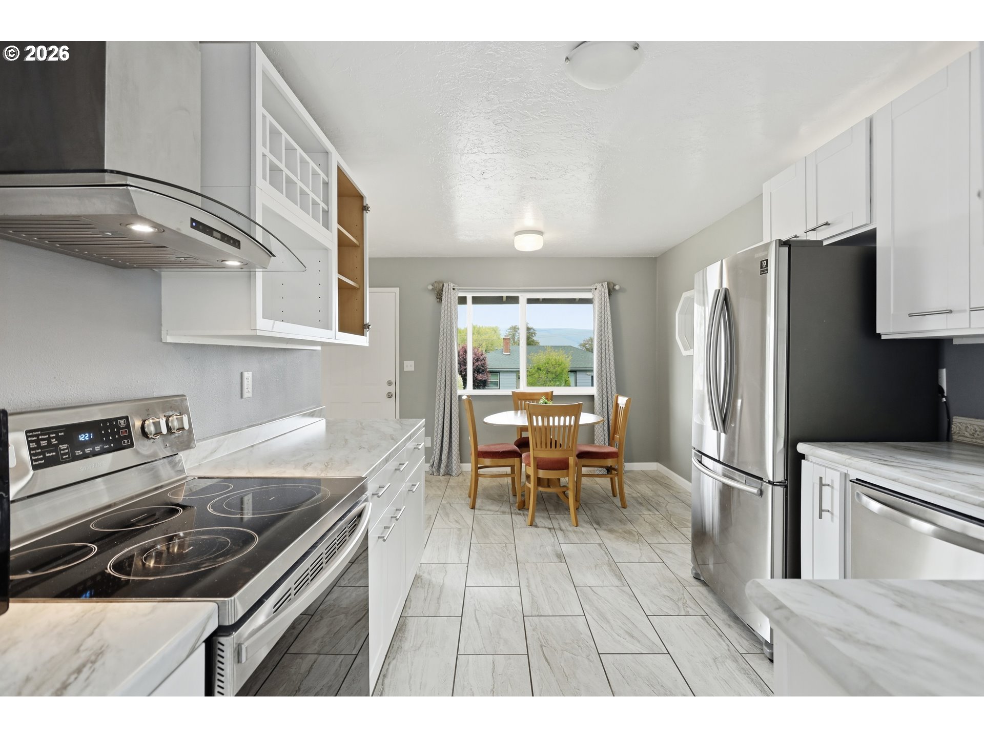 Dishwasher, FreeStandingRange, FreeStandingRefrigerator, RangeHood, StainlessSteelAppliance, Tile