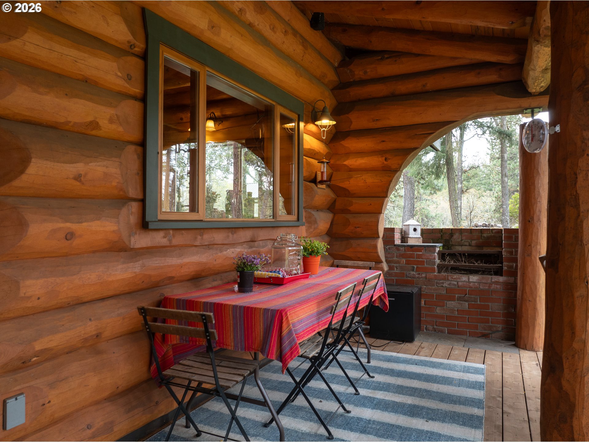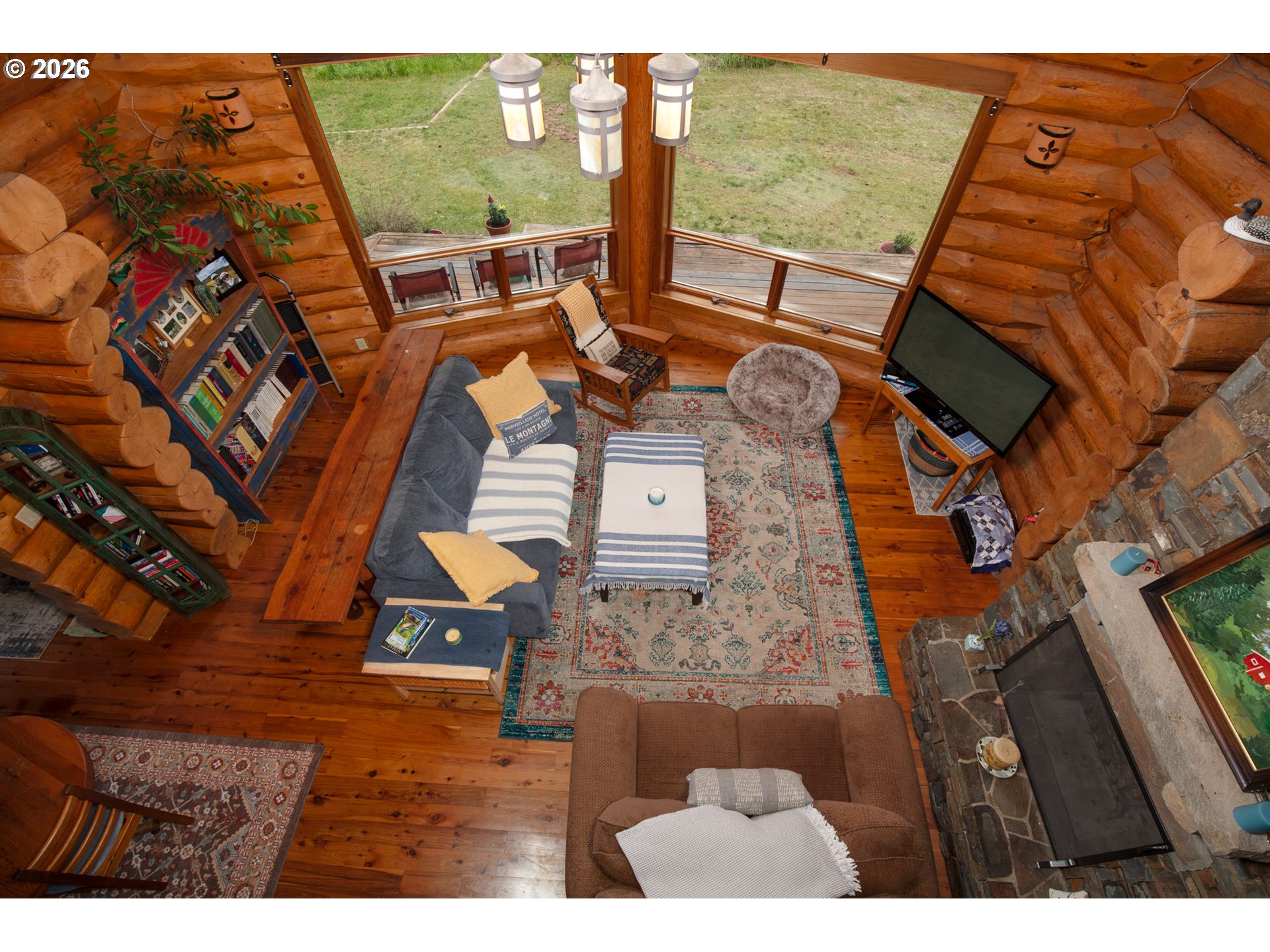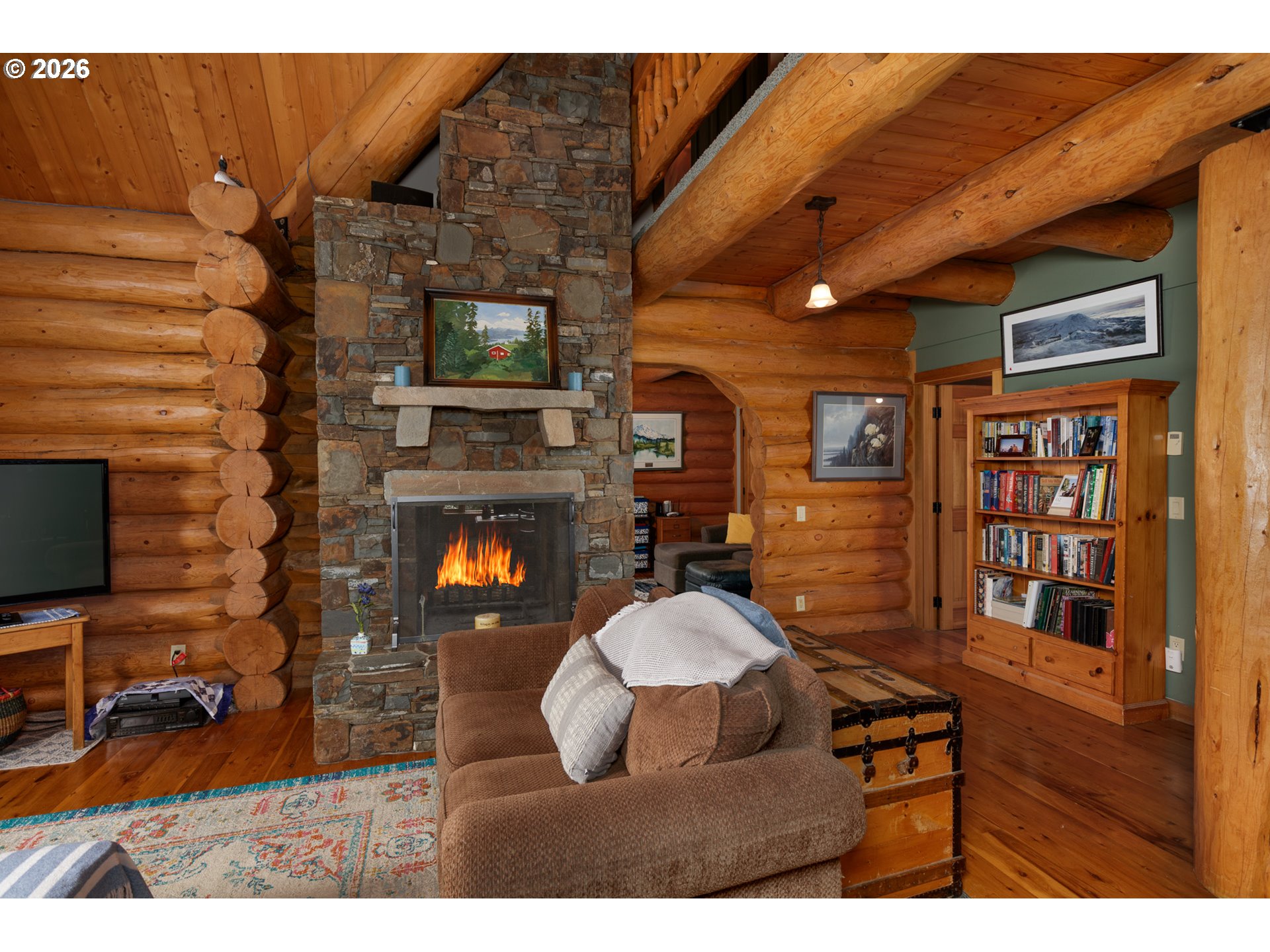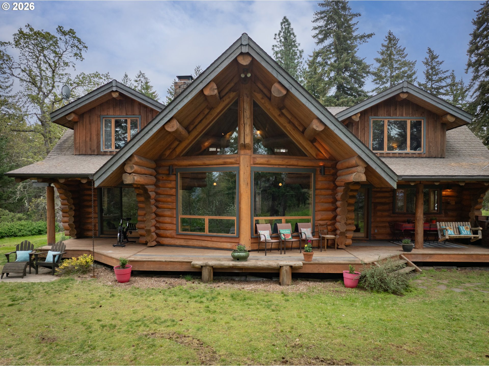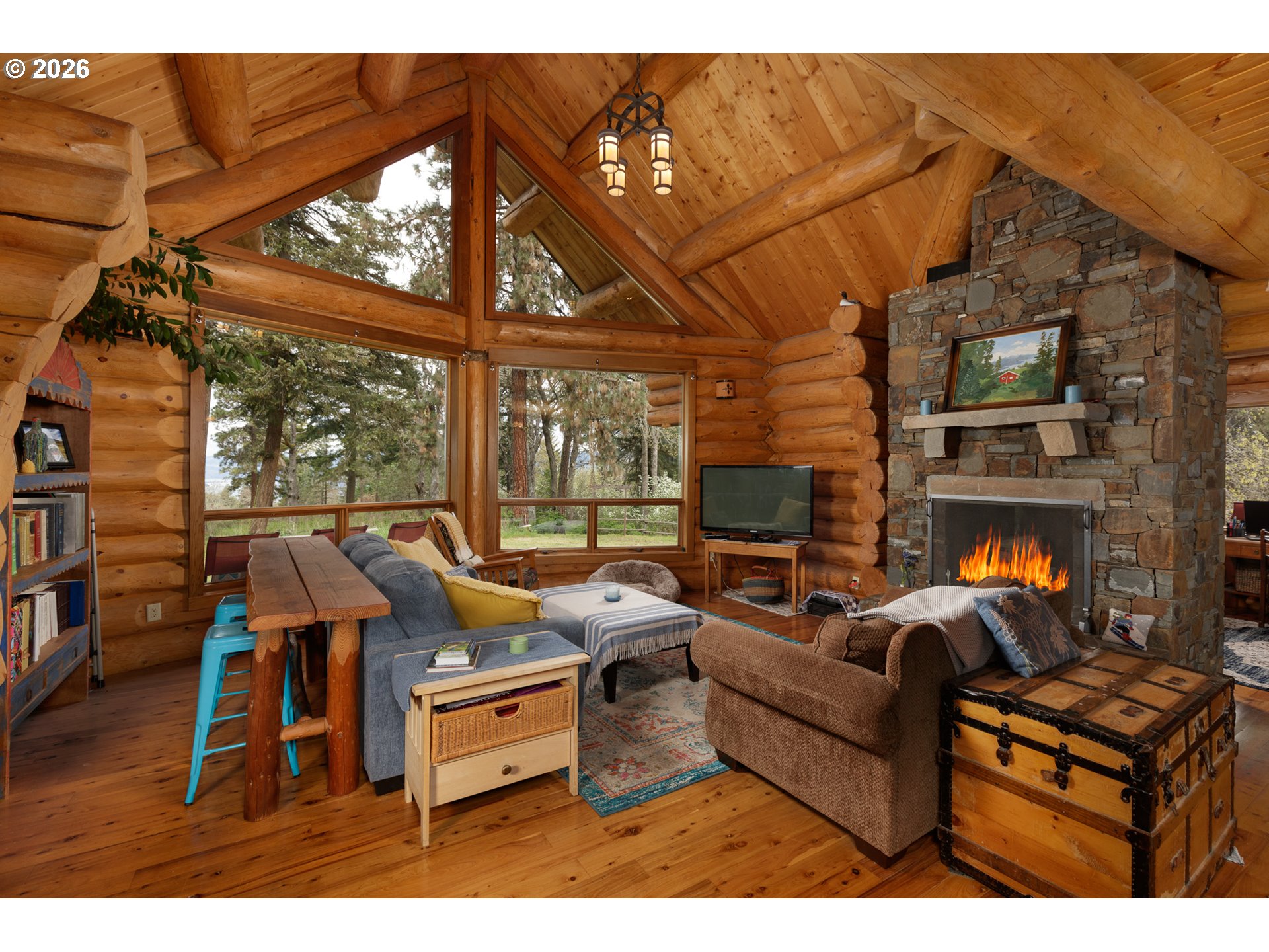 Tucked away on 5.5 peaceful acres, this custom log home is the perfect place to relax and unwind. A covered front deck runs the full length of the home—ideal for hanging out with friends and family. There’s even a built-in gas grill and dining area, making outdoor meals easy and enjoyable. You’ll also catch river and mountain views that add to the laid-back setting.Inside, the main level features beautiful Australian Cypress floors with radiant heat to keep things cozy, along with quality custom maple cabinets. The living room really stands out with its massive log beams, high vaulted ceilings, and big floor-to-ceiling windows that bring in tons of natural light. A double-sided stone fireplace, rising nearly 30 feet, adds a warm and rustic touch.The kitchen is bright and functional, with granite countertops, a gas cooktop, an eat-at island, and easy access to the deck for grilling and entertaining. The main home includes three bedrooms, two and a half bathrooms, plus a home office.Above the garage, you’ll find a separate guest space (about 900 sq ft), perfect for visitors or extra living flexibility. There’s also room to open up even bigger river and mountain views with some selective tree trimming. The seller has taken steps toward fire safety by working with the fire marshal and removing several large trees.All of this is just minutes from downtown Mosier, with quick access to hiking and biking trails, local wineries, and everything the Columbia Gorge has to offer.