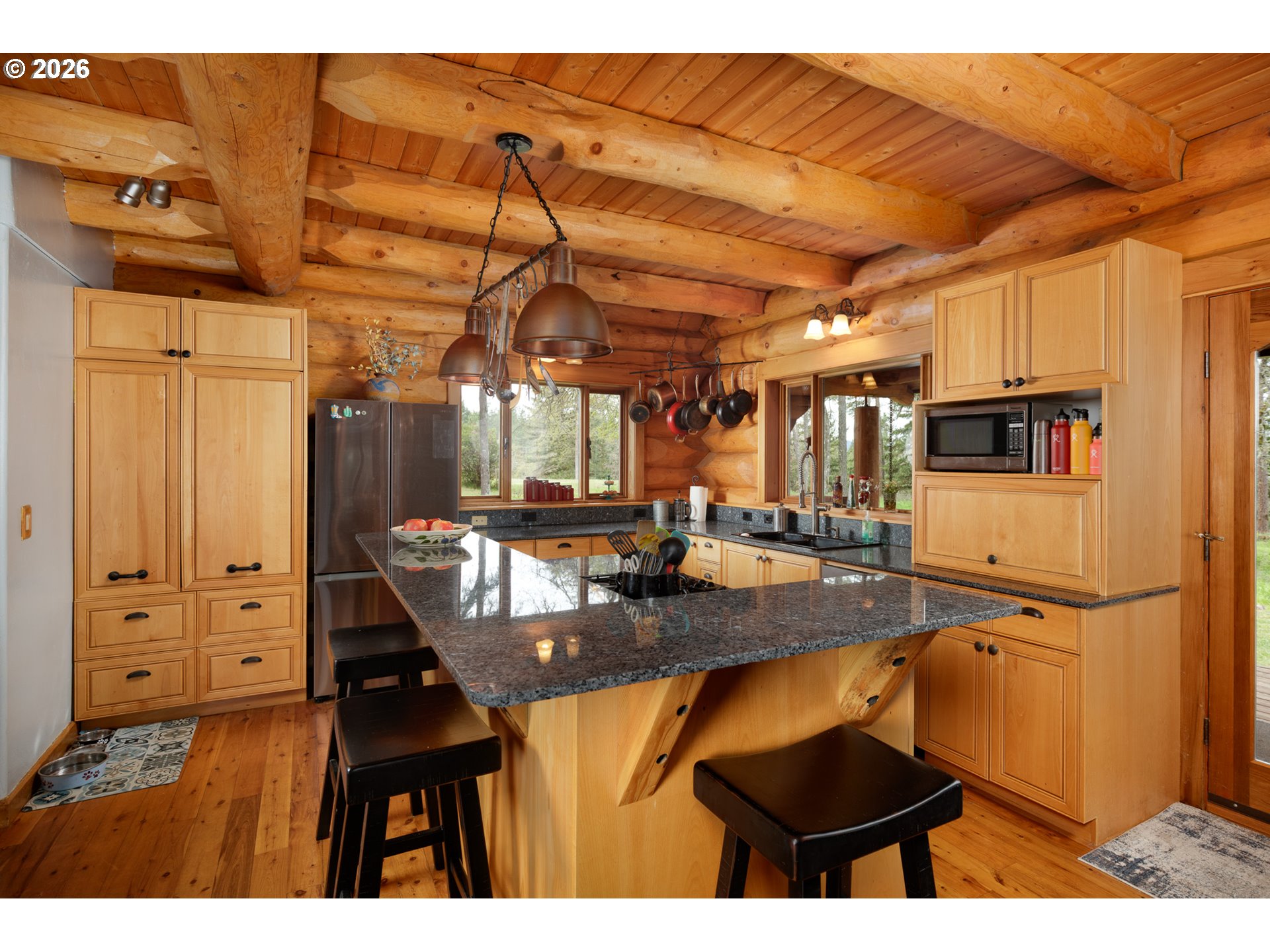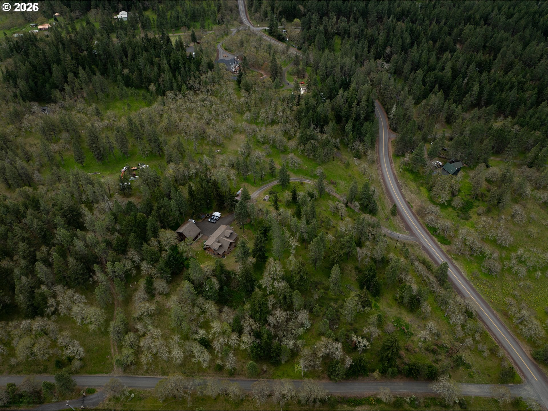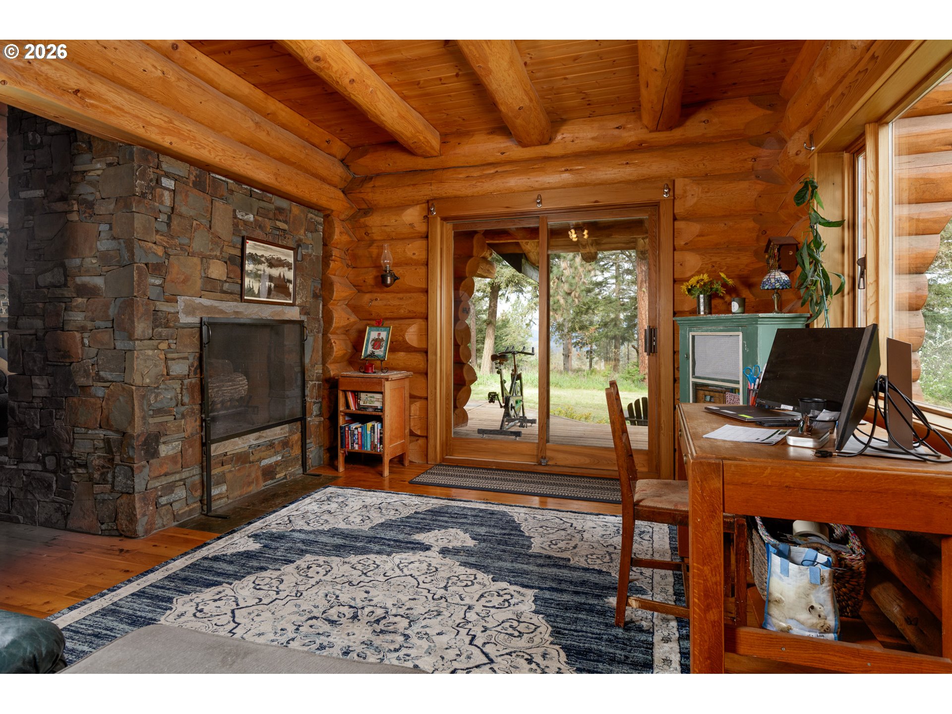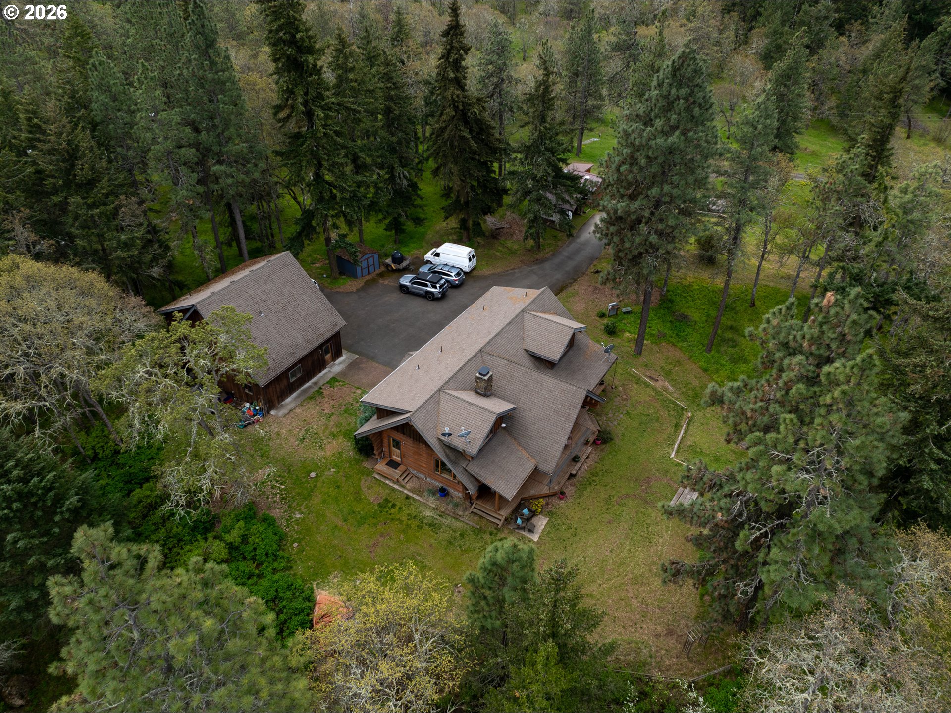 Tucked away on 5.5 peaceful acres, this custom log home is the perfect place to relax and unwind. A covered front deck runs the full length of the home—ideal for hanging out with friends and family. There’s even a built-in gas grill and dining area, making outdoor meals easy and enjoyable. You’ll also catch river and mountain views that add to the laid-back setting.Inside, the main level features beautiful Australian Cypress floors with radiant heat to keep things cozy, along with quality custom maple cabinets. The living room really stands out with its massive log beams, high vaulted ceilings, and big floor-to-ceiling windows that bring in tons of natural light. A double-sided stone fireplace, rising nearly 30 feet, adds a warm and rustic touch.The kitchen is bright and functional, with granite countertops, a gas cooktop, an eat-at island, and easy access to the deck for grilling and entertaining. The main home includes three bedrooms, two and a half bathrooms, plus a home office.Above the garage, you’ll find a separate guest space (about 900 sq ft), perfect for visitors or extra living flexibility. There’s also room to open up even bigger river and mountain views with some selective tree trimming. The seller has taken steps toward fire safety by working with the fire marshal and removing several large trees.All of this is just minutes from downtown Mosier, with quick access to hiking and biking trails, local wineries, and everything the Columbia Gorge has to offer.