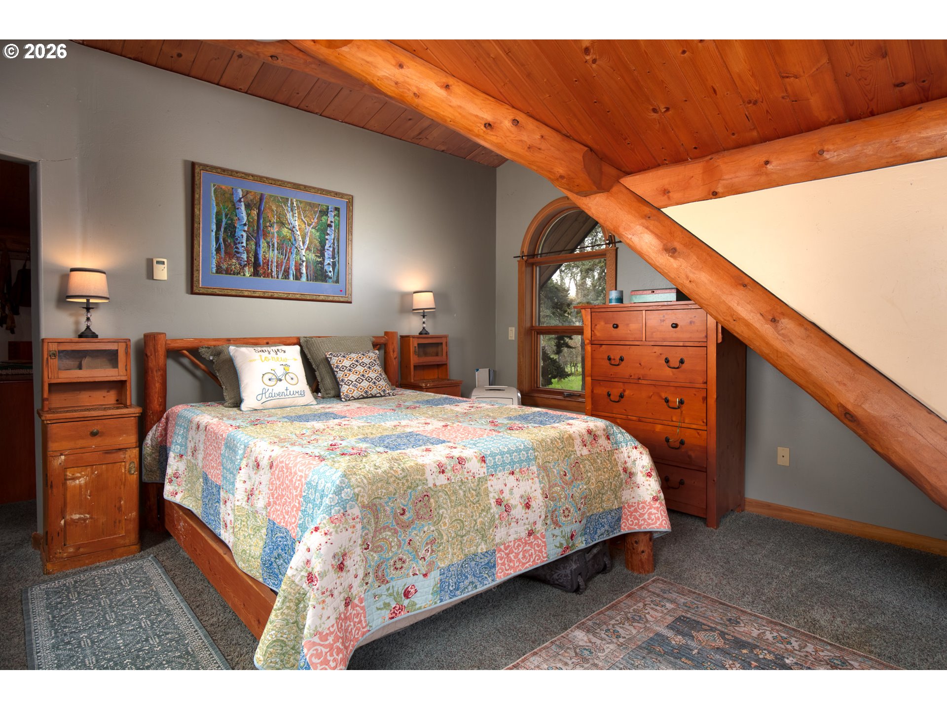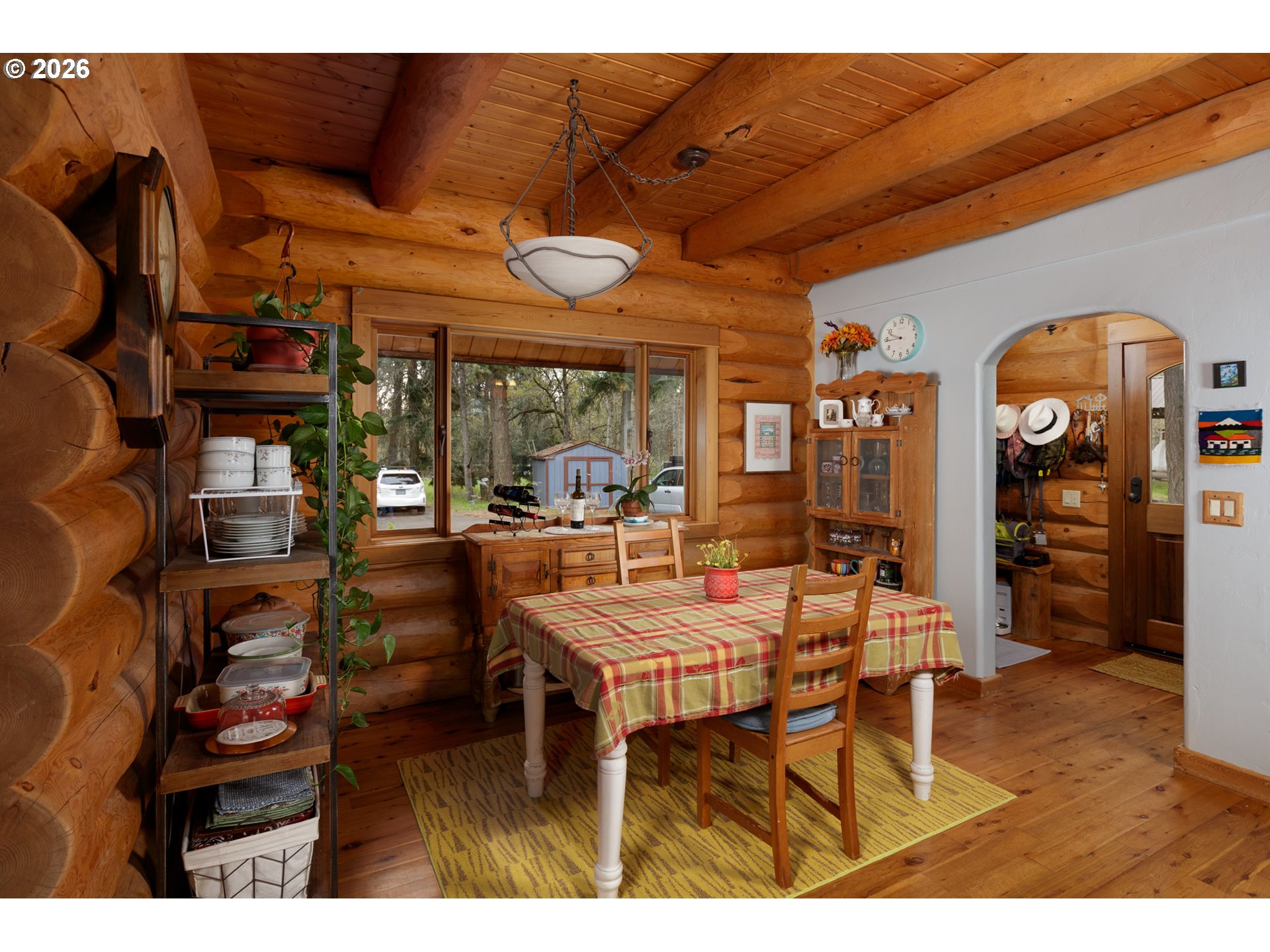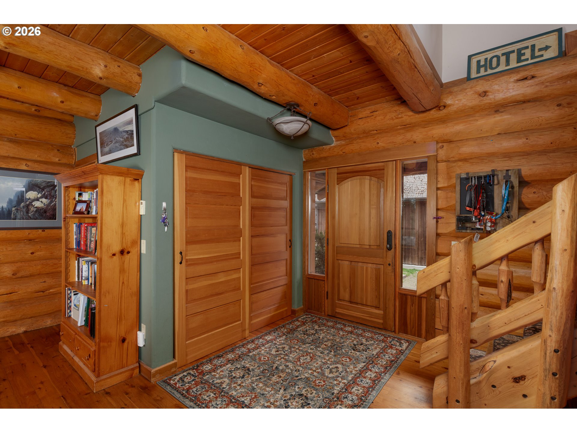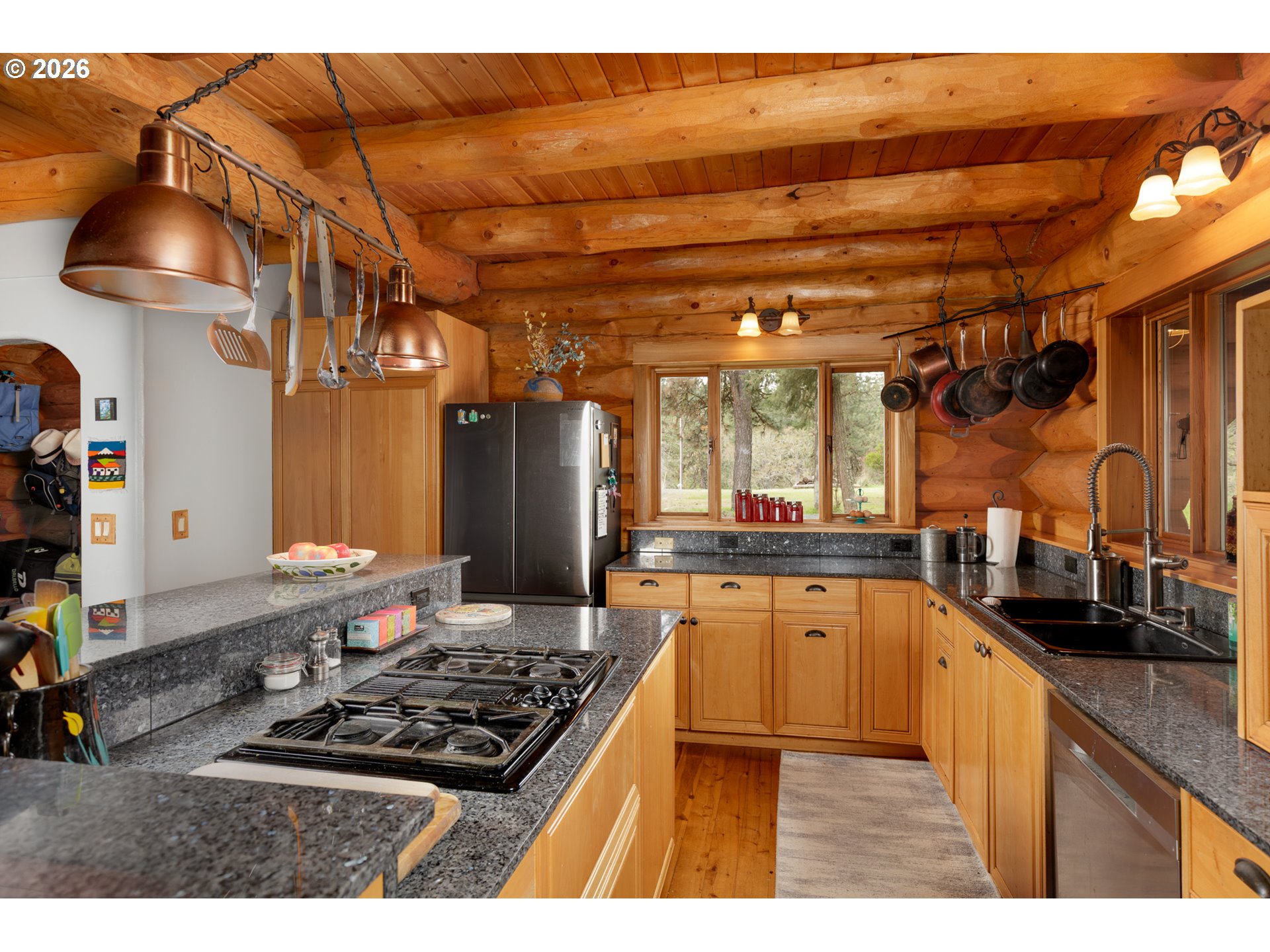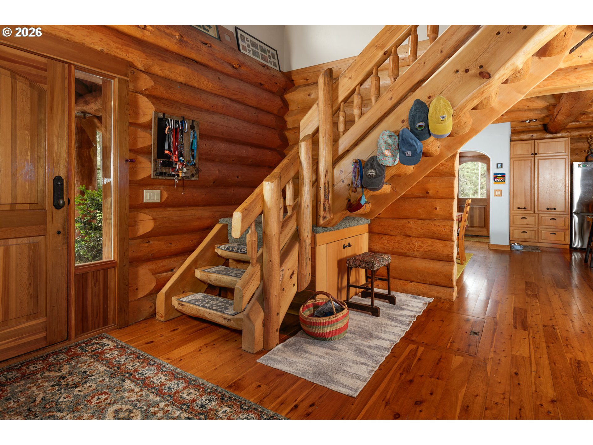 Tucked away on 5.5 peaceful acres, this custom log home is the perfect place to relax and unwind. A covered front deck runs the full length of the home—ideal for hanging out with friends and family. There’s even a built-in gas grill and dining area, making outdoor meals easy and enjoyable. You’ll also catch river and mountain views that add to the laid-back setting.Inside, the main level features beautiful Australian Cypress floors with radiant heat to keep things cozy, along with quality custom maple cabinets. The living room really stands out with its massive log beams, high vaulted ceilings, and big floor-to-ceiling windows that bring in tons of natural light. A double-sided stone fireplace, rising nearly 30 feet, adds a warm and rustic touch.The kitchen is bright and functional, with granite countertops, a gas cooktop, an eat-at island, and easy access to the deck for grilling and entertaining. The main home includes three bedrooms, two and a half bathrooms, plus a home office.Above the garage, you’ll find a separate guest space (about 900 sq ft), perfect for visitors or extra living flexibility. There’s also room to open up even bigger river and mountain views with some selective tree trimming. The seller has taken steps toward fire safety by working with the fire marshal and removing several large trees.All of this is just minutes from downtown Mosier, with quick access to hiking and biking trails, local wineries, and everything the Columbia Gorge has to offer.