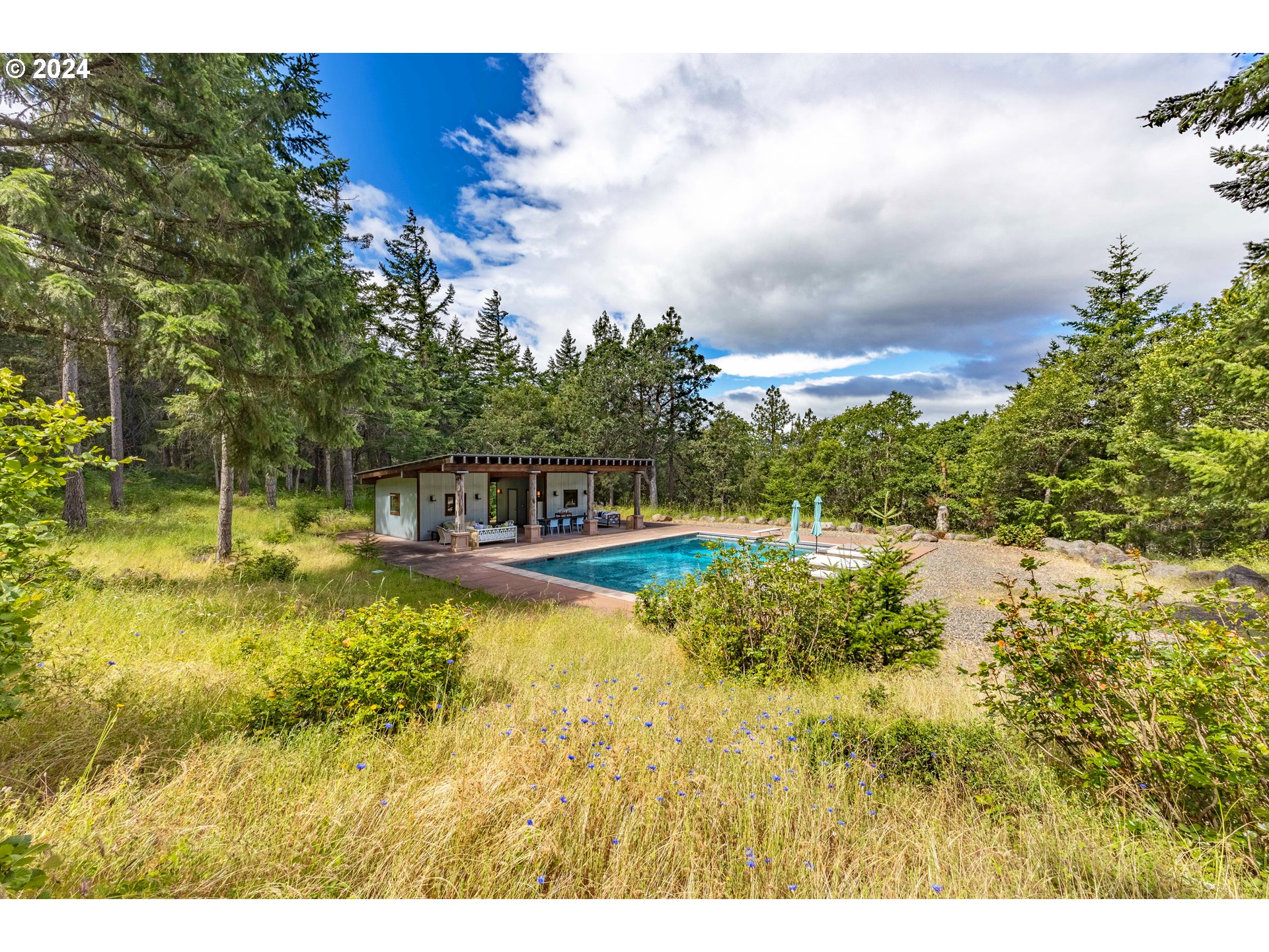 Embrace effortless outdoor living this summer in your own private Mosier retreat. Set on ~15 acres of peaceful, scenic land, this property invites you to slow down and soak in the beauty of the Columbia River Gorge. Spend your days poolside beside the heated, in-ground saltwater pool, surrounded by lush nature. The custom 384 square foot, 1-bedroom, 1-bath pool house offers a comfortable and functional space, complete with a kitchen and laundry. Perfect for weekend stays, guests, or a simple lifestyle. The property is already equipped with power and water, making it ready for your future vision. A thoughtfully positioned building site is framed by trees and captures views of the Columbia River, stretching all the way to the Hood River Bridge. Whether you choose to enjoy it as is or build your dream home, this is your opportunity to own a truly rare and unique property in the heart of the Columbia Gorge.