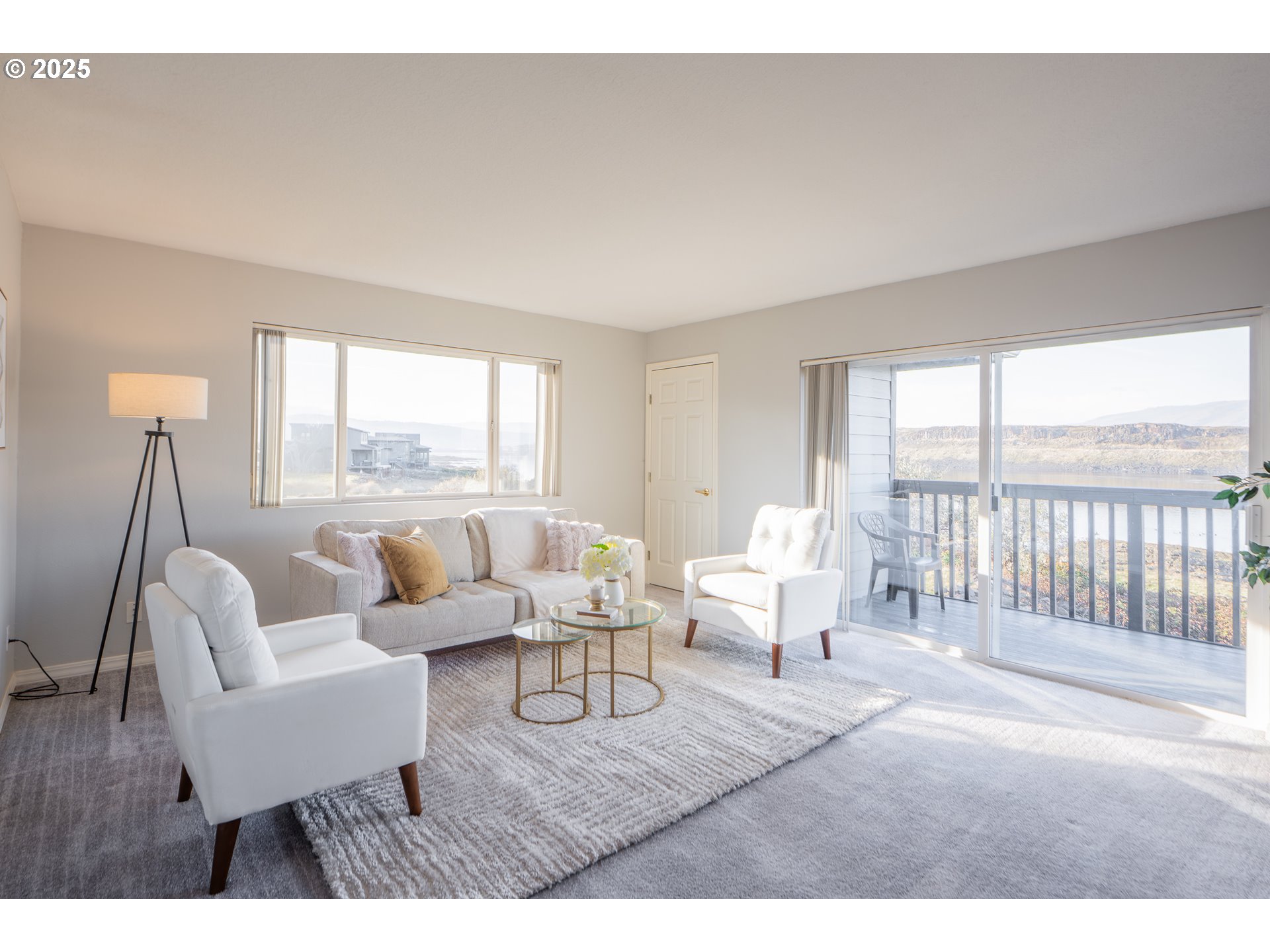 Experience panoramic, unobstructed views of the Columbia River and The Dalles Bridge from this rare end-unit 2 bedroom, 2 bathroom condo in The Dalles, OR. Situated on the desirable second floor with no neighbors to the west, this home is filled with abundant natural light and offers stunning sunsets down the Gorge. The spacious primary bedroom features its own en-suite bathroom and a generous walk-in closet. The open living and dining areas are bright and inviting—perfect for relaxing or entertaining with a view. Clean, move-in ready, and designed for low-maintenance living, this condo is ideal for those seeking comfort and convenience. Located in a sought-after neighborhood close to Adventist Health at Waters Edge, coffee shops, and a nearby winery, you’ll enjoy easy access to everyday amenities. A detached single-car garage, a dedicated parking space, and ample visitor parking ensure plenty of room for guests. The water heater was replaced in 2025, offering added peace of mind. Don’t miss this opportunity to own a beautifully maintained home with some of the best views The Dalles has to offer. Seller is related to listing agent.