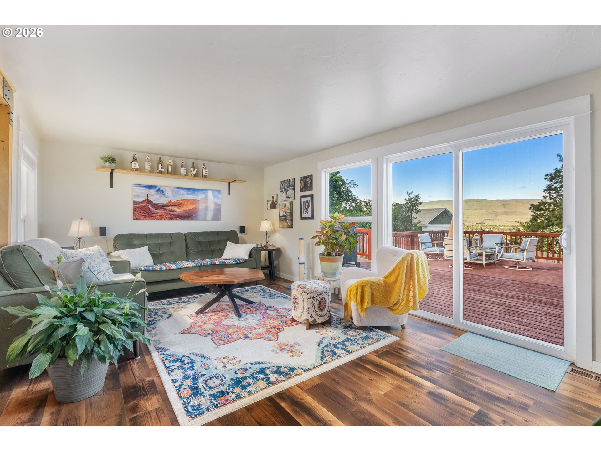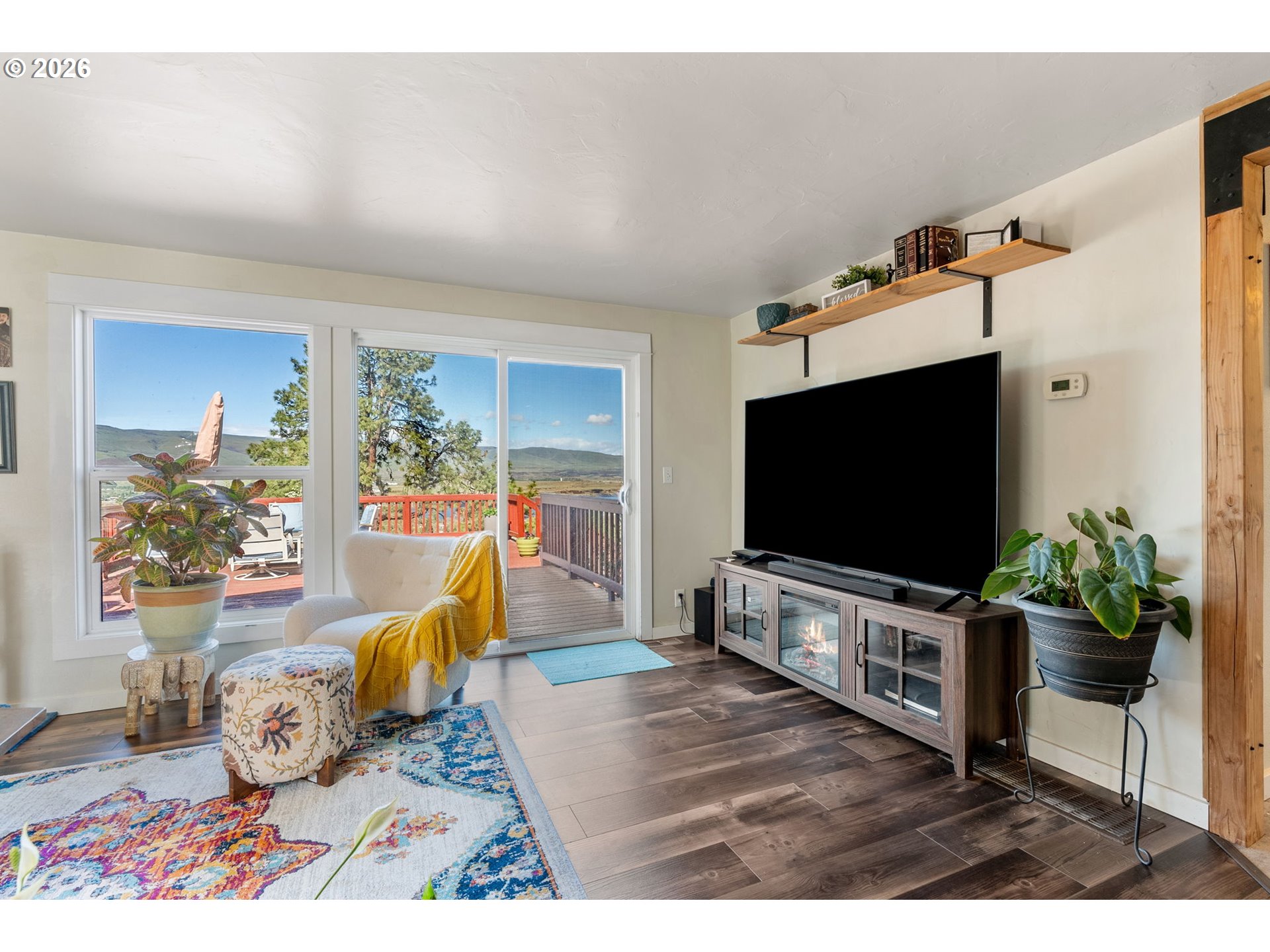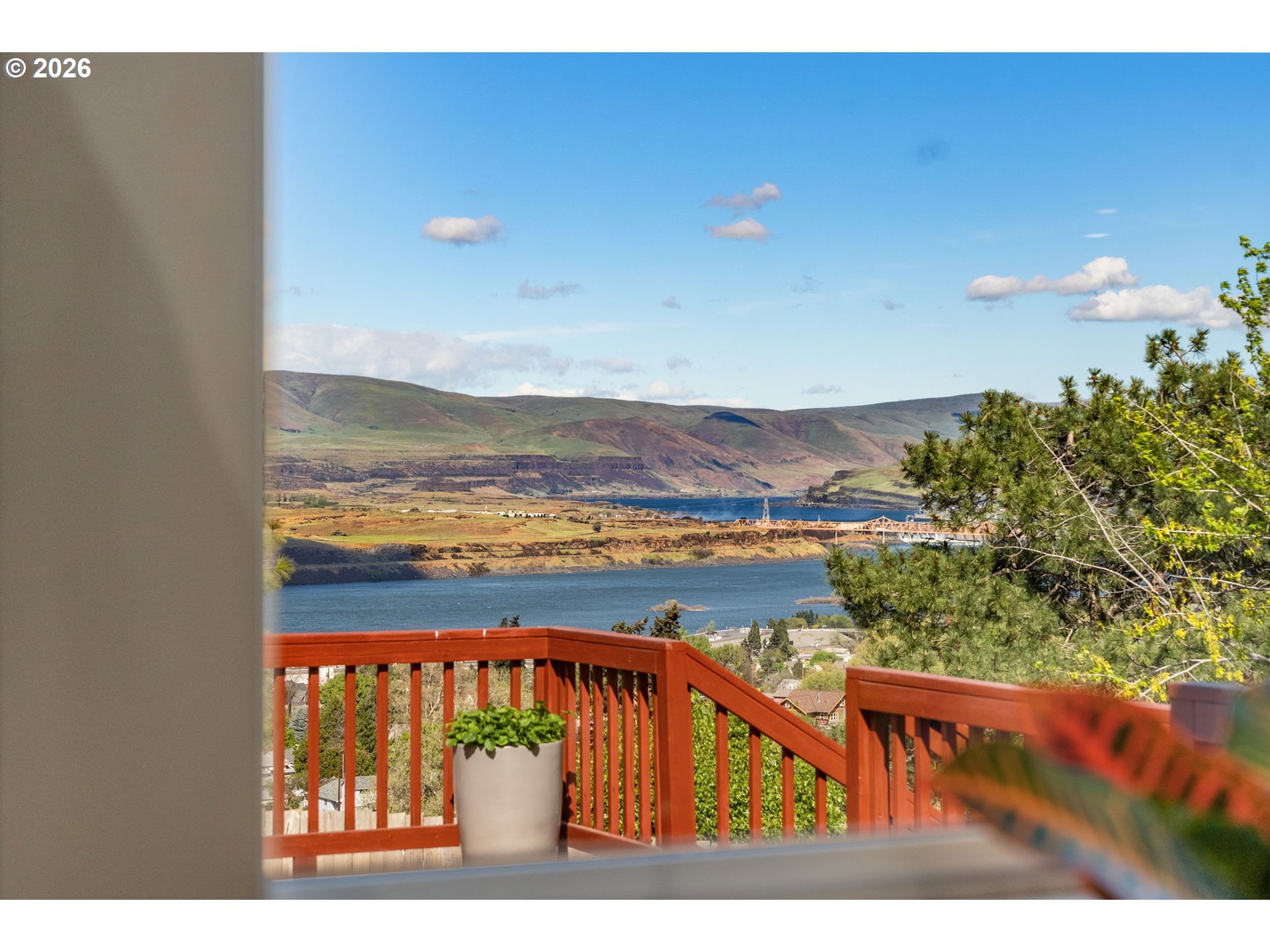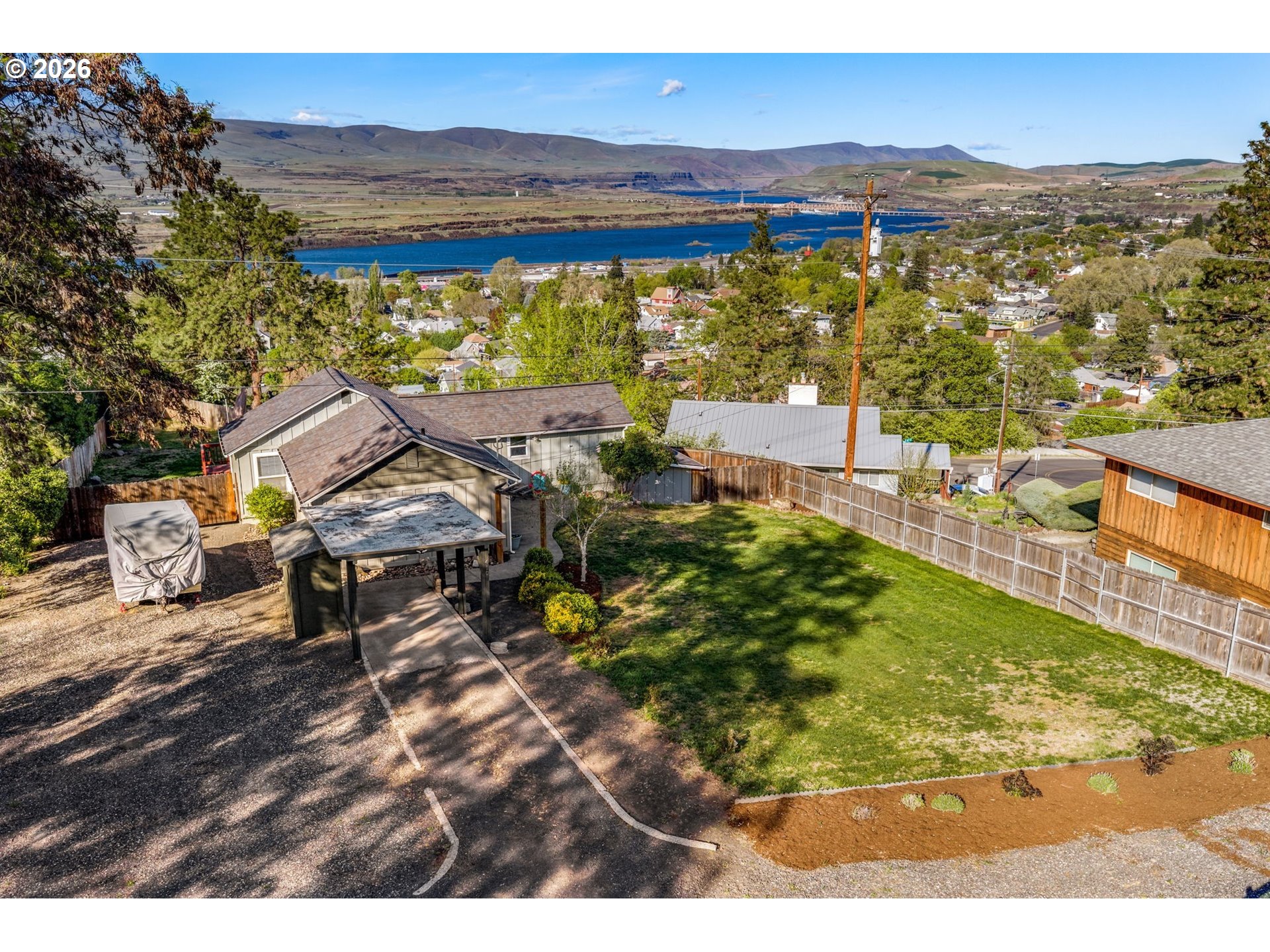 Big views, major upgrades, and flexible living space—this one delivers. This 3 bedroom, 2 bath single level home captures sweeping views of the Columbia River, The Dalles Dam, and The Dalles Bridge, creating a backdrop that’s hard to beat. Inside, the home has been thoughtfully refreshed with brand new flooring throughout, updated kitchen surfaces and sink, and fresh interior paint, all coming together in a clean, modern feel. A new roof installed in 2024 adds peace of mind, while the heat pump (2021), water heater, and recently serviced furnace provide added efficiency and comfort. The layout is comfortable and functional, with easy access to the deck and backyard for everyday living or entertaining. A separate daylight room with its own entrance, heating, and cooling offers ideal flexibility for a home office, gym, guest space, or creative studio. Outside, the oversized lot provides room to spread out with covered parking, additional storage, a large attached shed, fenced yard space, and ample graveled parking for RVs, boats, or extra vehicles. Tucked near the end of a quiet street with minimal traffic, this property combines views, updates, and usable space in a way that’s hard to find—move-in ready and built for real life.