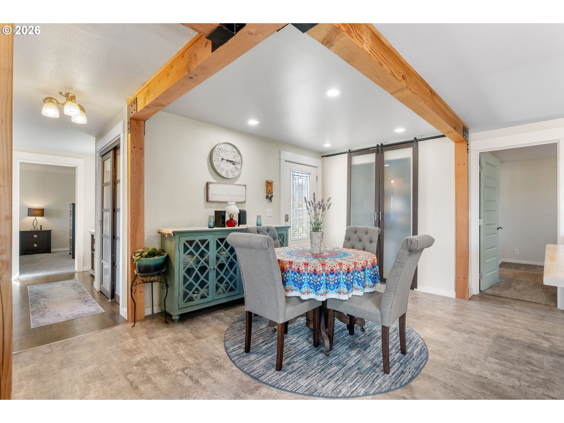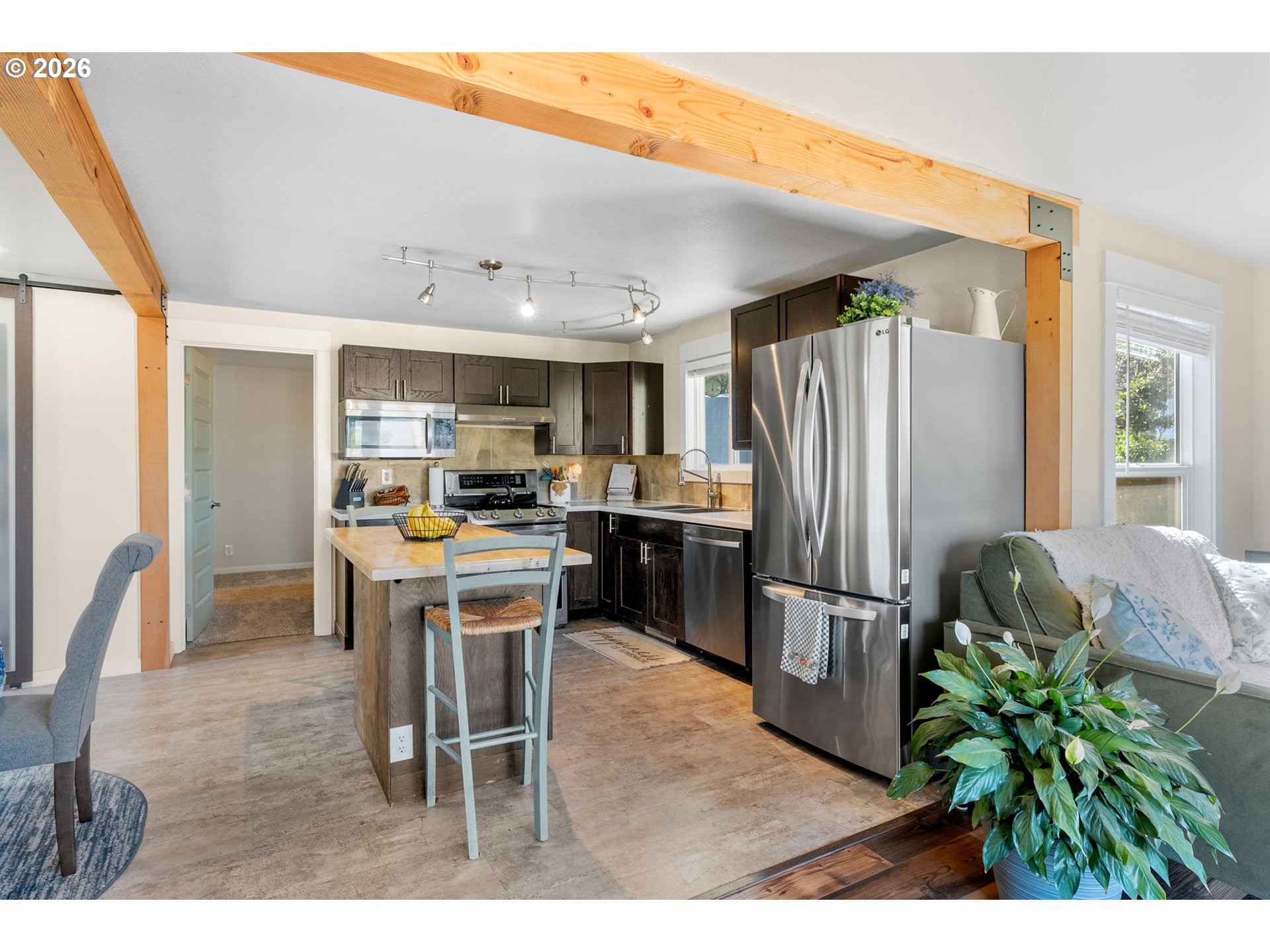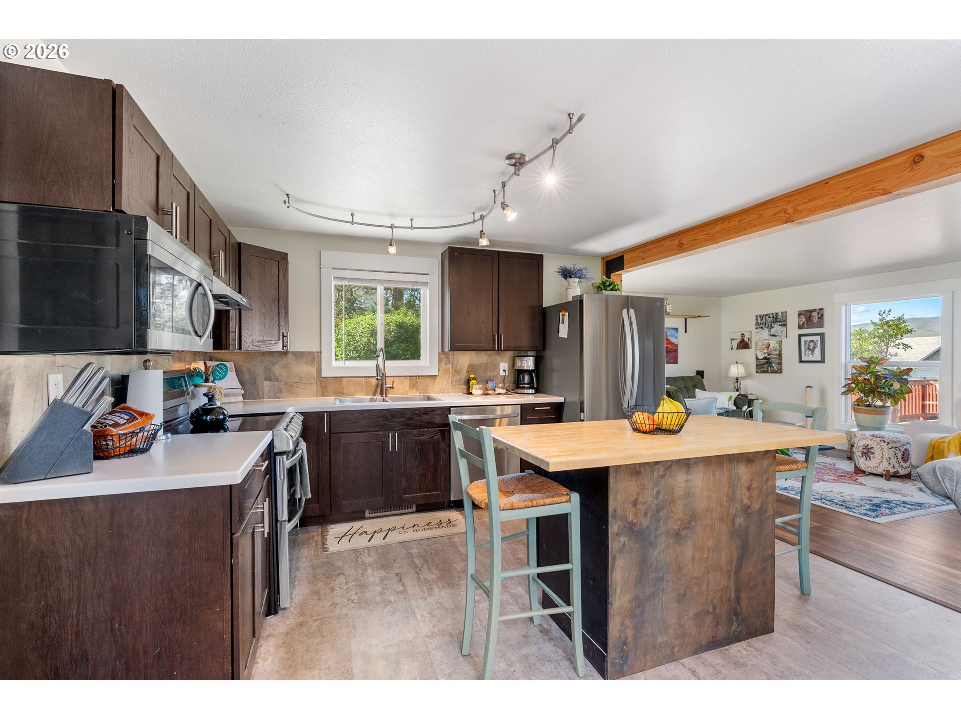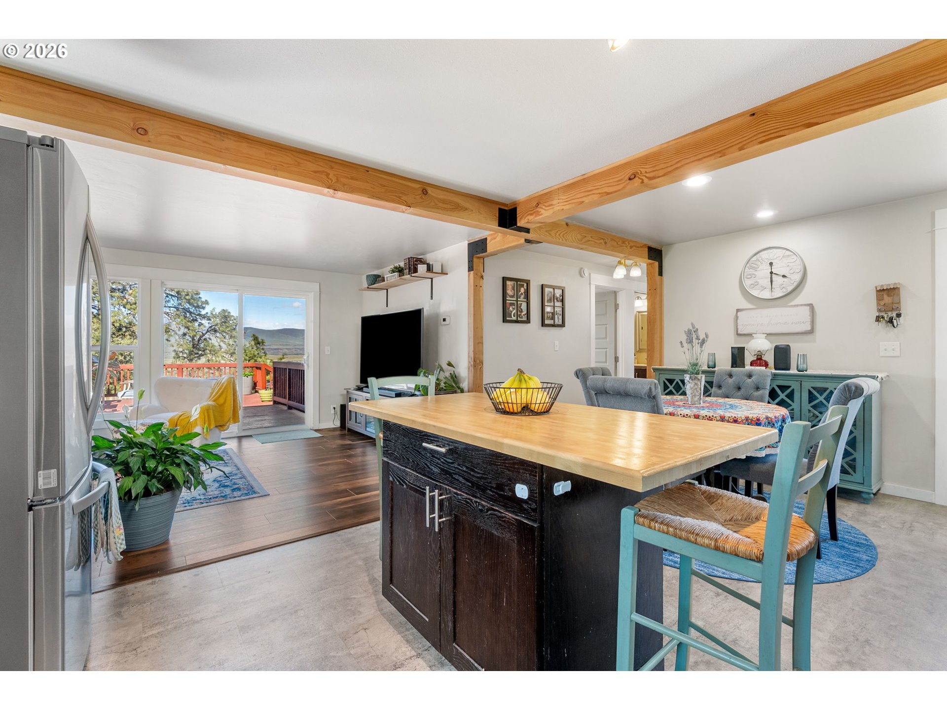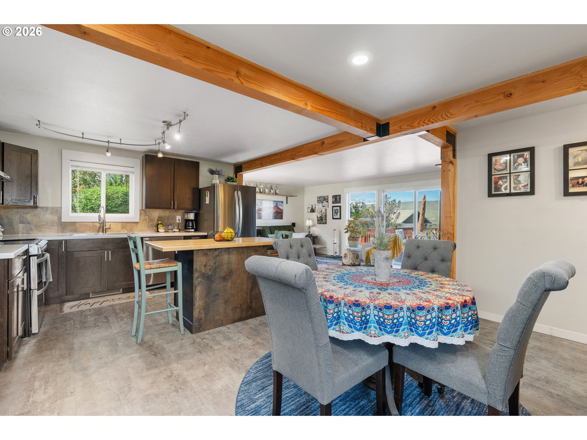 Big views, major upgrades, and flexible living space—this one delivers. This 3 bedroom, 2 bath single level home captures sweeping views of the Columbia River, The Dalles Dam, and The Dalles Bridge, creating a backdrop that’s hard to beat. Inside, the home has been thoughtfully refreshed with brand new flooring throughout, updated kitchen surfaces and sink, and fresh interior paint, all coming together in a clean, modern feel. A new roof installed in 2024 adds peace of mind, while the heat pump (2021), water heater, and recently serviced furnace provide added efficiency and comfort. The layout is comfortable and functional, with easy access to the deck and backyard for everyday living or entertaining. A separate daylight room with its own entrance, heating, and cooling offers ideal flexibility for a home office, gym, guest space, or creative studio. Outside, the oversized lot provides room to spread out with covered parking, additional storage, a large attached shed, fenced yard space, and ample graveled parking for RVs, boats, or extra vehicles. Tucked near the end of a quiet street with minimal traffic, this property combines views, updates, and usable space in a way that’s hard to find—move-in ready and built for real life.