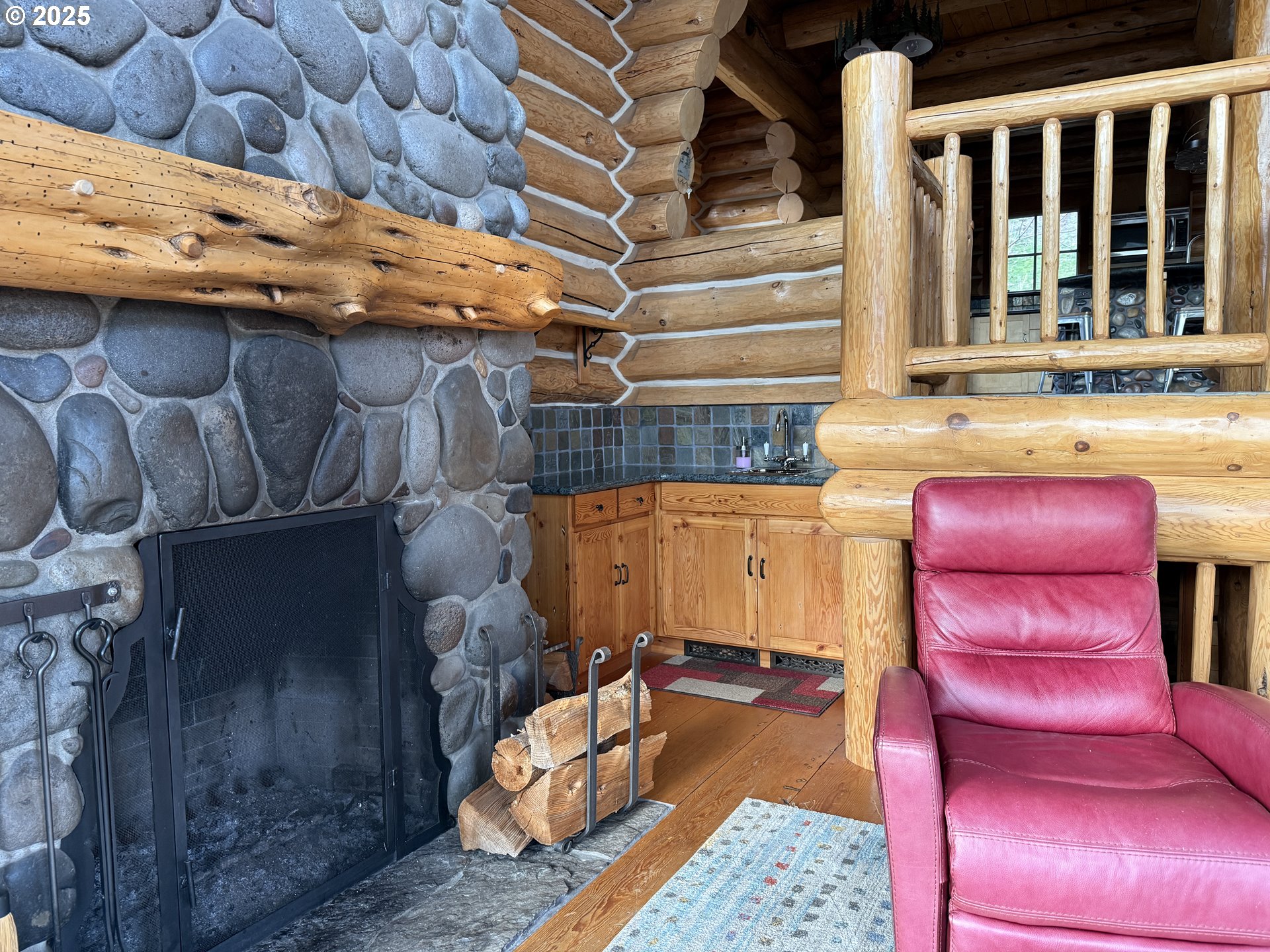 This fabulous home is perched above the Deschutes River, affording views up and down stream. Walk to restaurants or sit and watch the river action from the large front deck. The back patio is set up for outdoor cooking with a built-in bbq. The home sleeps 6 comfortably, has 3 bedrooms, 2 full baths, features a fully equipped kitchen and a wet bar, washer/dryer, internet, sunny decks overlooking the river, and has plenty of on-site parking. The Deschutes boasts world-class river rafting and fly fishing. Other attractions are hiking, bird-watching, hunting, snow and water skiing, etc. In Maupin there are several restaurants, two city parks, downtown stores, and an osprey nest visible across the river from the log home. The home uses all natural materials: Deschutes river rock, and beetle-kill pine logs harvested, peeled and assembled locally. The largely open interior consists of several levels unified by a central log stair, creating a ‘tree house of lofts.'