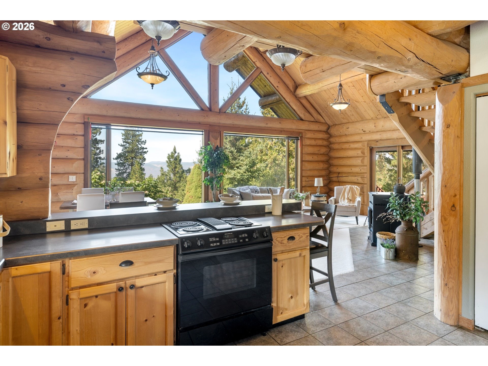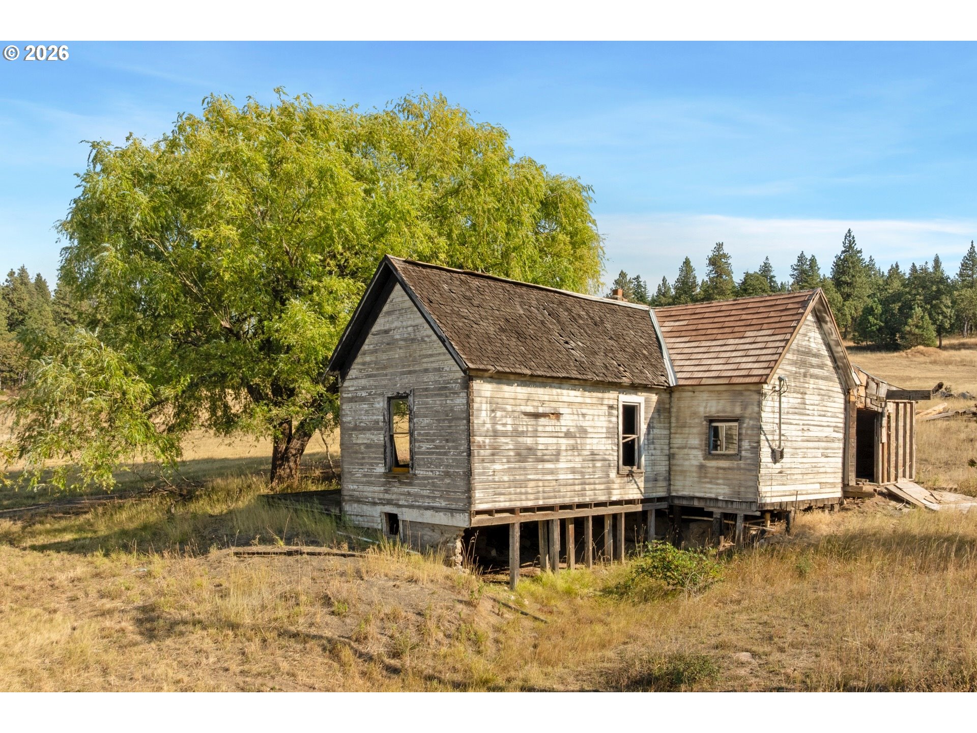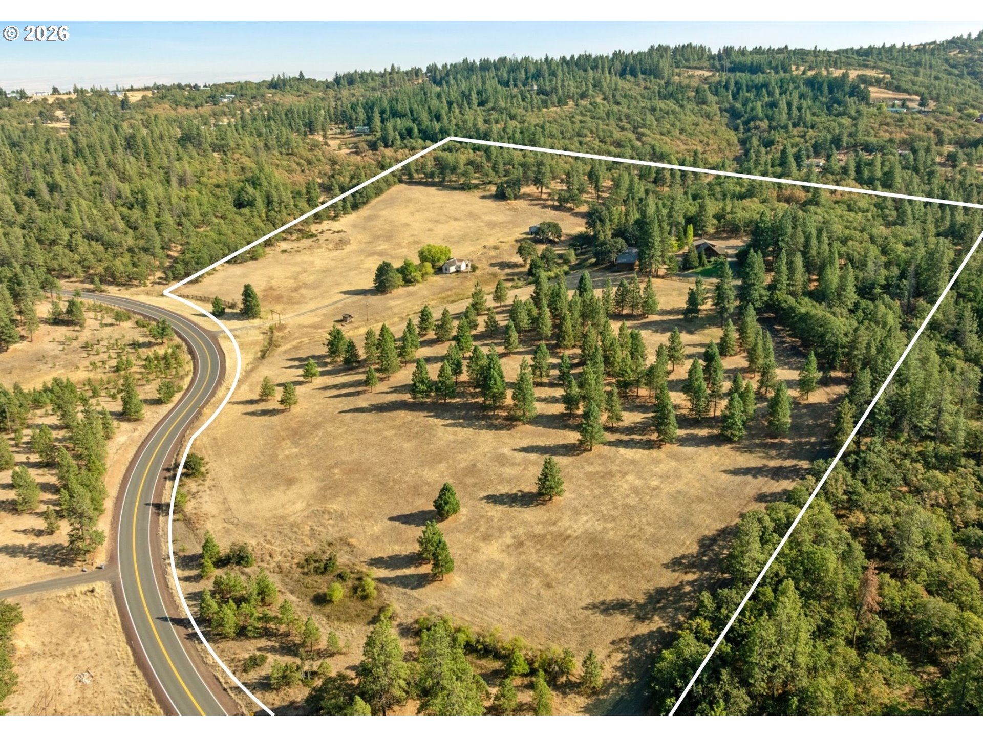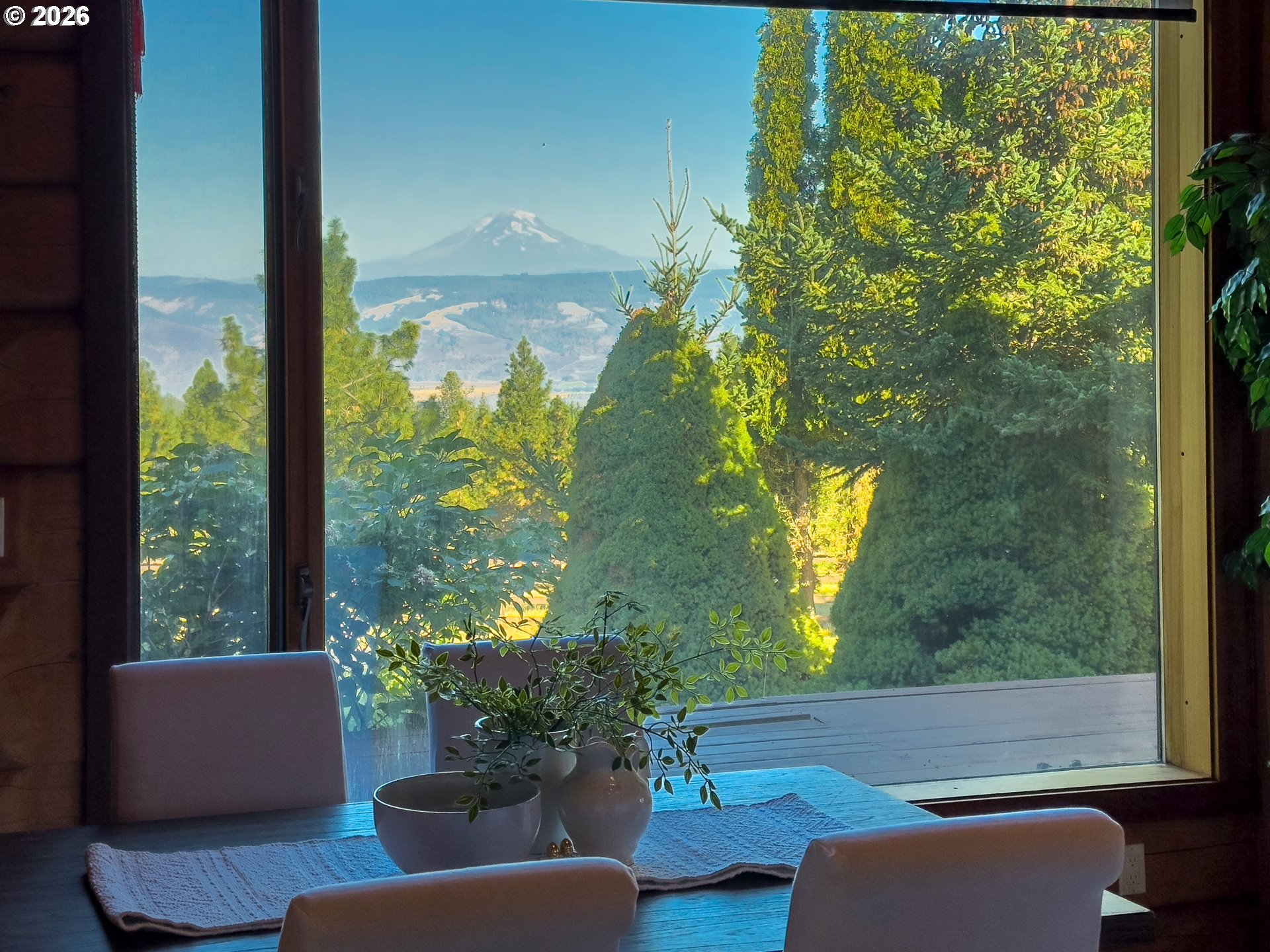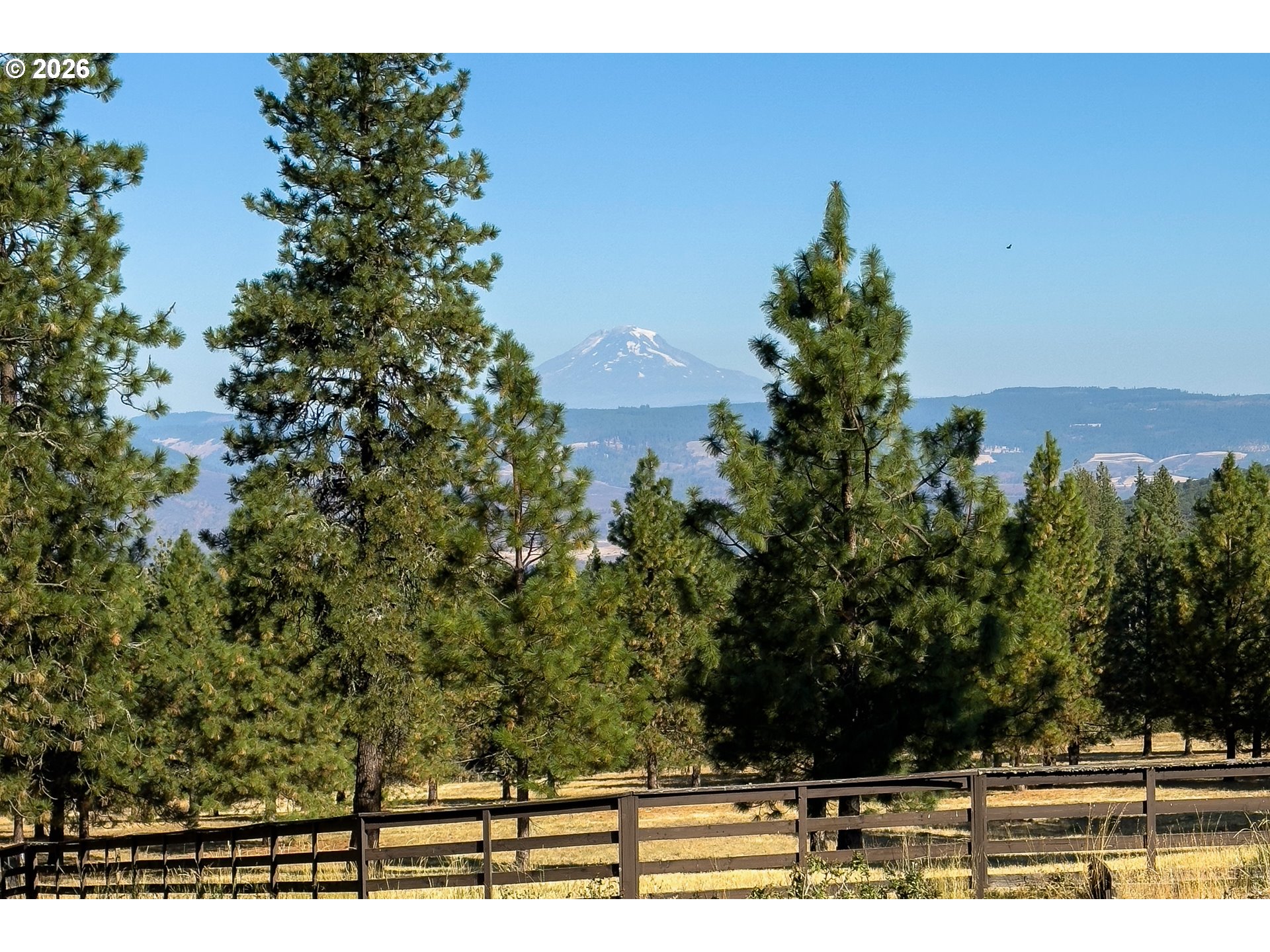 On the coveted Mosier side of The Dalles — just a few hundred feet from the Mosier boundary yet firmly within the Mosier School District and voting district — this forty-acre mountain-view retreat offers rare proximity with the benefit of true Mosier community alignment. Only 10 miles from Hood River & an easy 10-minute drive to acclaimed restaurants, wineries, farm stands, & year-round recreation, the setting feels worlds away while remaining deeply connected to the best of the Gorge.Sweeping views of Mount Adams unfold across gently rolling, fenced pasture framed by pine, fir, and oak. The land is thoughtfully suited for livestock, horses, & a variety of farm animals, offering both functionality & pastoral beauty. A hand-dug, year-round spring, seasonal pond, established well, & water rights provide meaningful infrastructure for self-sufficiency, small-scale agriculture, or an elevated country lifestyle rooted in the land.For the equestrian buyer, this property is uniquely compelling. In addition to a two-stall barn, hay storage, wood shed, and fenced pasture, it borders approximately 1,300 acres of private land with established horse trails — creating the rare opportunity for expansive, uninterrupted riding directly from your gate. Endless trail access without hauling is a true luxury in today’s market.The hand-hewn log cabin is oriented to capture commanding mountain vistas, with large windows that flood the open living and kitchen areas with natural light. Upstairs, the primary suite opens to a private view deck with walk-in closet and full bath, while a main-level bedroom and bath provide flexibility for guests or multi-generational living. Rich in authenticity and character, the home invites comfortable living as-is, with room for thoughtful updates over time. Adding to its significance is the rare opportunity to restore or reimagine an additional homesite dating back to 1860, once used by the United States Cavalry — a meaningful piece of northwest history.