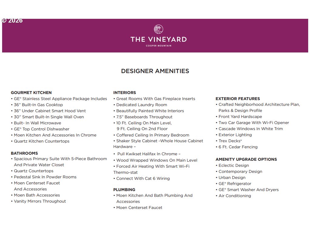 Introducing the Burgundy, our newest and most captivating floorplan, beautifully situated in the heart of the breathtaking Vineyard community in sought-after Beaverton. Designed for both elevated entertaining and effortless everyday living, this home welcomes you with soaring 10-foot ceilings on the main floor, 9' ceilings upstairs, and a thoughtfully designed open-concept layout that feels light, airy, and inviting from the moment you step inside. At the heart of the home, the kitchen truly shines. Featuring a built-in wall oven and microwave, generous counter space, butler's pantry and an expansive island perfect for gathering, this is a kitchen made for connection. Picture slow Sunday mornings with coffee at the island, holiday meals filled with laughter, or evenings where friends linger long after dessert. The seamless flow into the dining and living areas keeps everyone connected while still offering room to breathe. The main level offers the rare luxury of two distinct living spaces, ideal for a cozy media retreat, a quiet reading lounge, a home office, or a play space, giving you flexibility as your lifestyle evolves. Modern living is elevated with integrated smart home technology designed to simplify and enhance your day-to-day life. Control lighting, temperature, and more right from your smartphone with options to add smart switches and dimmers throughout the home, you can effortlessly create the perfect ambiance for any occasion. Brighten the space for entertaining, soften the lights for a relaxing evening, or turn everything off with a single tap before heading to bed. It is comfort, convenience, and peace of mind all at your fingertips. On the main floor, a covered deck offers the perfect place to unwind and take in beautiful valley views, whether it is a quiet morning sunrise or a glass of wine at sunset. Tour daily, no appointment necessary.