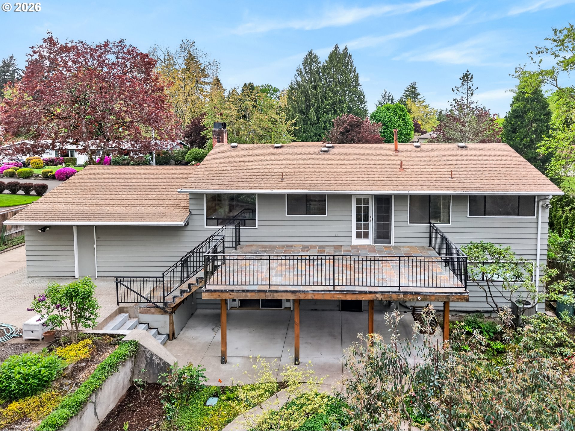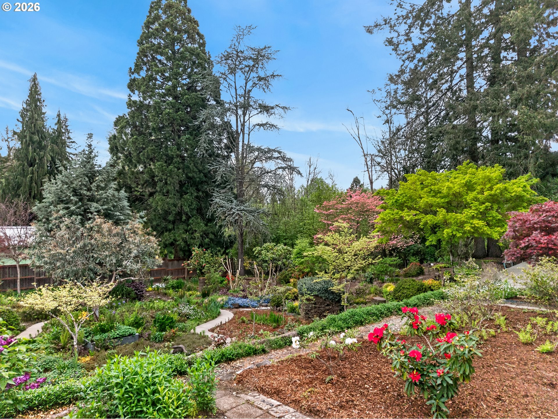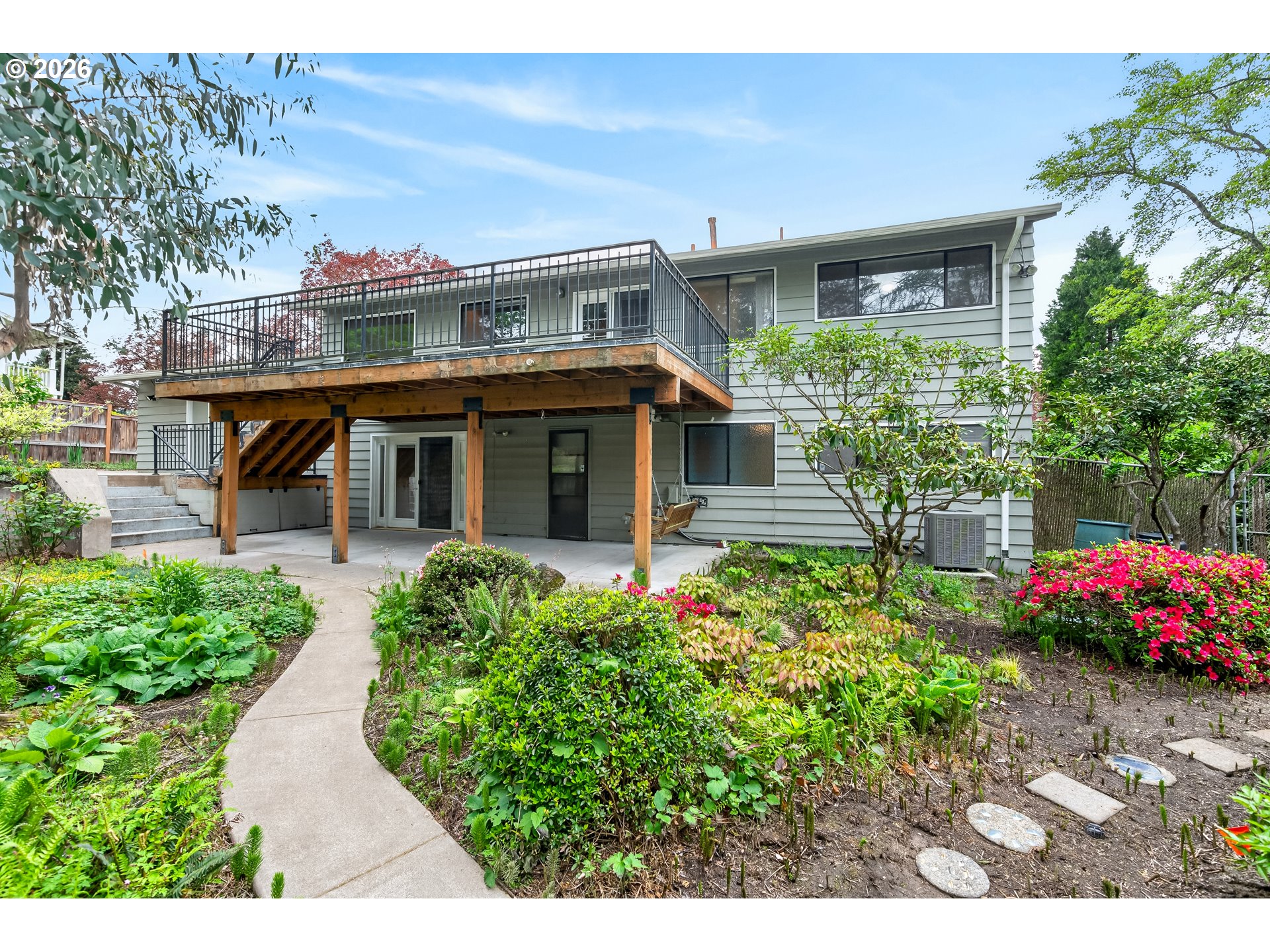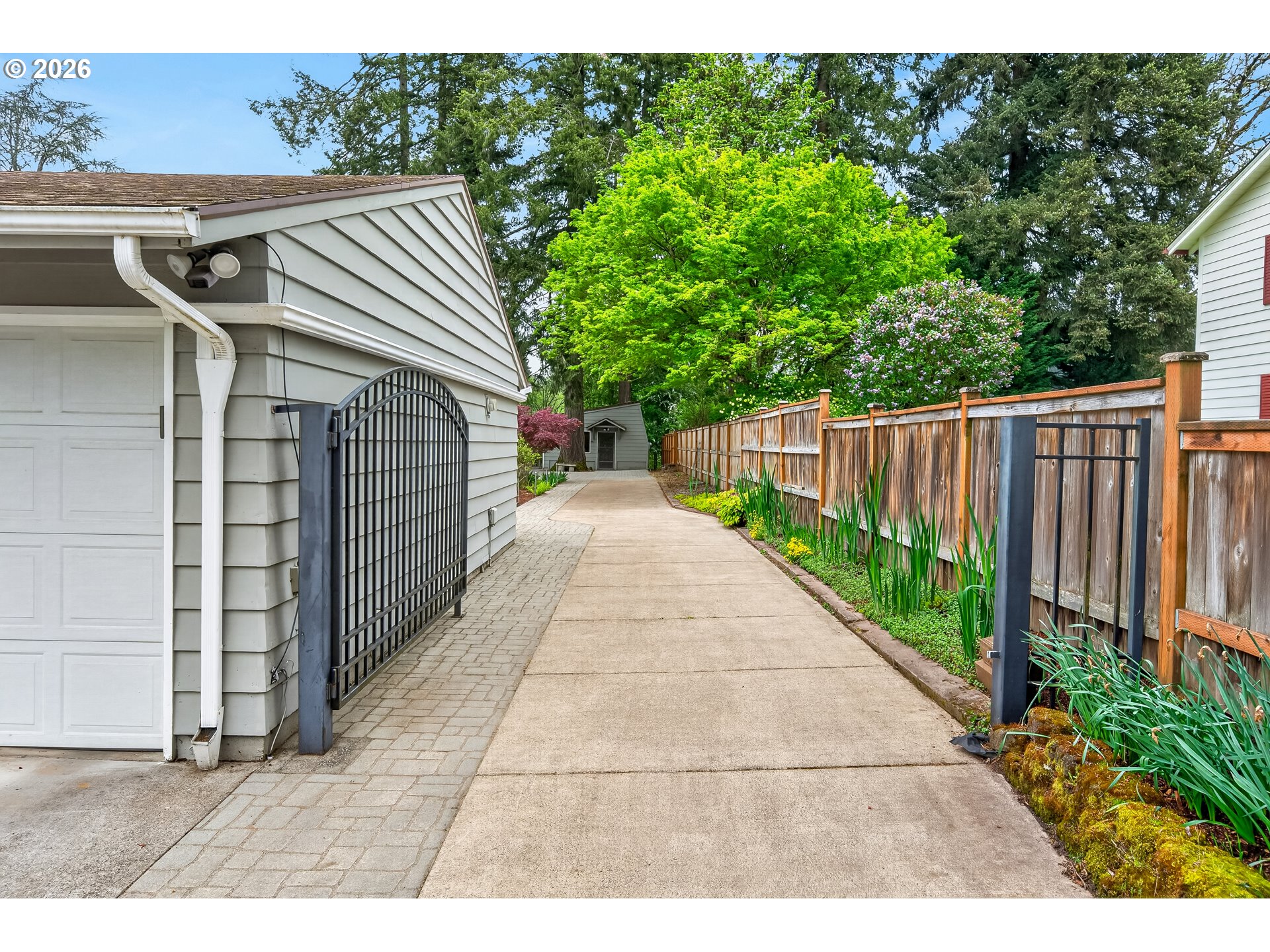 Welcome to your own private garden sanctuary in a quiet, established Tigard neighborhood. This split-level home features vaulted ceilings and skylights that fill the main level with natural light. The great room includes a gas-insert fireplace, large windows, and skylights. The open kitchen flows into the dining area and out to a large, deck, ideal for entertaining or relaxing. This level also includes a spacious primary bedroom with a sizeable walk-in closet and convenient access to the full hall bath via a pocket door. Downstairs offers two additional bedrooms, a second full bath, and a laundry/mud room with its own entrance to the back patio. The large downstairs bonus room has a thermostat-controlled gas-insert fireplace, and access to the two-car garage and the back patio. The AC and high-efficiency furnace are new as of 2022. Step outside to discover what truly sets this home apart, a fully fenced garden oasis on nearly half an acre, backing up to a green space for added privacy. Garden showpieces include a tulip saucer magnolia, dark pink dogwood, the unique Arizona "Blue ice" cypress, multiple flaming crape myrtles and burning bushes, a variety of Japanese maples, and four color variations of redbud trees. Blueberry bushes and fig trees have provided an abundance of fruit each year. To the right of the garage is a long driveway, suitable for RV parking, that reaches a versatile outbuilding. The outbuilding was thoughtfully designed for a past owner, a ceramic artist, featuring a half bath, an extended stainless-steel sink with hot and cold water, electrical service with 220V capability, an industrial gas heater, and central drain for easy cleanup. There are many shelves, and built-in drawers. The attached carport is also plumbed for water, gas and electricity and has a retractable garage door. Convenient front and back sprinkler systems for stress-free watering. This home is truly a standout, offering space, functionality, and a beautiful setting all in one.