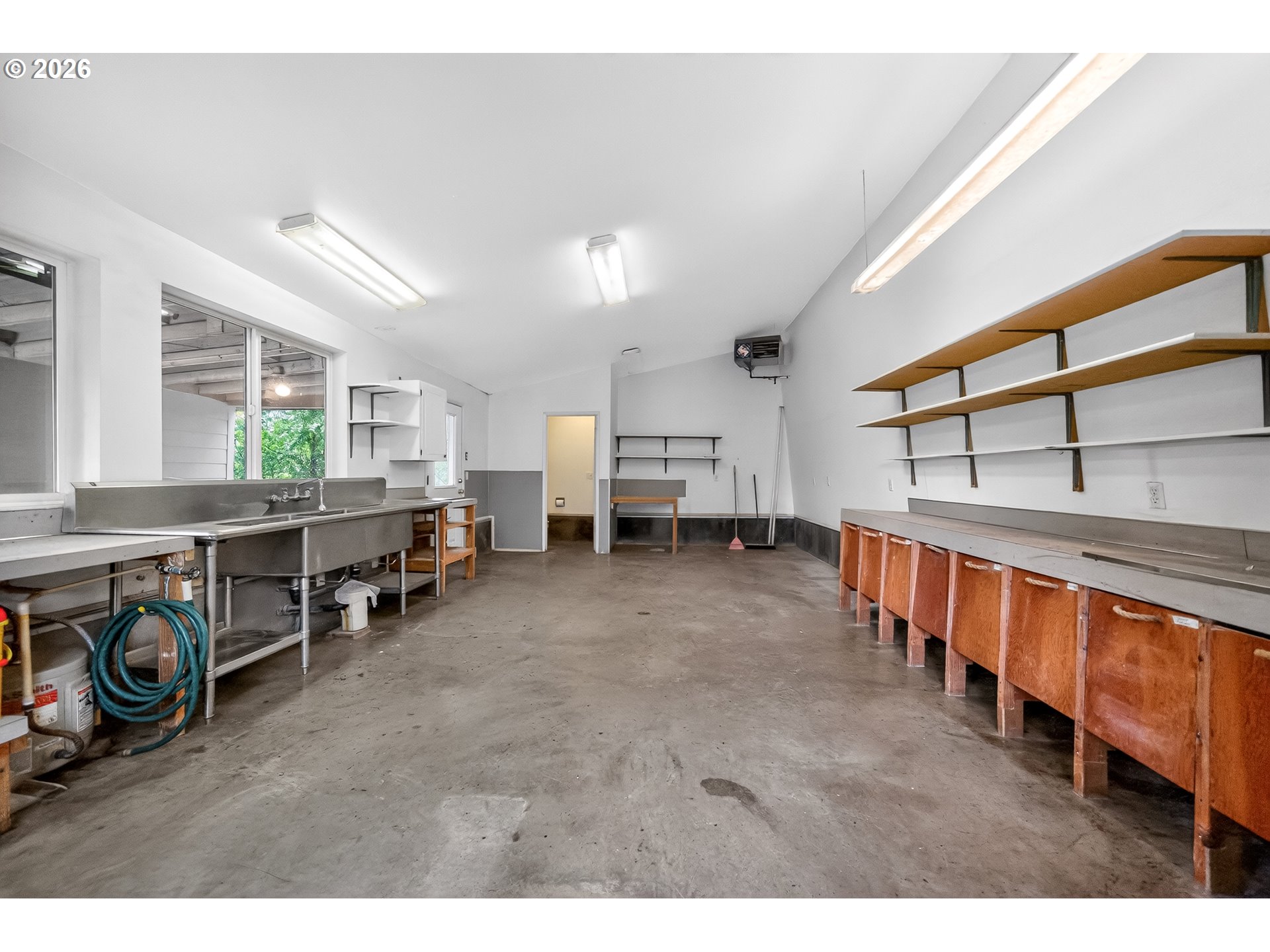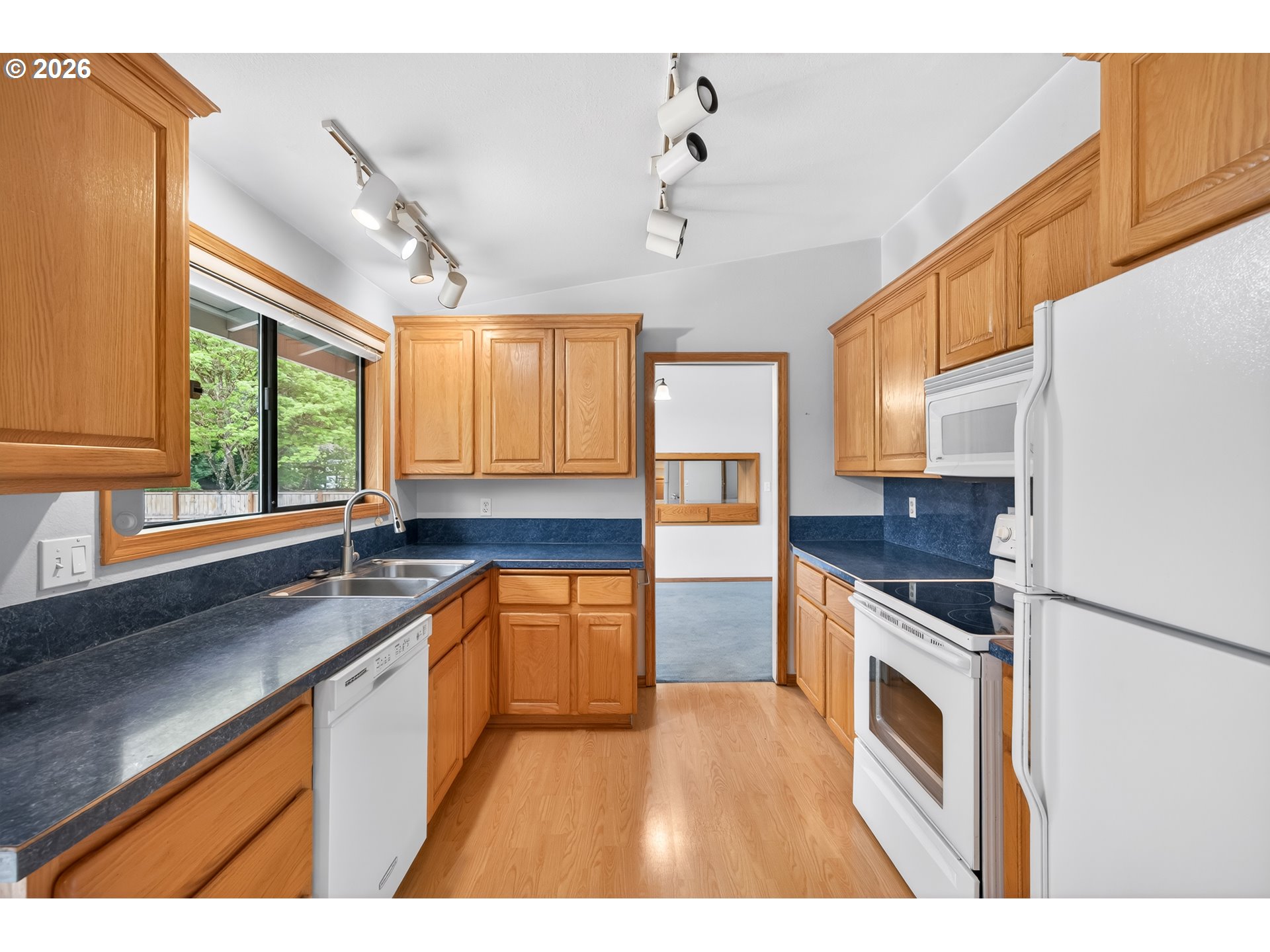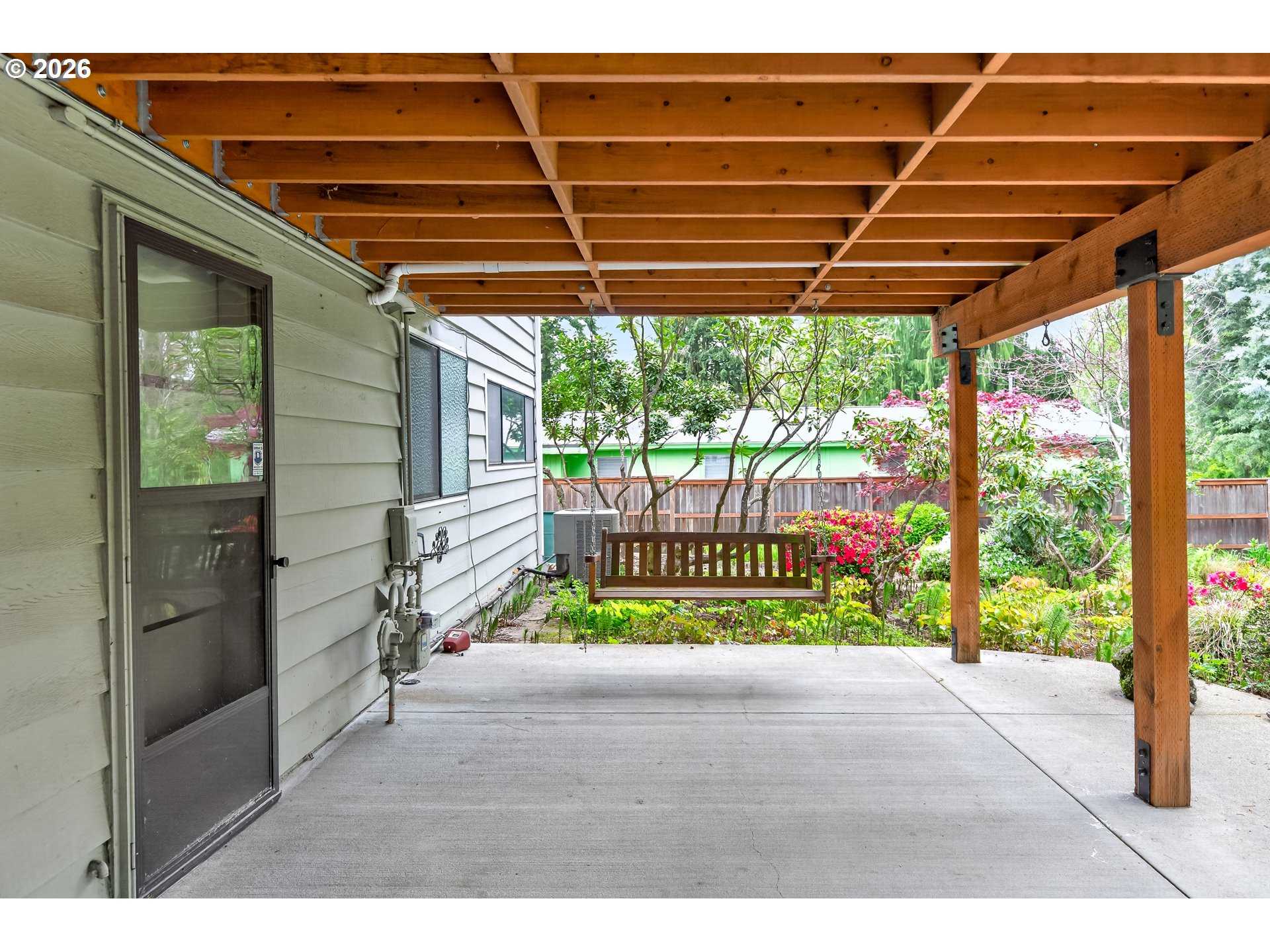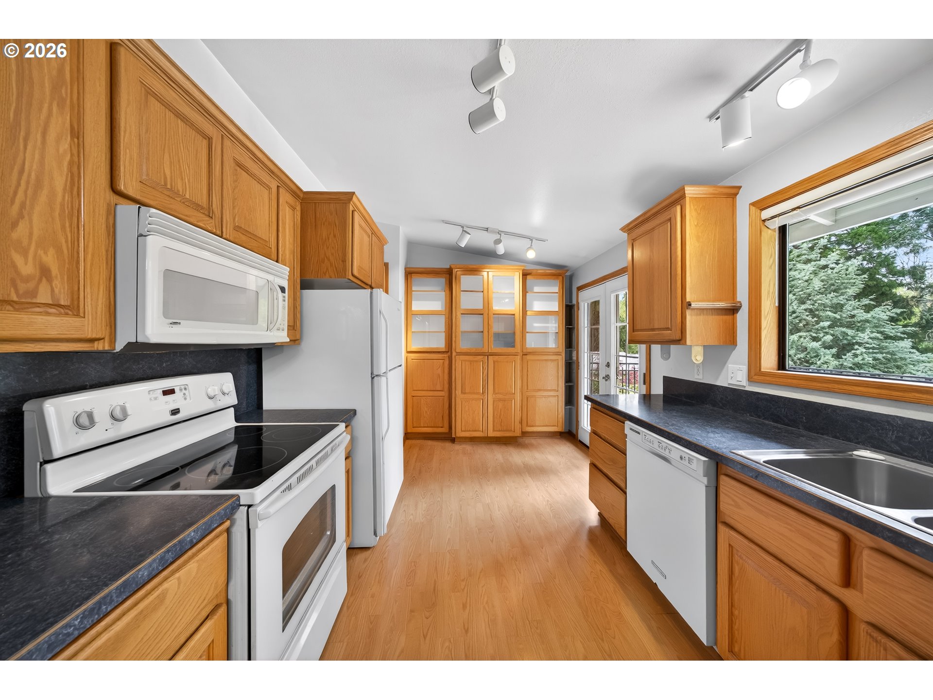 Welcome to your own private garden sanctuary in a quiet, established Tigard neighborhood. This split-level home features vaulted ceilings and skylights that fill the main level with natural light. The great room includes a gas-insert fireplace, large windows, and skylights. The open kitchen flows into the dining area and out to a large, deck, ideal for entertaining or relaxing. This level also includes a spacious primary bedroom with a sizeable walk-in closet and convenient access to the full hall bath via a pocket door. Downstairs offers two additional bedrooms, a second full bath, and a laundry/mud room with its own entrance to the back patio. The large downstairs bonus room has a thermostat-controlled gas-insert fireplace, and access to the two-car garage and the back patio. The AC and high-efficiency furnace are new as of 2022. Step outside to discover what truly sets this home apart, a fully fenced garden oasis on nearly half an acre, backing up to a green space for added privacy. Garden showpieces include a tulip saucer magnolia, dark pink dogwood, the unique Arizona "Blue ice" cypress, multiple flaming crape myrtles and burning bushes, a variety of Japanese maples, and four color variations of redbud trees. Blueberry bushes and fig trees have provided an abundance of fruit each year. To the right of the garage is a long driveway, suitable for RV parking, that reaches a versatile outbuilding. The outbuilding was thoughtfully designed for a past owner, a ceramic artist, featuring a half bath, an extended stainless-steel sink with hot and cold water, electrical service with 220V capability, an industrial gas heater, and central drain for easy cleanup. There are many shelves, and built-in drawers. The attached carport is also plumbed for water, gas and electricity and has a retractable garage door. Convenient front and back sprinkler systems for stress-free watering. This home is truly a standout, offering space, functionality, and a beautiful setting all in one.