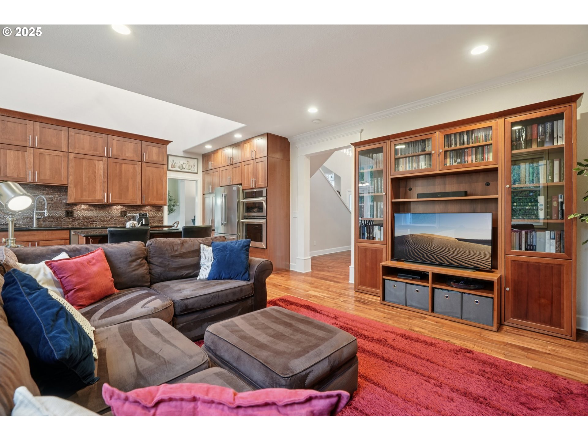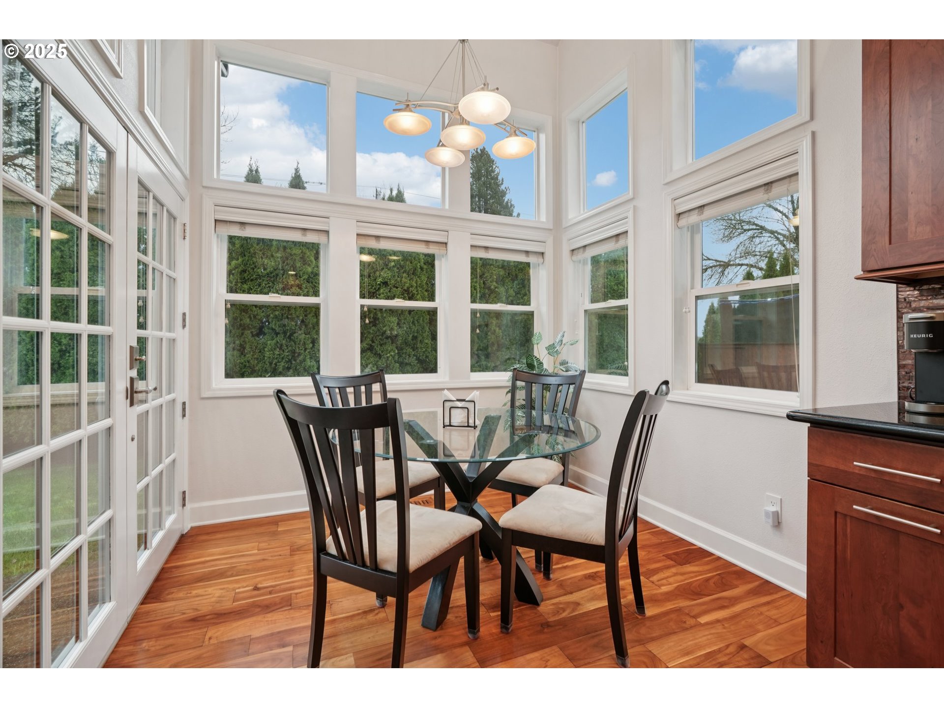 Impressive 18-foot ceilings and an open floor plan fill the home with natural light, creating a bright, airy atmosphere—even during Oregon’s rainy winters. The architectural centerpiece is the open staircase leading to an upstairs “skybridge” hallway that overlooks the heart of the home. From above, take in views of the fully remodeled contemporary kitchen featuring solid cherry 9-foot cabinetry and granite countertops. Opposite the kitchen, the spacious living room offers a warm and inviting setting, ideal for entertaining or relaxing evenings at home. Meticulously maintained by the original owners, the home has been thoughtfully remodeled through three major renovation phases, including a beautifully remodeled primary suite. Notable upgrades include 5” wide acacia wood flooring throughout, Electrolux Icon and Frigidaire gourmet kitchen appliances, granite countertops in the kitchen and bathrooms, striking contemporary lighting, a new roof with transferable warranty, and fresh exterior paint completed in 2022—reflecting exceptional pride of ownership throughout. [Home Energy Score = 5. HES Report at https://rpt.greenbuildingregistry.com/hes/OR10243177]