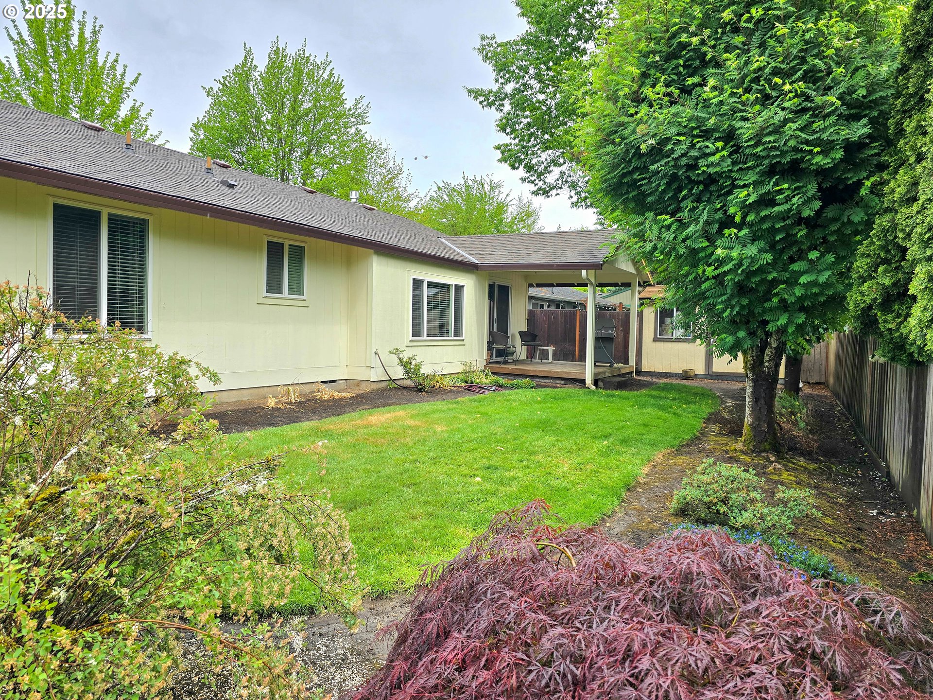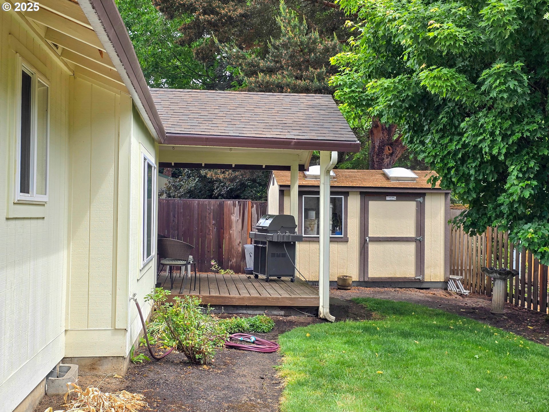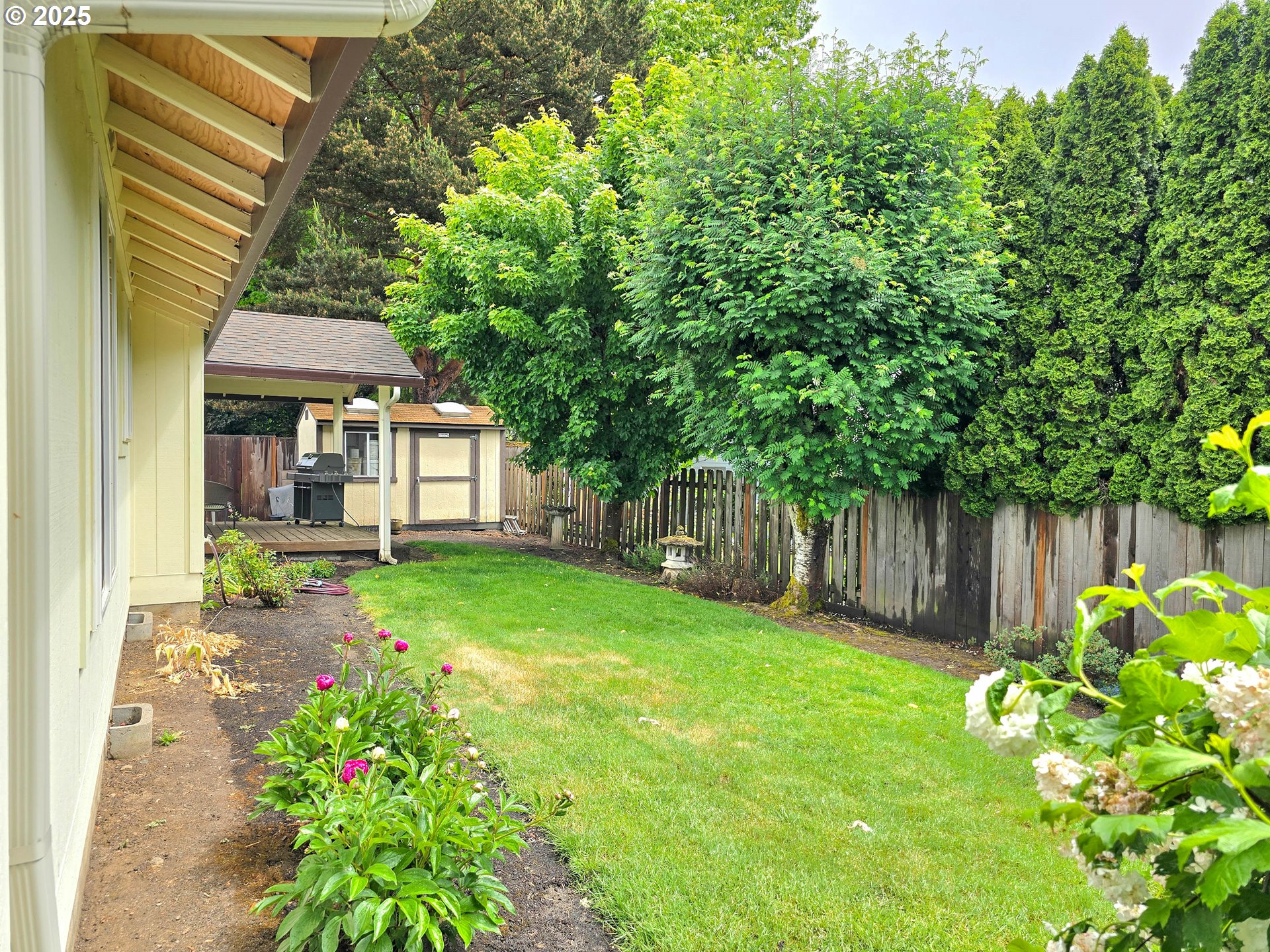 Come home to this one-level home on a large, level lot in a secluded, tree-lined, local-traffic-only neighborhood. Having maintained some of its original charm, this three-bedroom, two-bathroom home offers 1,348 sq ft of comfortable living space under a brand-new roof on one convenient level. Step inside the freshly-painted interior to find an open layout with efficient use of space, expansive laminated floors laid in ~2015, vaulted living room ceiling, modern, double-pane vinyl windows and new mirrored closet doors that enhance the spacious feel of the living areas. The kitchen features newly-painted cabinets, a double-door closet style pantry and a fridge and dishwasher that were replaced in 2022. The primary bathroom features a bathtub while the hallway bathroom has a convenient, low-profile threshold, fiberglass shower stall. The 7,405-sq-ft level, fully-fenced lot with a 9' x 13' Tuff shed, covered deck, and a Weber Genesis BBQ with a gas line, provide ample room for outdoor entertaining, gardening, or simply relaxing in your private backyard retreat. The backyard has a Southern exposure. The home is complete with a two-car garage with room for extra storage. Washer and dryer are included. Nestled in the heart of South Beaverton and near to Southridge High School, Conestoga Recreation and Aquatic Center, Summerlake City Park, Greenway Park, Koll Center Wetlands Park, Hiteon Meadows Park with Summer Creek, Murray Scholls Town Center, Progress Ridge Townsquare with a cinema, as well as to Hwy 217, Washington Square, and an array of dining and entertainment options, this home offers a perfect blend of suburban charm and urban convenience. The neighborhood also features extensive trails. Easy commute to Nike World Headquarters and Intel.