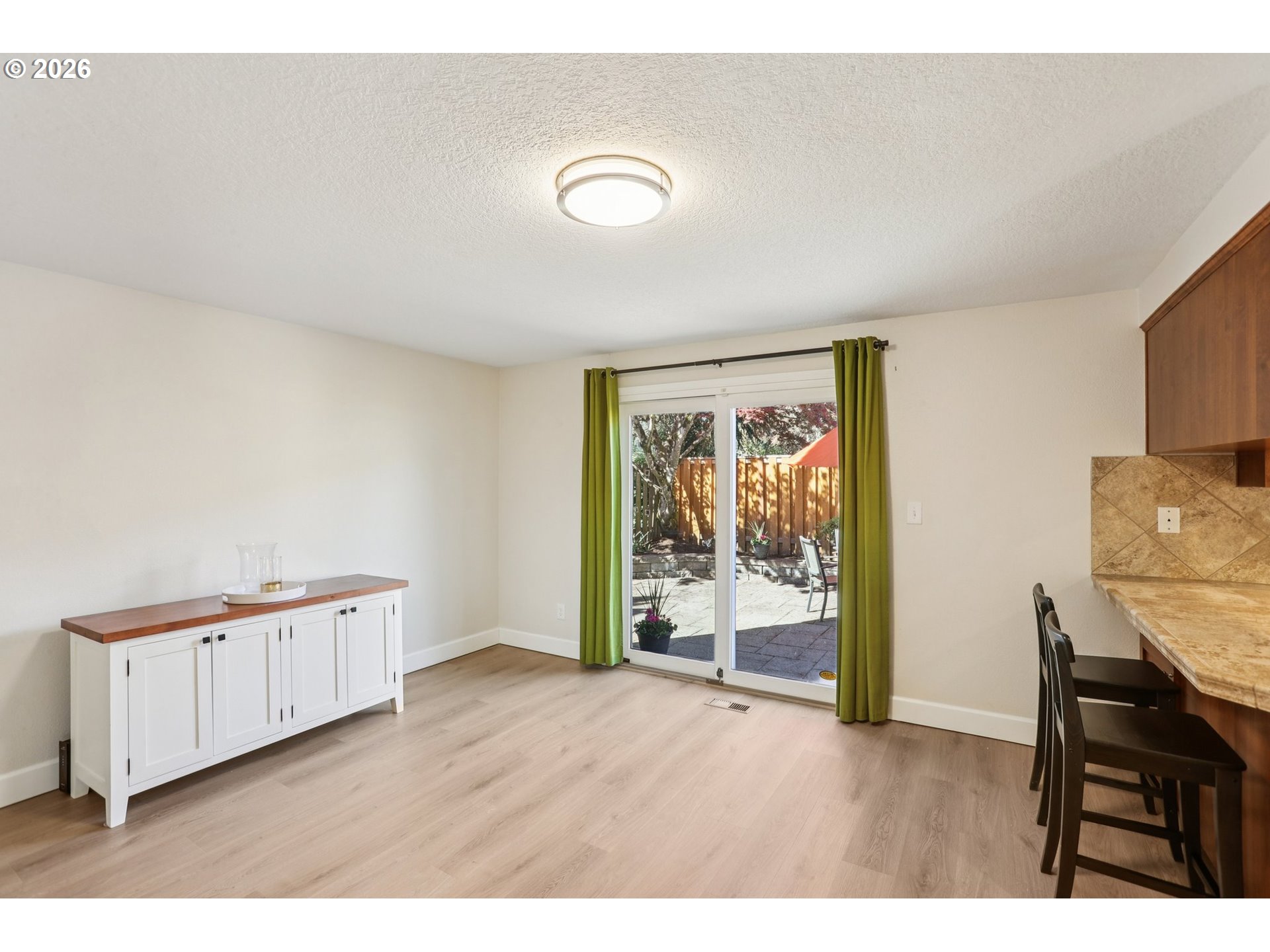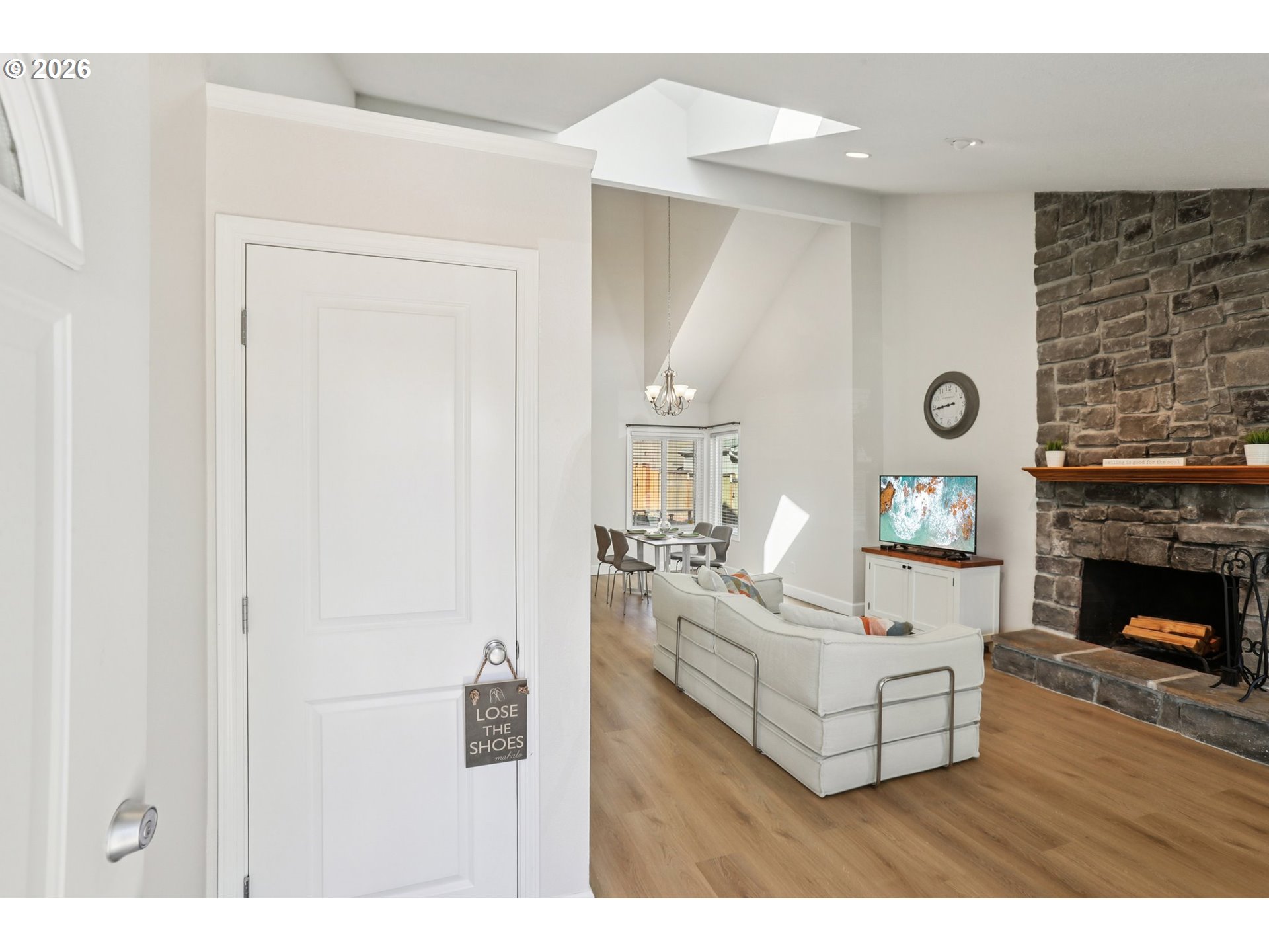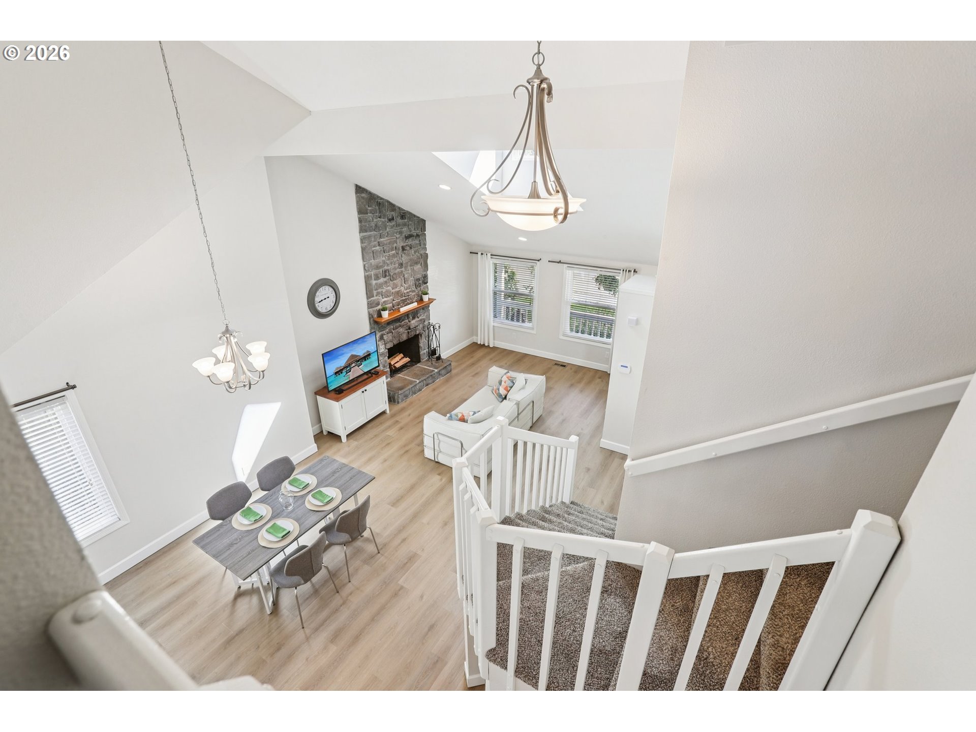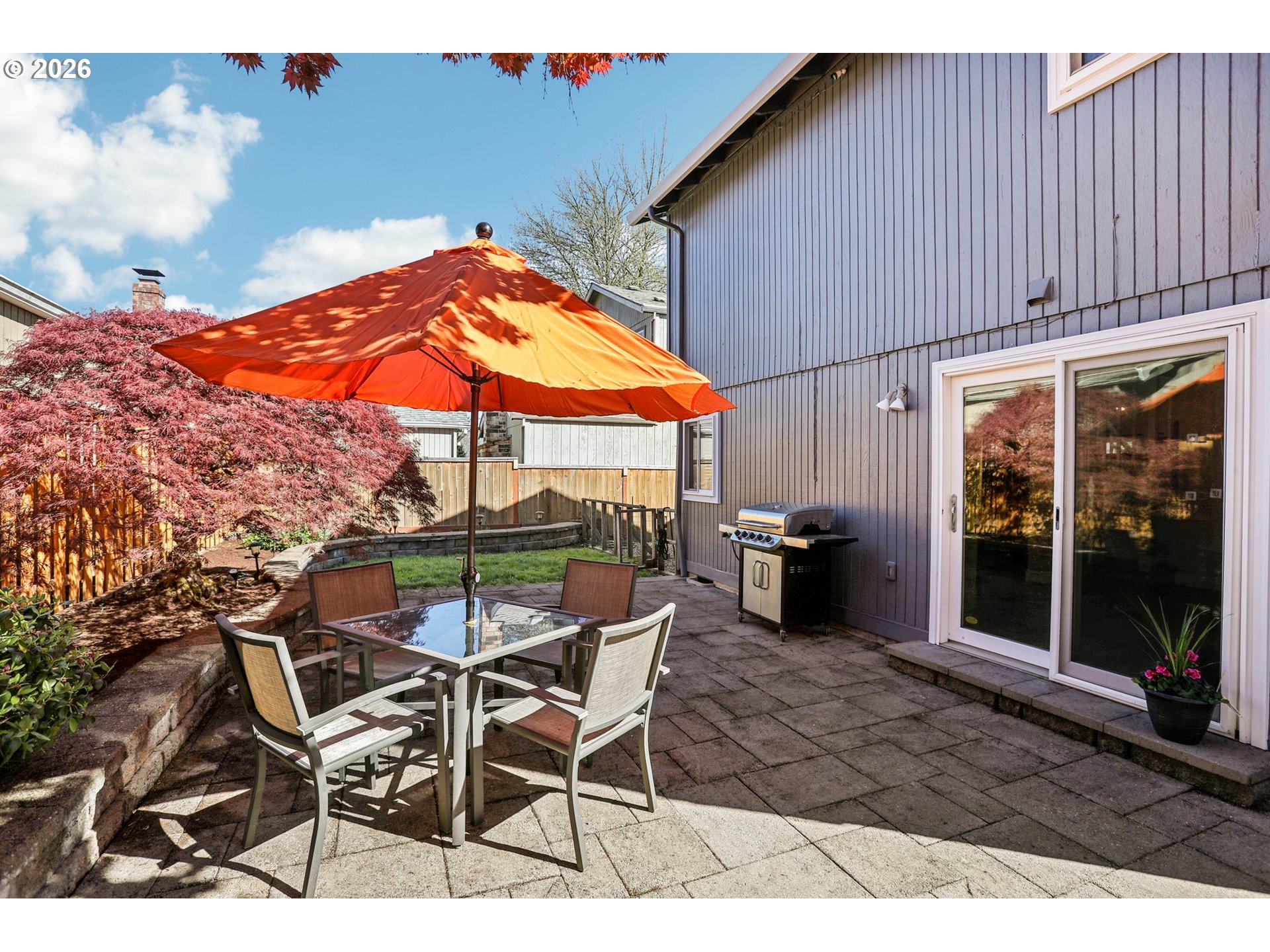 Beautifully updated home in Tigard featuring vaulted ceilings and a striking wood burning rock fireplace that anchors the main living space. Fresh interior and exterior paint and new luxury vinyl plank flooring throughout the lower level create a clean, modern feel. Comfort is covered with A/C, a newer furnace, and new water heater. The private backyard is designed for outdoor living with a stunning hardscape patio, mature Japanese maples, and a fully fenced yard with dog run. Convenient access to the vibrant downtown Tigard area known for local events, restaurants, and neighborhood gathering spots, along with the scenic Fanno Creek Trail for nearby nature and recreation. Includes a 1-year home warranty plan for added peace of mind. Open Saturday 1-3 | Sunday 1-3