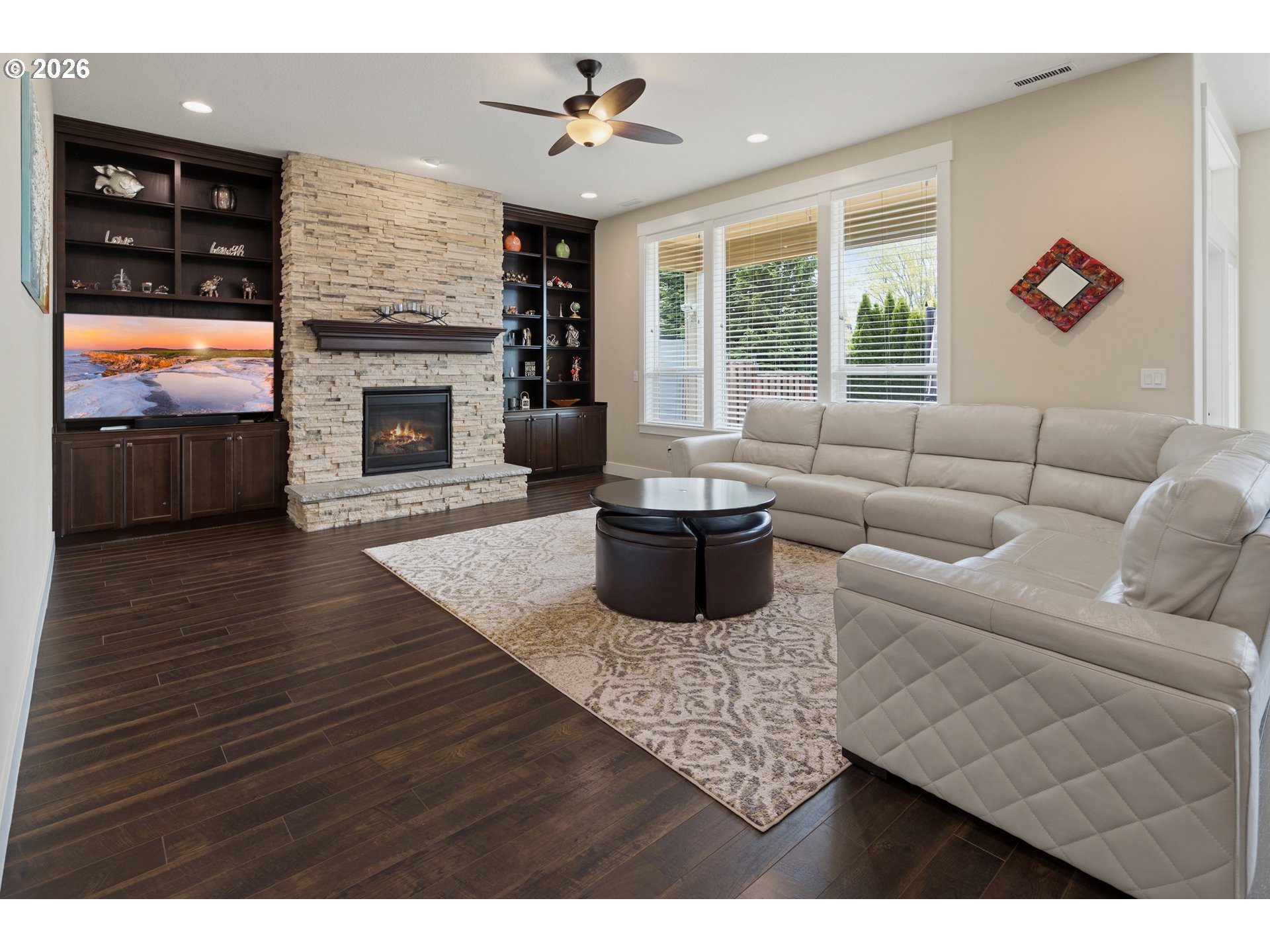 Bookcases, CeilingFan, Fireplace