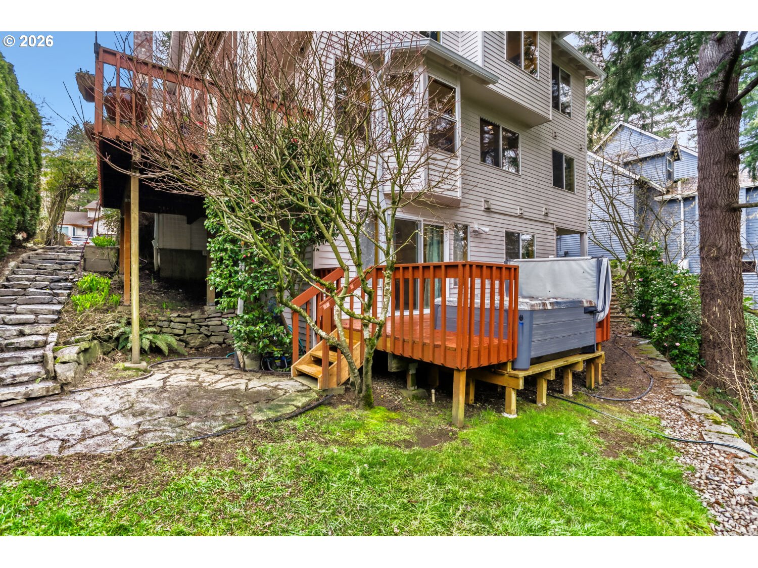Private Greenbelt Sanctuary with Tranquil Water Views.Step into this beautifully remodeled 4-bedroom, 3.5-bathroom retreat in one of Beaverton’s most sought-after neighborhoods. Situated on a premier Vale Park greenbelt lot, this home offers rare privacy and the soothing sounds of trickling Johnson creek and pond right from your back door.The vaulted hardwood entry leads to an airy living room anchored by a masonry fireplace and formal dining area. The heart of the home is the tastefully updated kitchen, featuring warm soft-close cabinetry, quartz counters, and a gas downdraft cook island. A newer sliding door opens to your private "deck oasis," complete with a Sunsetter awning—perfect for dining while taking in the view.Owner’s Suite overlooks the wetlands with a large walk-in closet and a dual-vanity bath featuring a jetted tub and walk-in shower.Daylight Basement includes a family room, a 4th bedroom, and a full bathroom—ideal for guests or multi-generational living.Relax in the 2021 hot tub on the lower deck while enjoying the wildlife. Modern essentials are all covered: brand new water heater, new garage door opener, forced air gas furnace, central AC with air cleaner, Laundry room with cabinets/shelves, a sink, and brand new washer/dryer. and an automatic sprinkler system for the front and back lawns and raised garden beds.Don't miss the opportunity to own this remarkable home and enjoy the year-round views of wildlife, nature, and tranquility.