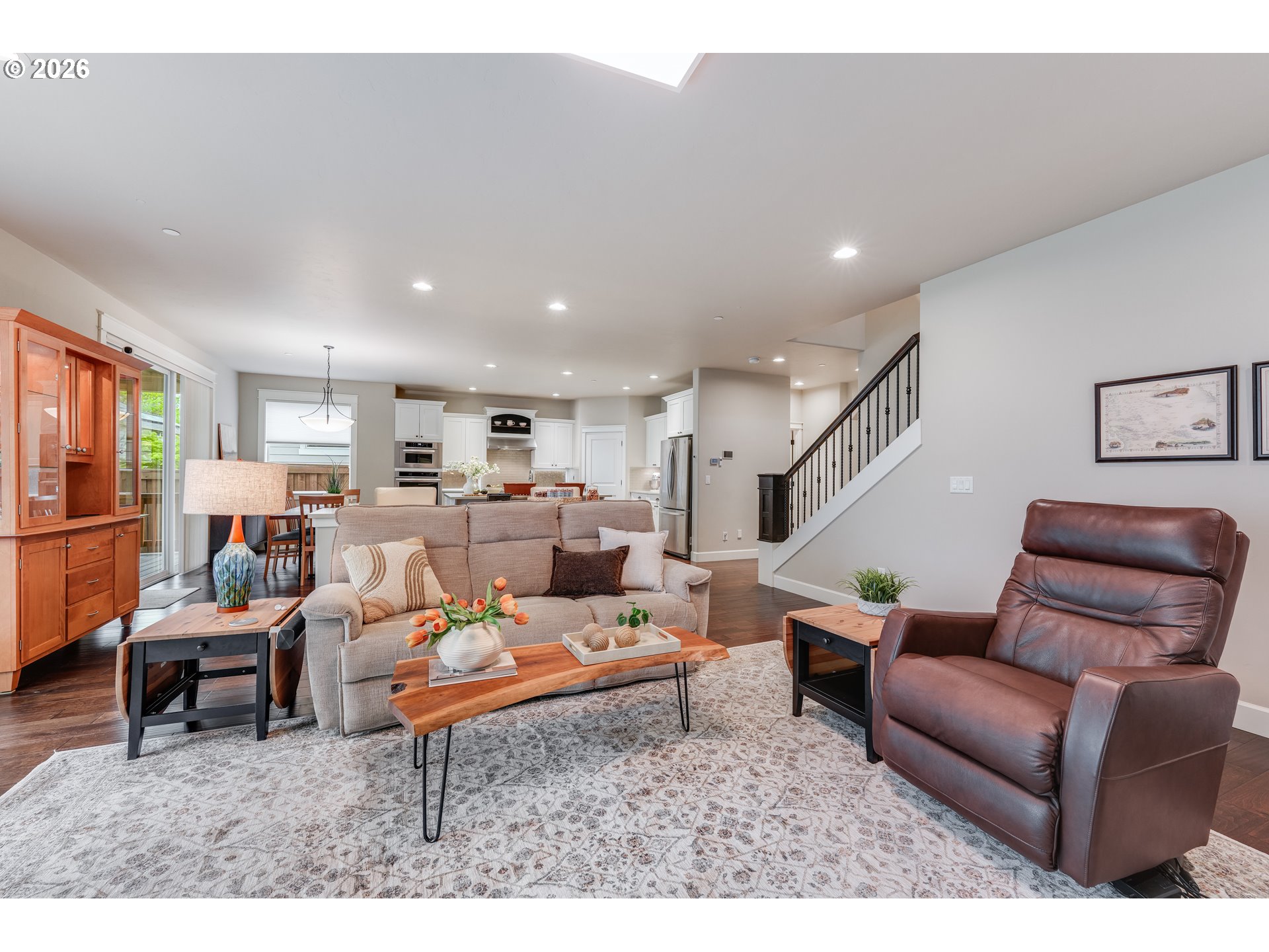 Built by Pahlisch Homes in 2014, this beautifully maintained 4-bedroom, 3-bath home in Orenco Station offers flexible living, thoughtful upgrades, and exceptional garage space rarely found in the neighborhood. Warm wood floors welcome you into the foyer, where a main-level bedroom or office sits adjacent to a full bath with walk-in shower—ideal for guests, multi-generational living, or working from home. The open-concept great room features a cozy gas fireplace, built-in bookshelves, and a spacious kitchen with quartz countertops, built-in microwave, water filtration system, and easy flow into the dining area—perfect for everyday living and entertaining alike. Step outside to the large covered patio, flagstone pathways, and sprinkler-supported landscaping designed for easy outdoor enjoyment year-round. Upstairs offers a generous bonus room, additional bedrooms, full bath, and a spacious primary suite retreat with soaking tub, walk-in closet, glass enclosed shower, and private water closet. The upstairs laundry room adds everyday convenience, and the washer, dryer, and refrigerator are included. A standout feature of this home is the heated and insulated 4-car garage with heavy epoxy floor coating, built-in workspace in the fourth bay, and utility sink—ideal for hobbies, storage, projects, or extra vehicles. Additional highlights include central air conditioning, central vacuum, recirculating hot water system, fire suppression system, and pre-wiring for solar. Located in the highly desirable Orenco Station community near parks, shopping, dining, and transit, this home combines comfort, flexibility, and modern efficiency in one exceptional package. Open Saturday from 1-3.