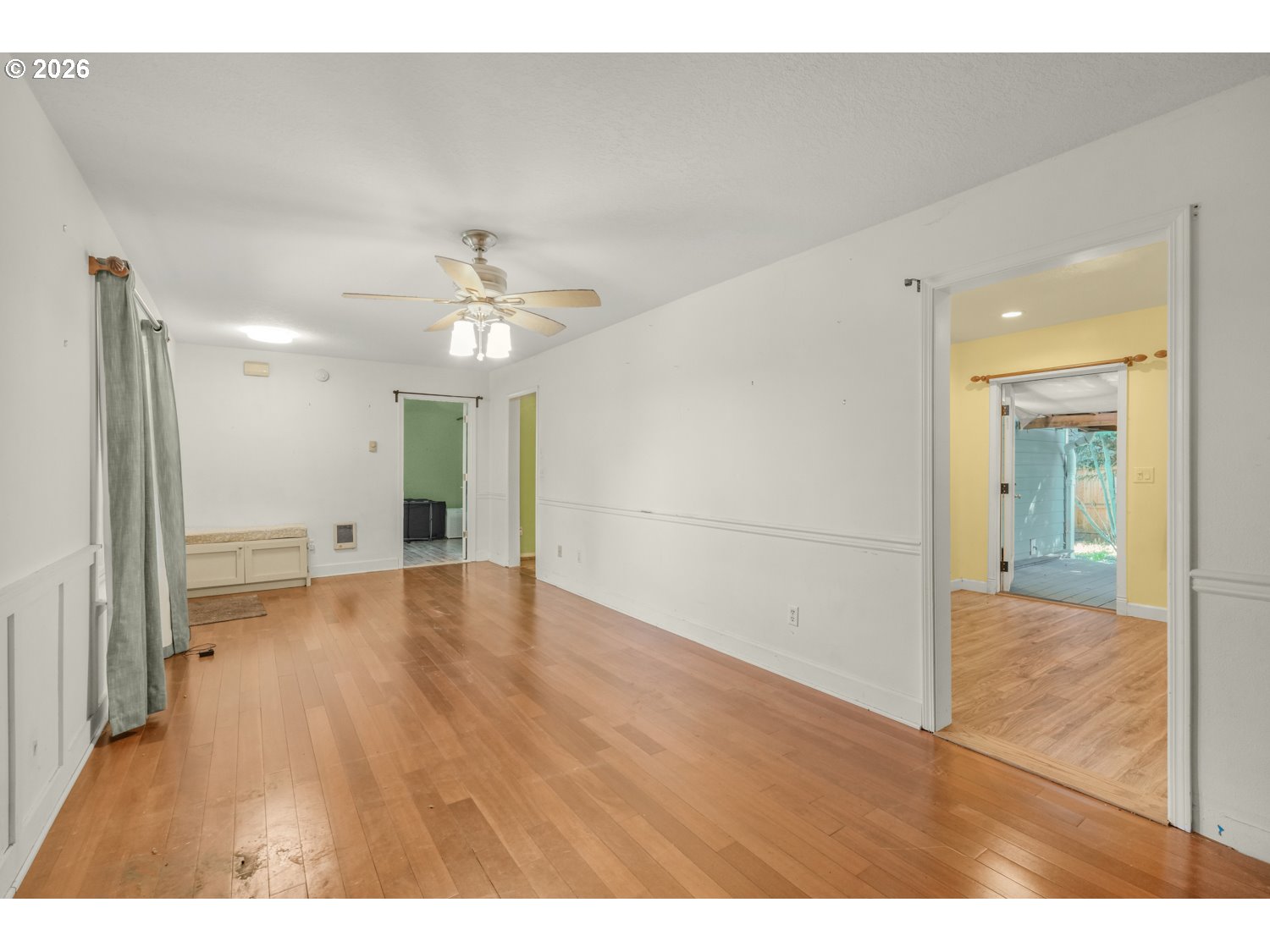 CeilingFan, HardwoodFloors, LaminateFlooring, Wainscoting, WalltoWallCarpet