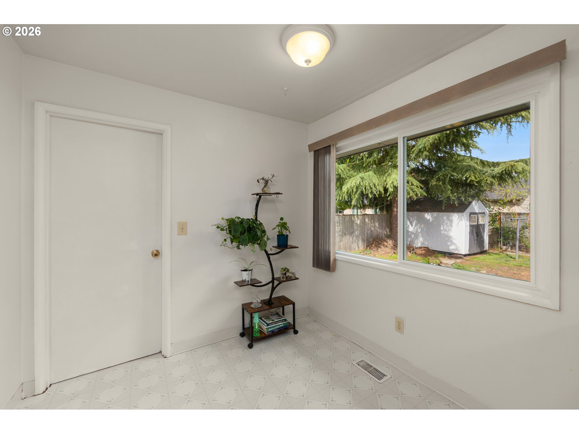 Opportunity to own a detached home on a spacious lot tucked on a quiet, dead end street. Original hardwood floors run through the living room, dining room, hallway, and three bedrooms, adding warmth and character. The light-filled living room features a large picture window and a classic wood-burning brick fireplace. Sliding doors open to a covered deck overlooking the large, level backyard, fully fenced with raised garden beds and a new storage shed, ideal for outdoor living and gardening.The kitchen offers an adjacent eating area, while the laundry/mud room provides additional exterior access, a utility sink, and built-ins for added functionality. Recent updates include newer windows, a heat pump, solar attic fan, fresh interior paint, and a new front door. Move-in ready with room to personalize and make it your own. Conveniently located near schools, restaurants, shopping, and everyday amenities.