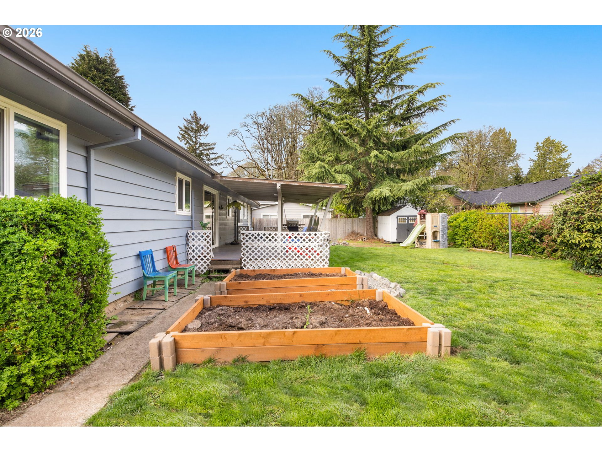 CoveredDeck, Fenced, RaisedBeds, ToolShed, Yard