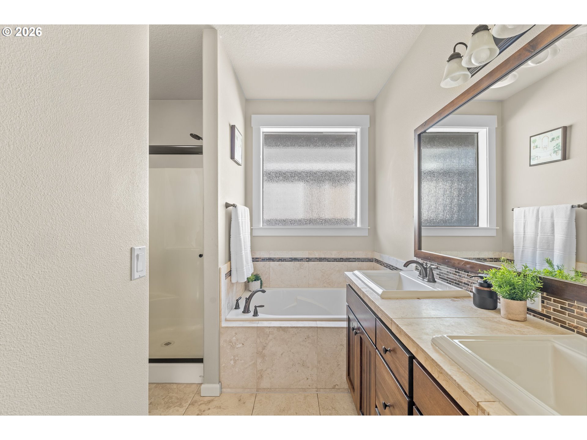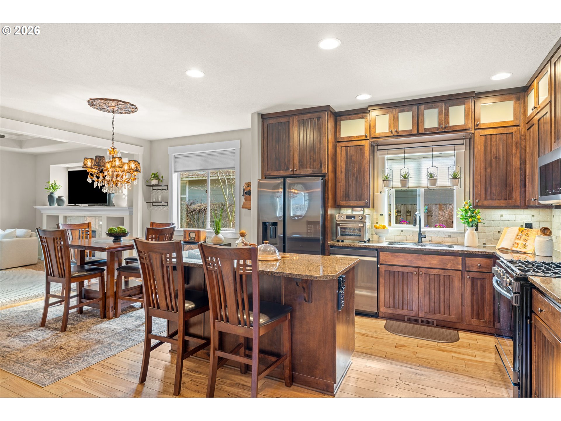 Custom luxury Craftsman with a main-level primary suite in a quiet, private setting. Beautiful hardwood floors, travertine, wainscoting, crown molding, and high ceilings create a light-filled space that’s perfect for both everyday living and entertaining.The kitchen features custom cabinetry, under-cabinet lighting, granite countertops, all-new Samsung appliances, and an island with eat-in bar seating. The living room is warm and inviting, with a coved ceiling, built-in shelving, and a stunning fireplace finished with Italian marble.French doors lead to the private main-level primary suite with built-ins, a coved ceiling, a fireplace, and a walk-in closet with its own laundry. The ensuite bath offers travertine floors and countertops, dual sinks, a soaking tub, and a walk-in shower.Upstairs, you'll find two bedrooms, a built-in desk nook, a full bathroom, and a second laundry room with cabinetry. The backyard is a gardener’s dream, with a paver patio and pergola surrounded by grapevines, plum, banana, and fig trees, plus red and yellow raspberries. A side yard offers even more space for gardening.Additional features and upgrades include a three-stage whole-house water filtration system, HRV whole-home ventilation for cleaner air, air conditioning, and a finished two-car garage with new cabinetry and a stainless steel sink.Conveniently located near parks, bus lines, Nike, Intel, shopping, and easy highway access.