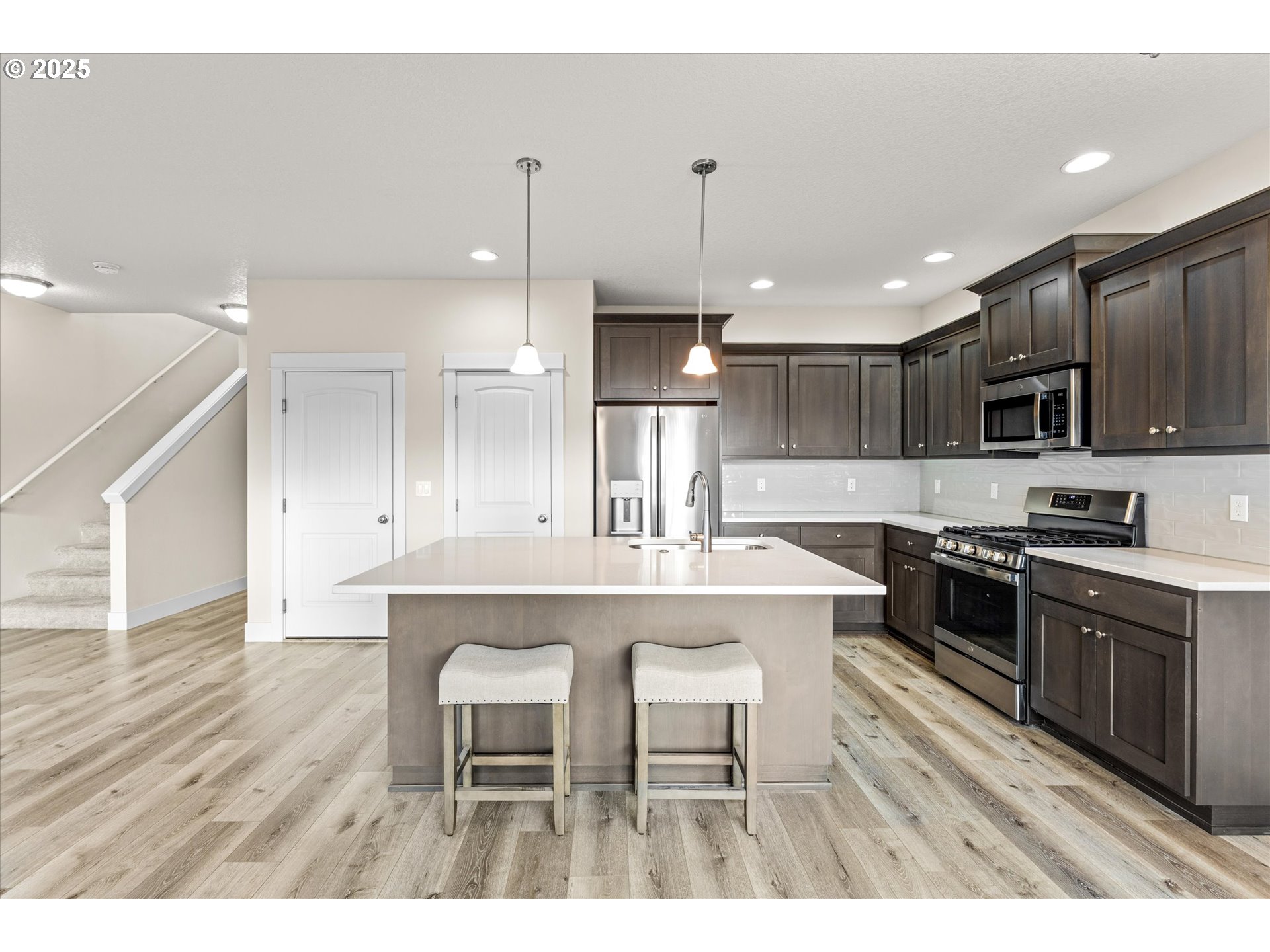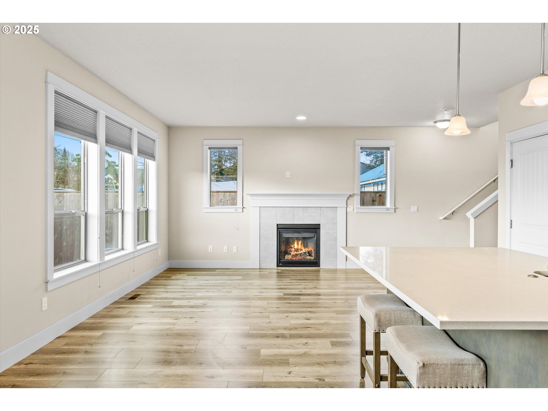 Built in 2021, this thoughtfully designed 3-bedroom, 2.1-bath Forest Grove home offers 1,661 sq ft of modern living in a quiet neighborhood backing to a natural preserve—no homes behind for exceptional privacy. The main level features durable laminate flooring, an inviting gas fireplace with blower, and an open-concept layout ideal for entertaining or everyday comfort. The kitchen is highlighted by a quartz island, stainless steel appliances, and neutral finishes throughout. Upstairs bedrooms include blackout blinds for restful nights. Enjoy year-round comfort with central A/C and the convenience of all appliances included. Energy-conscious features include a 2-car garage with 240V EV outlet and wiring for future solar. Fully fenced backyard, front yard sprinkler system, and peaceful surroundings. Located near Forest Grove parks, Pacific University, and local amenities, this move-in-ready home blends nature, efficiency, and modern style.