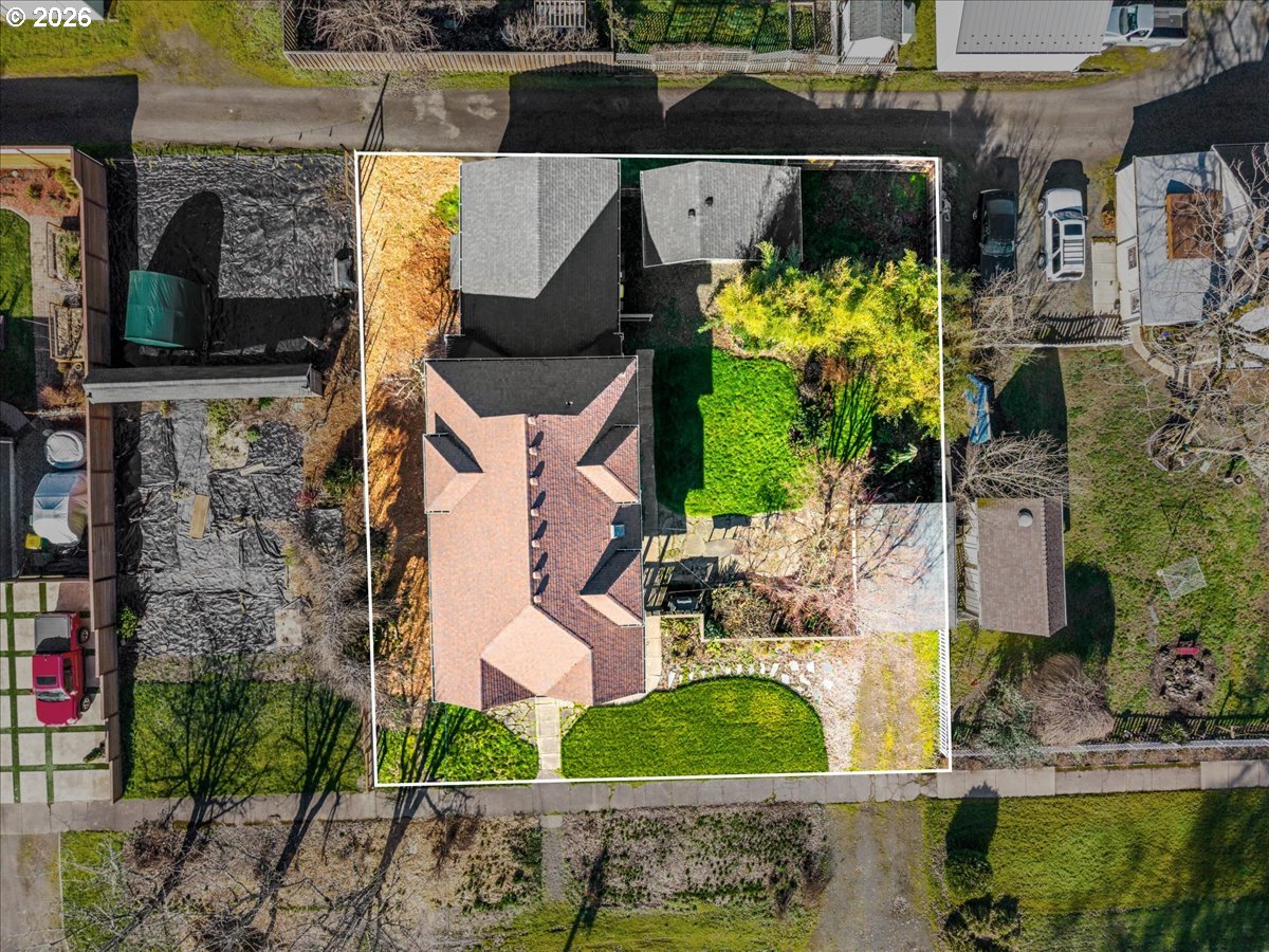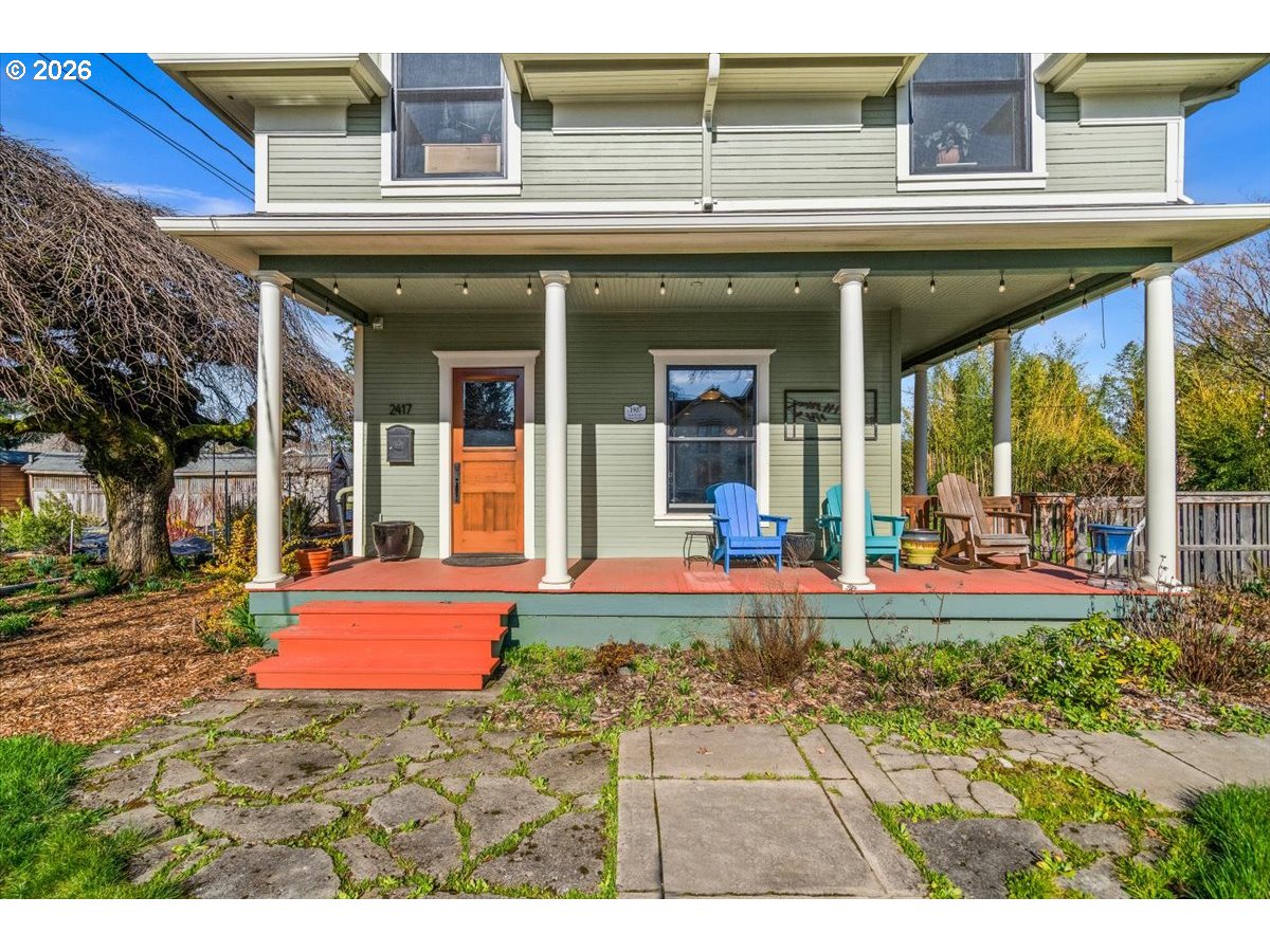 Open House Saturday and Sunday 12-2pm! Step into timeless charm with this captivating 1907 farmhouse that blends vintage character with modern flair. A sweeping covered front porch welcomes you home, wrapping gracefully to the dining area—perfect for morning coffee or sunset gatherings. Inside, soaring ceilings and a gallery-style hallway set the stage for your favorite artwork, highlighted by a stunning stained-glass window and an elegant open wooden staircase. The formal living and dining rooms impress with wood-wrapped picture windows, exposed beams, and beautiful natural light that creates a warm, inviting ambiance. The cozy family room offers plush comfort with sunny windows that bring the outdoors in—hardwoods waiting beneath the carpet. At the heart of the home, the chef’s kitchen dazzles with quartz countertops, subway tile backsplash, copper sink, stainless steel appliances, glass-front cabinetry, and a movable island with breakfast bar seating. A spacious mudroom provides abundant storage and a deep utility sink—ideal after gardening or outdoor adventures. Main floor office boasts a bright window and a half bath with pocket door. Upstairs, an open loft offers the perfect flex space for relaxing or movie nights, plus a convenient laundry closet with built-ins (washer and dryer included).The primary suite features designer paint, built-ins, a generous closet, and room for a sitting area retreat. Three additional spacious bedrooms boast excellent storage, charming built-ins, and brand-new carpet. Outside, enjoy a fully fenced yard bursting with blooms, paver patio space for outdoor dining or a firepit, and a delightful garden shed. With a two-car attached garage, an additional detached garage, and a location within walking distance to Rogers Park—and just 15 minutes to Hagg Lake—this home offers character, comfort, and convenience in one unforgettable package.