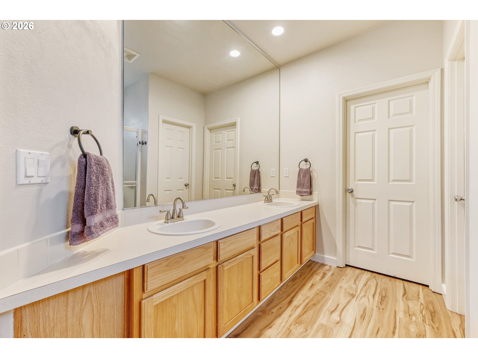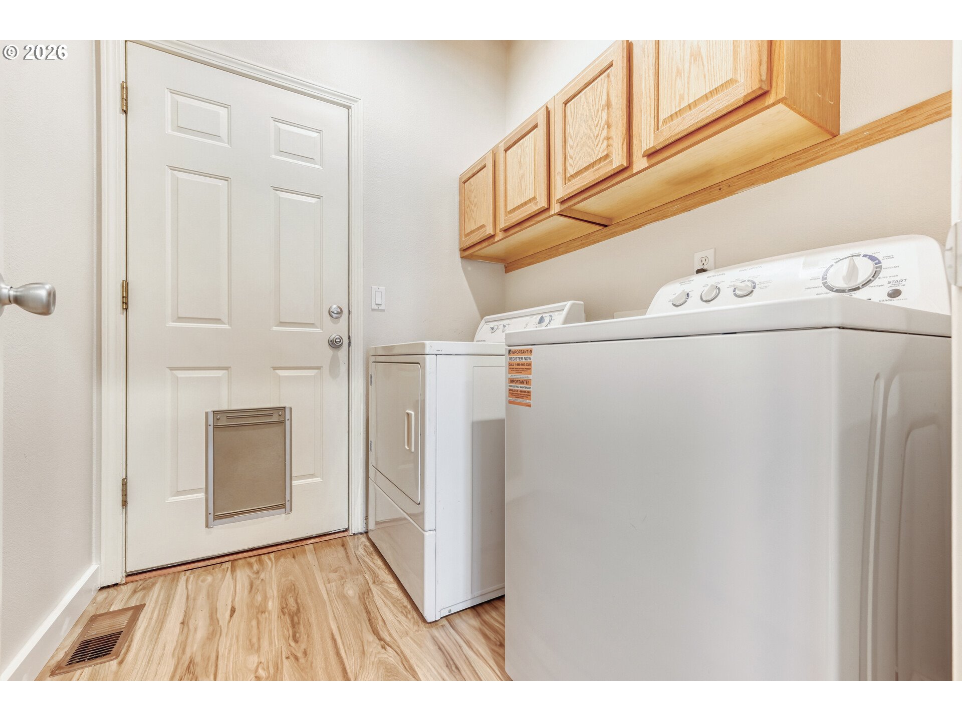 Located in the desirable Coffee Creek at Jones Farm neighborhood, this beautifully maintained home offers comfort, convenience, and easy living in a quiet community directly across from a neighborhood park. The inviting layout features vaulted ceilings in the kitchen, living room, and primary suite, along with tall ceilings throughout the rest of the home, creating an open and airy feel. The living space centers around a cozy gas fireplace and flows into the kitchen with updated stainless steel appliances. New Mohawk laminate wood flooring runs throughout the home, offering a modern look with durable scratch and stain resistance. The home includes three bedrooms and two bathrooms, including a spacious primary suite with vaulted ceilings and a walk in shower. Recent updates include a brand new water heater, and the home is equipped with a gas furnace and central air conditioning for year round comfort. The washer, dryer, and refrigerator are all included, making the home truly move in ready. Outside, enjoy an oversized Trex deck overlooking a spacious backyard with planter boxes, perfect for entertaining, relaxing, or gardening. The oversized two car garage features an epoxy floor for a clean and durable finish. A standout feature is the HOA maintained landscaping for both the front and backyard, providing beautifully kept grounds without the maintenance. With its excellent condition, thoughtful updates, and park side setting, this home offers a rare blend of comfort, convenience, and low maintenance living in the sought after Jones Farm community. [Home Energy Score = 7. HES Report at https://rpt.greenbuildingregistry.com/hes/OR10236207]