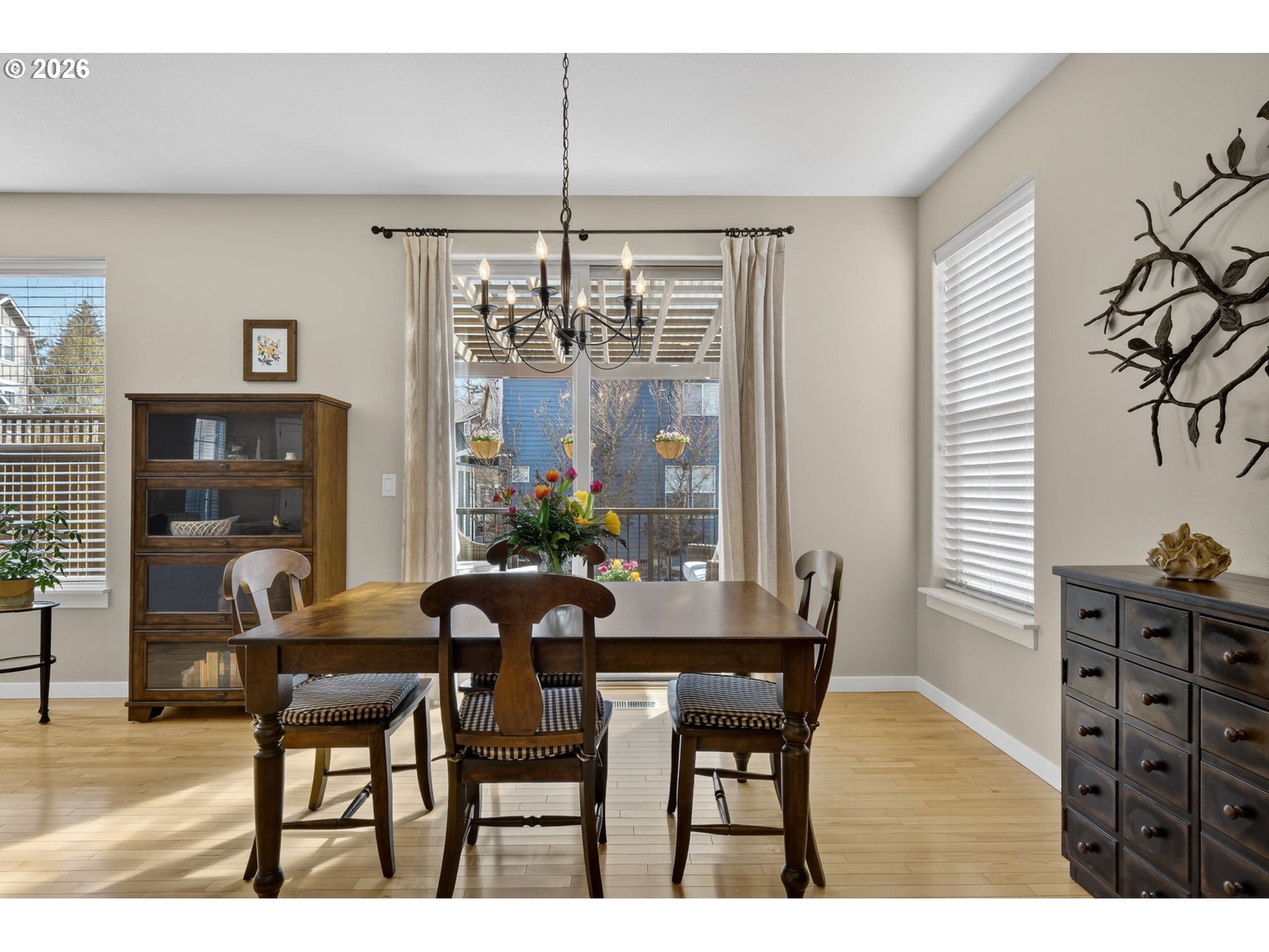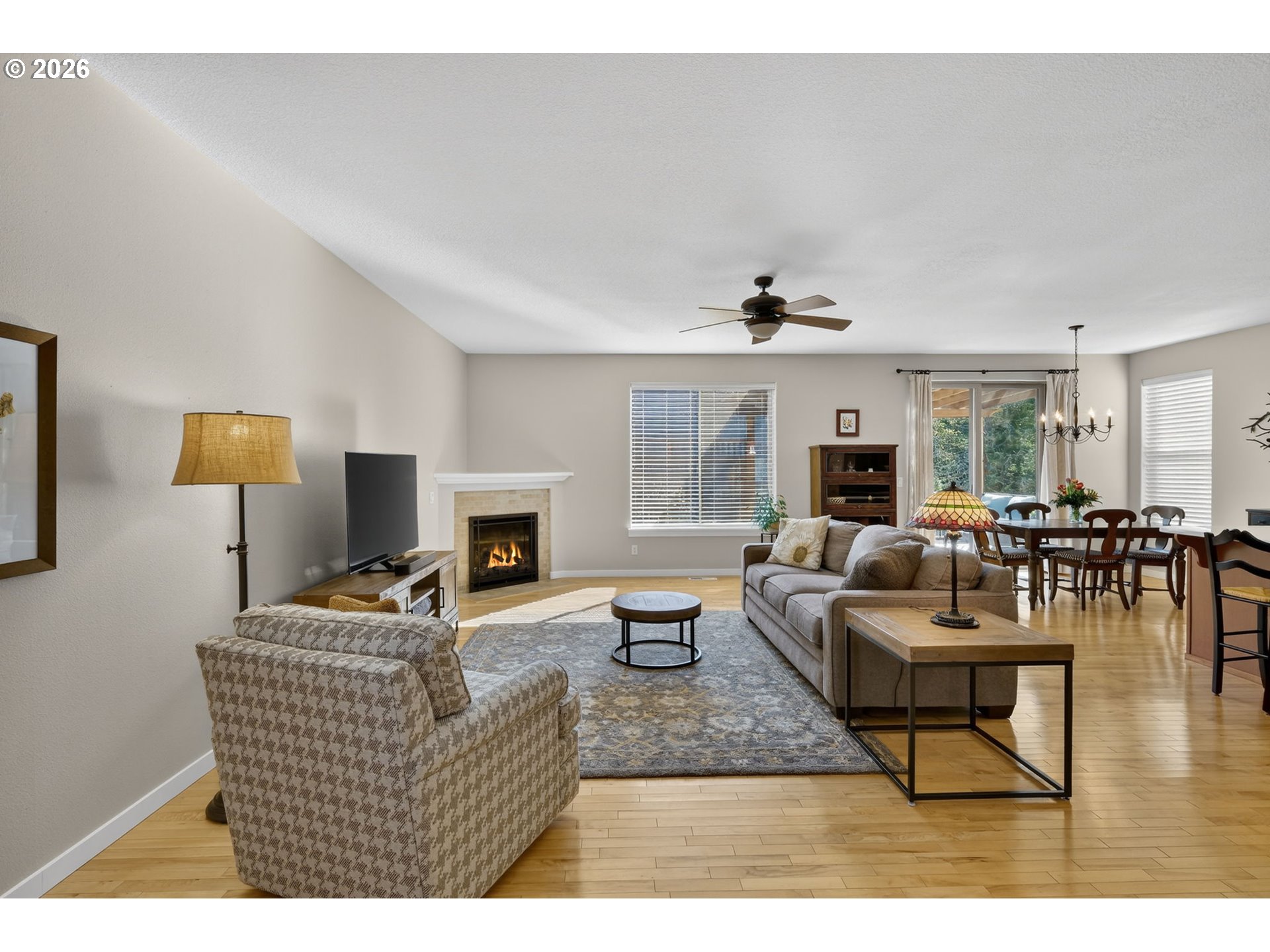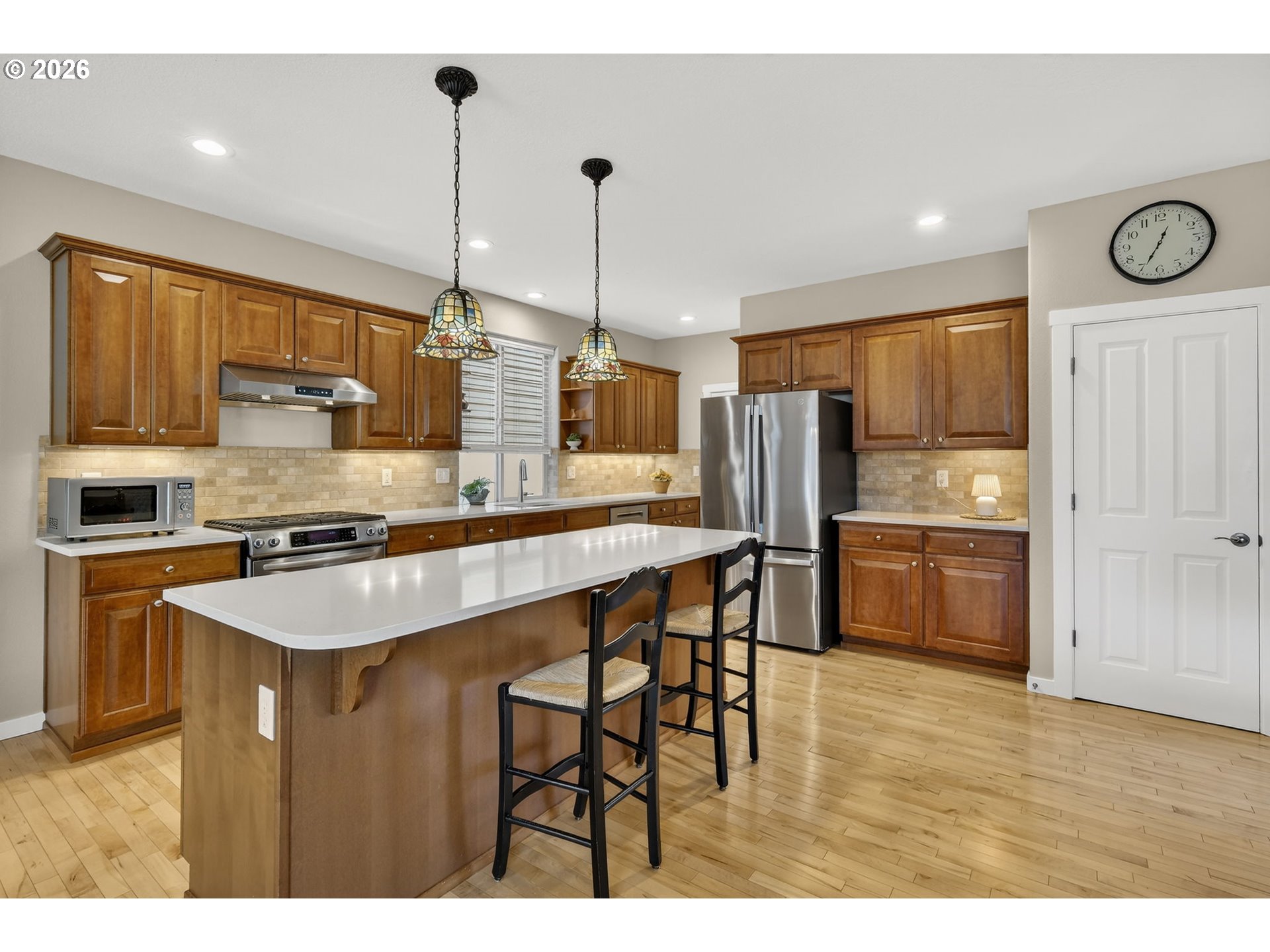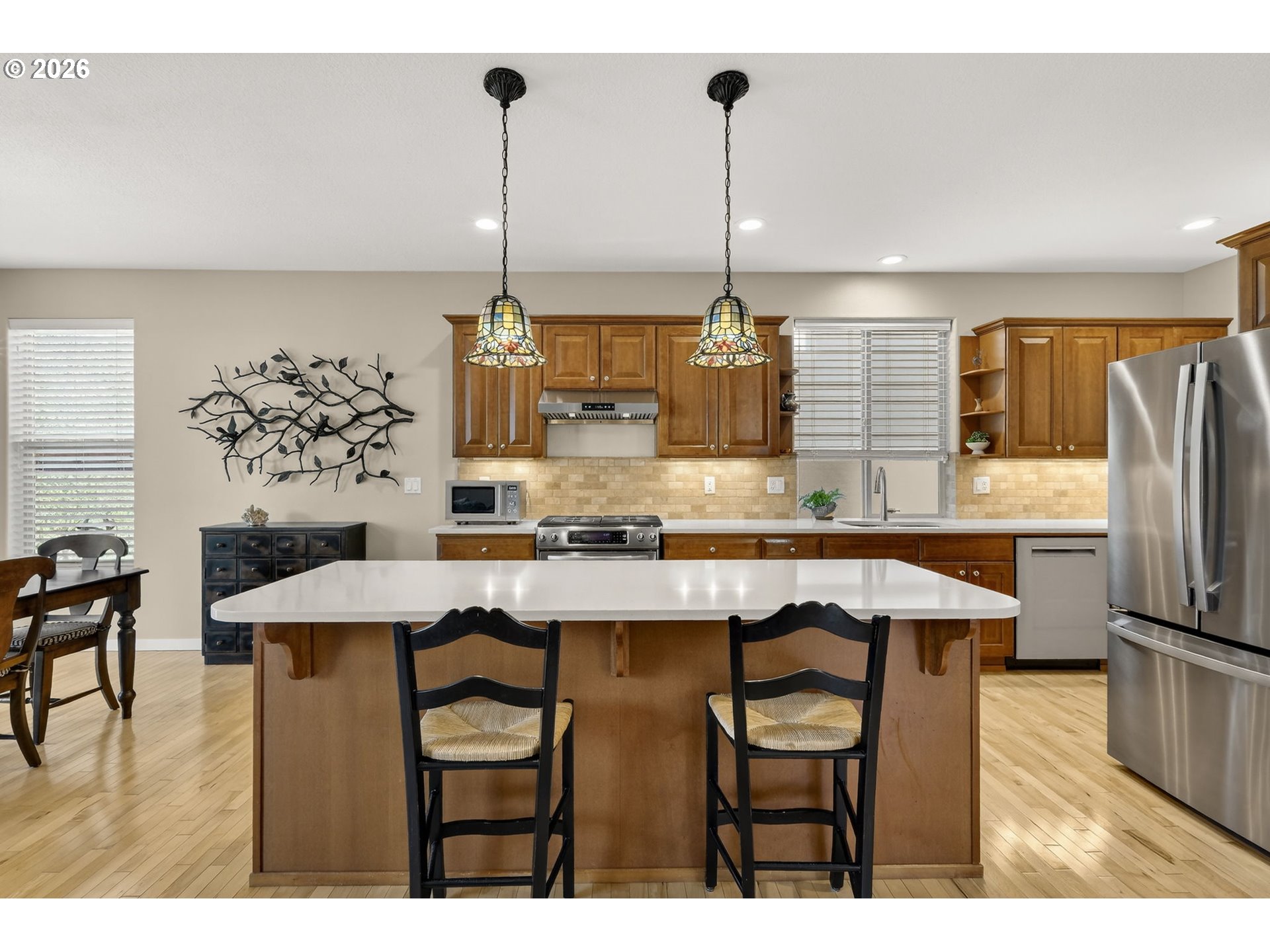 *OPEN SAT 4/11 & SUN 4/12 2-4PM!* Beautifully updated Bonny Slope home on a corner lot with soaring ceilings and versatile living spaces. A covered, arched entry with stone accents opens to hardwood floors throughout the main level, highlighted by high ceilings, a powder room, and coat closet. The large, open living room features a corner fireplace with tile surround, and the incredible kitchen offers quartz counters, tile backsplash, stainless steel appliances, pantry, and a large eat-in entertainer’s island with easy access to the 2-car garage. The dining room opens to a partially covered composite deck overlooking greenspace and a turfed, fenced side yard. Upstairs, the fully carpeted level (new carpet 2025) features a versatile landing perfect for an office or cozy reading nook. The primary suite has French doors, ceiling fan, greenspace views, and an updated spa-like ensuite with dual sinks, tile counters, luxury vinyl flooring, a tiled walk-in shower, water closet with pocket door, and walk-in closet. Two additional bedrooms share a full hall bathroom with tub/shower combo, luxury vinyl floors, and tile counters, while an oversized fourth bedroom with French doors and a large walk-in closet offers flexibility as a bedroom, bonus, or media room. Convenient upper-level laundry has luxury vinyl floors. Recent updates include a new Presidential roof and gutters (2021), Bosch dishwasher (2025), sliding door (2021), sprinkler system (2024), composite deck (2020), and re-screened windows (2022). Enjoy a 2-car garage, corner lot, and fully fenced turfed side yard, just minutes from a community park, Bonny Slope Elementary, and Lost Park, with easy highway access.