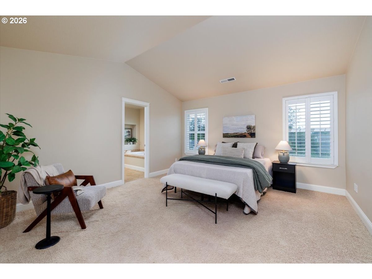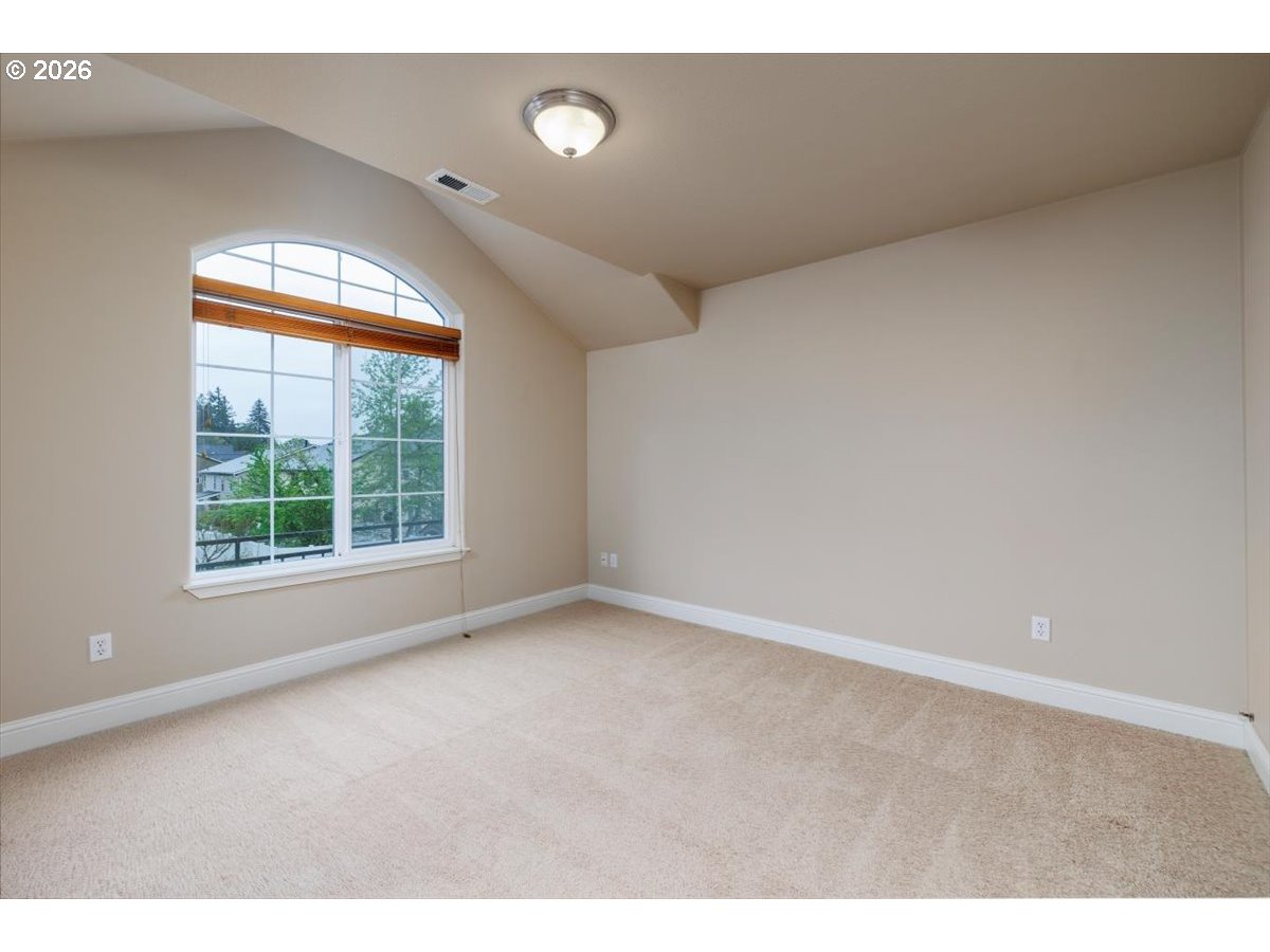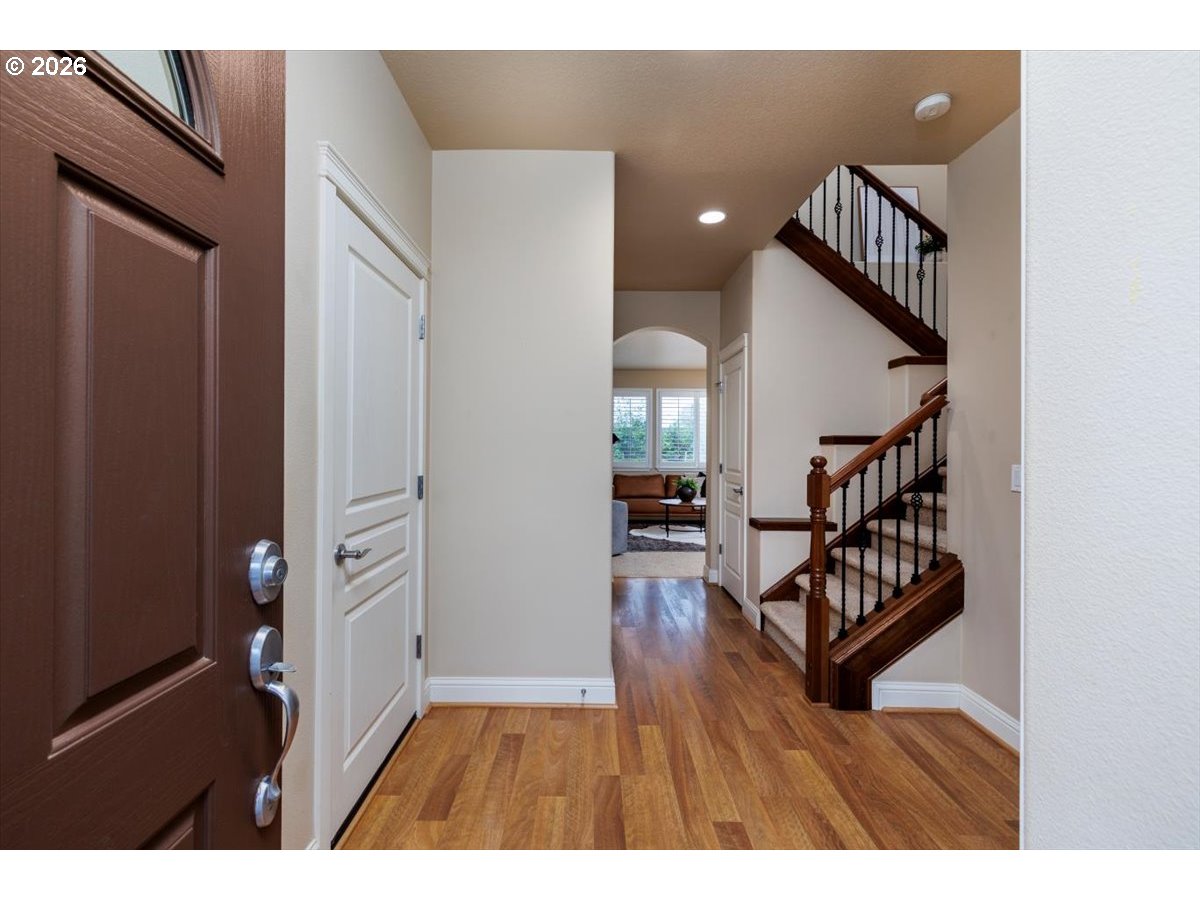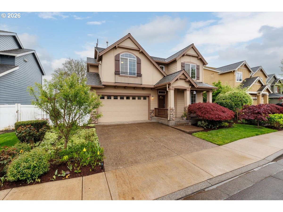 Wonderful move-in ready home backing to serene greenspace, offered by the original owner and custom built by Riverside Homes! Enjoy peace of mind with a brand new roof and a recently upgraded 14-panel owned solar system, delivering energy efficiency and long-term savings. This spacious and versatile floor plan features 3 bedrooms plus a den and bonus room—ideal for today’s flexible living needs. Elegant wrought iron banisters lead to the upper level, where the vaulted primary suite offers dual sinks, tile counters, a soaking tub, separate shower, and an expansive walk-in closet with custom built-in shelving. The inviting great room layout is perfect for everyday living and entertaining, complemented by a well-appointed kitchen with rich alder cabinetry, stainless steel appliances (including a new microwave), pantry, and center island. Additional highlights include central A/C, custom wood plantation-style shutters, and a convenient garage service door. Step outside to enjoy nearby neighborhood park amenities, including a basketball court. Located in the highly desirable Hillsboro School District, this home combines comfort, efficiency, and an exceptional setting.