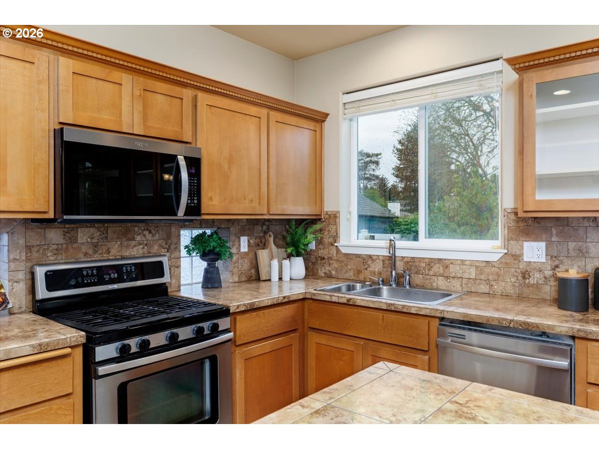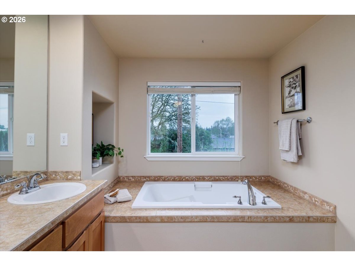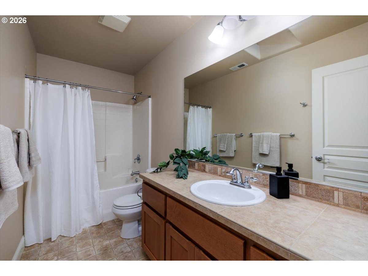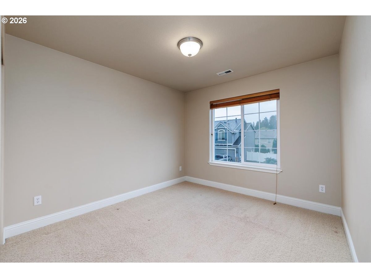 Wonderful move-in ready home backing to serene greenspace, offered by the original owner and custom built by Riverside Homes! Enjoy peace of mind with a brand new roof and a recently upgraded 14-panel owned solar system, delivering energy efficiency and long-term savings. This spacious and versatile floor plan features 3 bedrooms plus a den and bonus room—ideal for today’s flexible living needs. Elegant wrought iron banisters lead to the upper level, where the vaulted primary suite offers dual sinks, tile counters, a soaking tub, separate shower, and an expansive walk-in closet with custom built-in shelving. The inviting great room layout is perfect for everyday living and entertaining, complemented by a well-appointed kitchen with rich alder cabinetry, stainless steel appliances (including a new microwave), pantry, and center island. Additional highlights include central A/C, custom wood plantation-style shutters, and a convenient garage service door. Step outside to enjoy nearby neighborhood park amenities, including a basketball court. Located in the highly desirable Hillsboro School District, this home combines comfort, efficiency, and an exceptional setting.