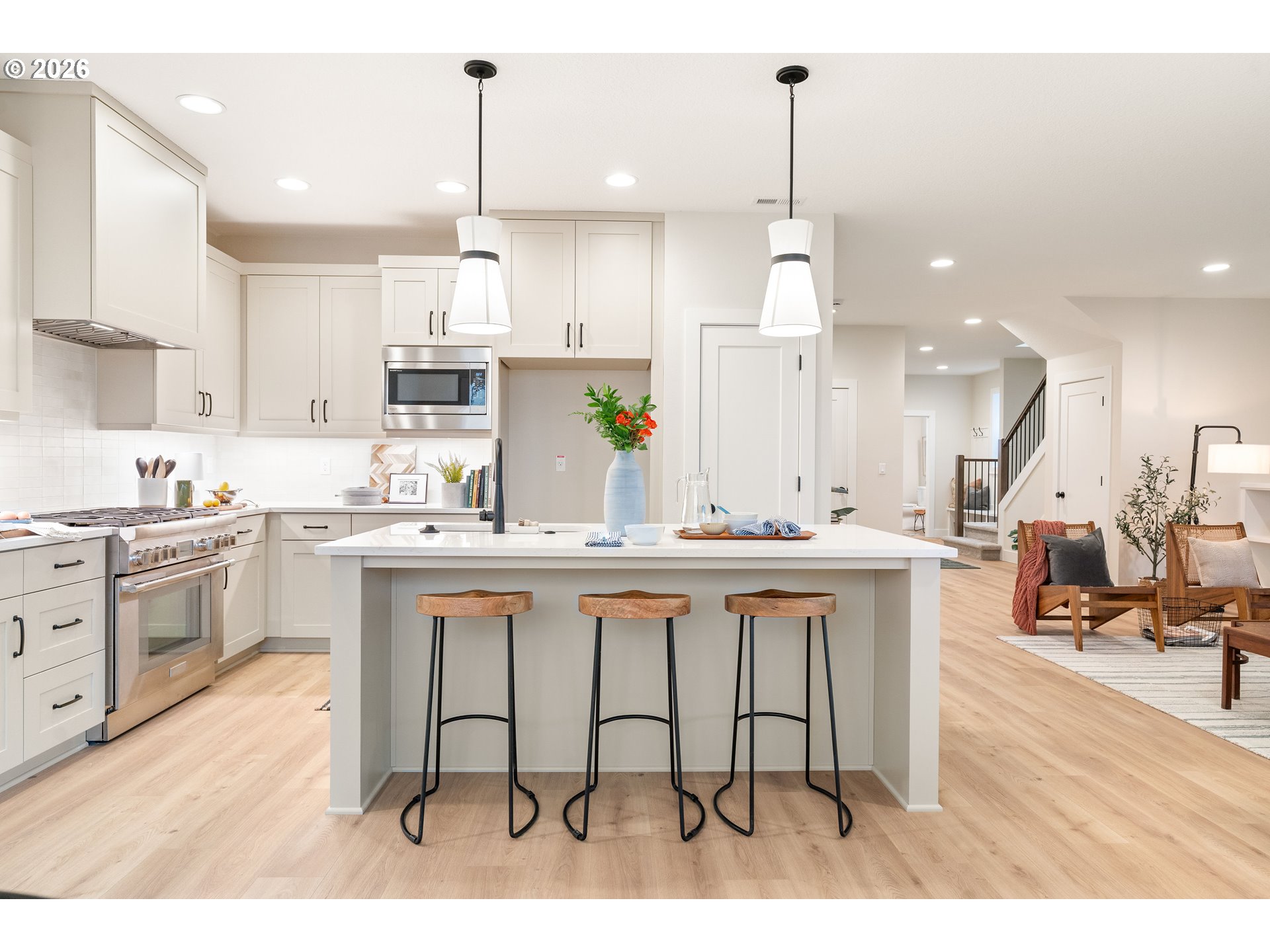 Dishwasher, Disposal, FreeStandingGasRange, GasAppliances, Island, Microwave, Pantry, Quartz, RangeHood, Stai