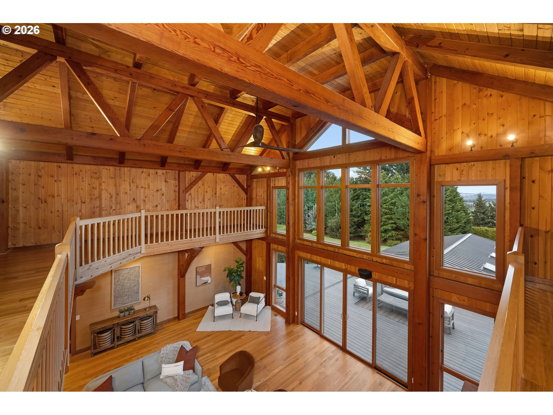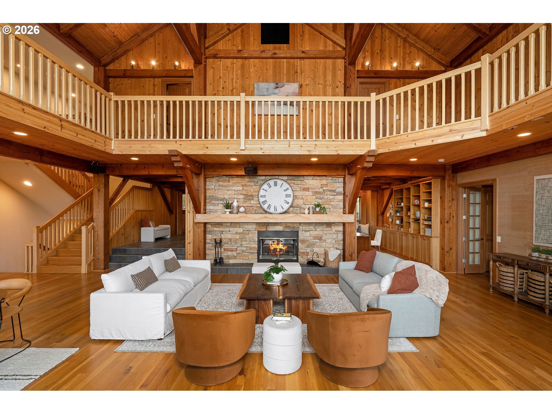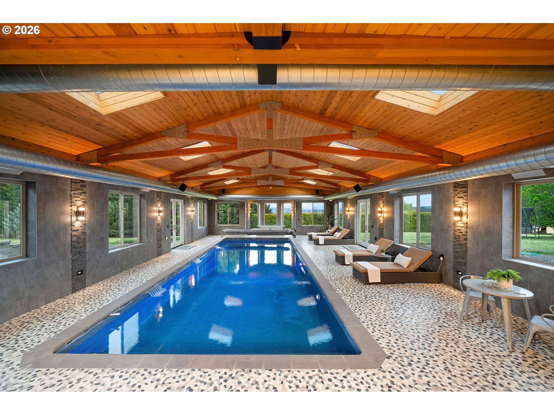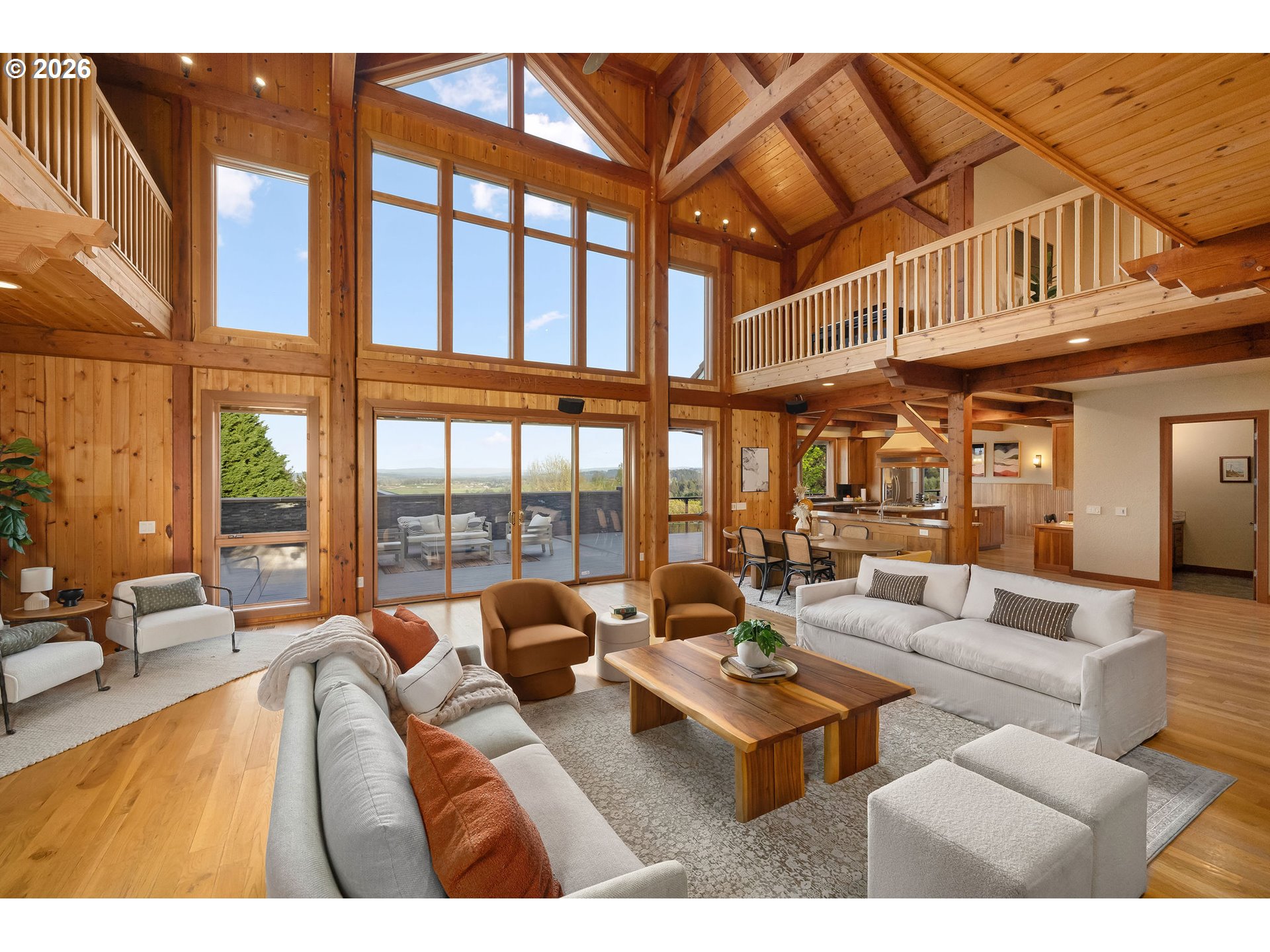 Open THURS, FRI Twilight, Sat & Sun! Rare 10-acre estate offering 12,007 sq ft of exceptional craftsmanship and versatility. This one-of-a-kind timberframe home features 5 bedrooms and 4.5 baths, constructed with stunning reclaimed wood dating back to the 1880s and sourced from the historic Bumble Bee Cannery in Astoria and a mill in Longview. Rich architectural details, exposed beams showing the joinery construction, and five fireplaces create warmth and character throughout. Five peaks visible from property, with Hood views from 24-foot soaring windows in great room, kitchen, dual offices, primary, and deck. St Helens, Rainier, Adams and Jefferson from different vantage points. A custom carved mantle shows all five mountains.Designed for both everyday living and entertaining, the home includes a stunning indoor saltwater pool and hot tub, complete with radiant heat flooring on pool deck, gym, theatre with 12-foot screen, billiards space, and stately library. True chef's kitchen with 12-foot leathered granite slab island and counters, double Electrolux convection ovens, 5 burner gas cooktop with commercial grade hood, and walk-in pantry. A separate upstairs apartment with loft provides ideal guest or multi-generational living. Whole-home generator offers year-round peace of mind. This expansive home with serious lodge resort vibes offers equestrian and winery potential. Volcanic rich soil perfect for Oregon's award-winning pinot noir grapes. Set on 10 rolling acres, the property includes a large barn with equipment, greenhouse, darkroom, and extensive storage throughout. A rare opportunity to own a legacy property that blends history, function, and lifestyle—just minutes from wine country and within reach of Portland.