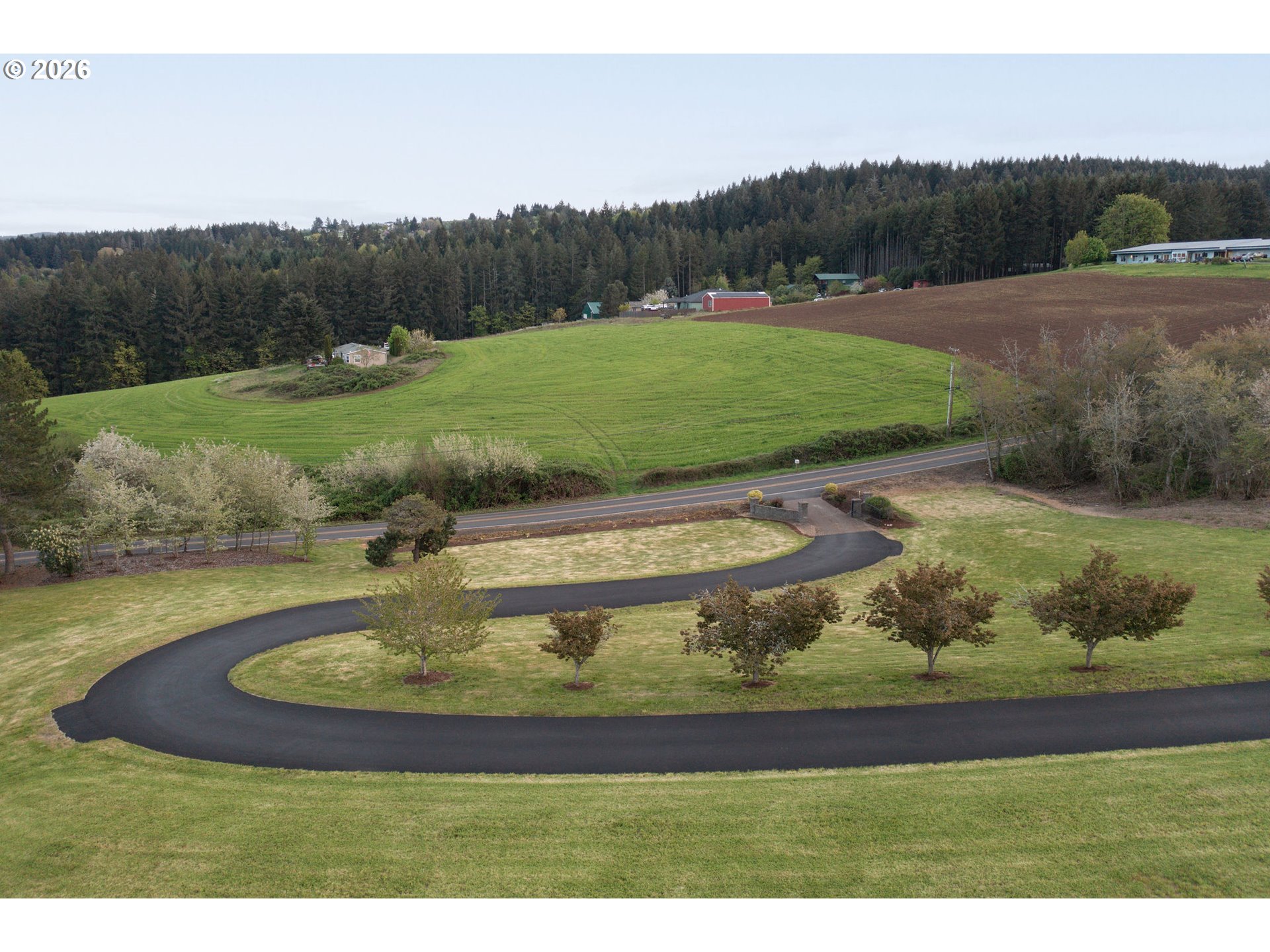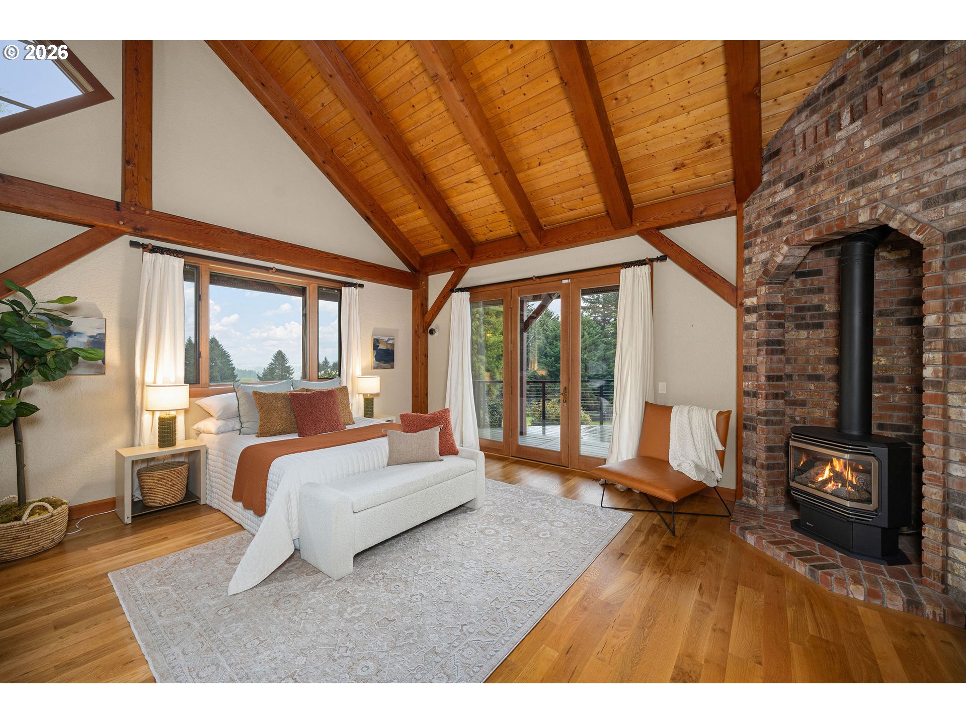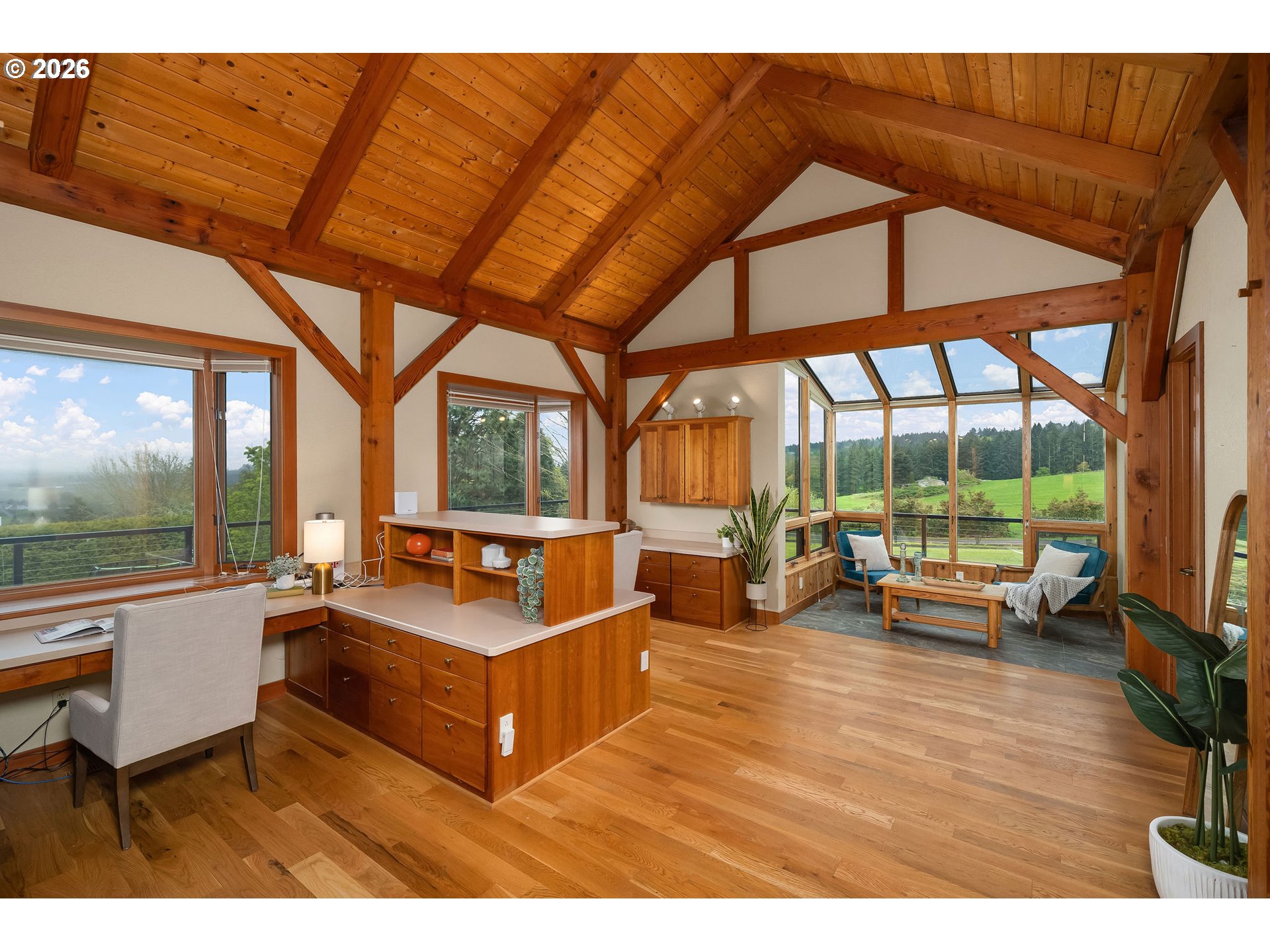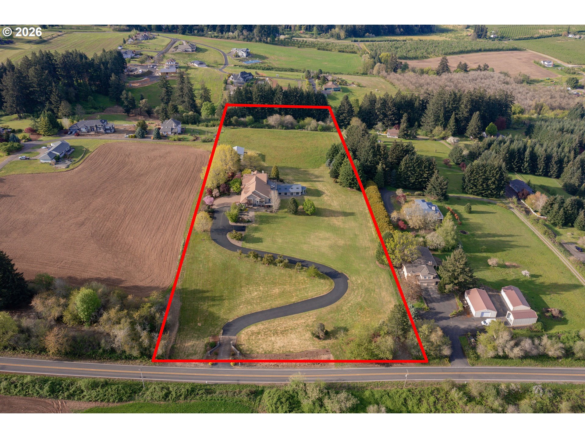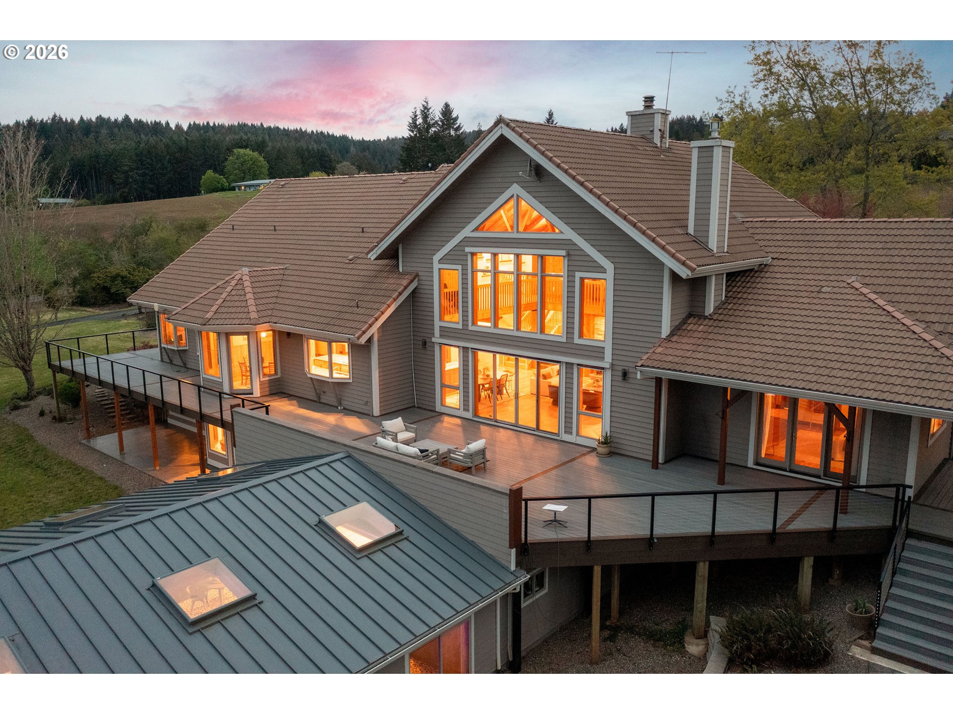 Open THURS, FRI Twilight, Sat & Sun! Rare 10-acre estate offering 12,007 sq ft of exceptional craftsmanship and versatility. This one-of-a-kind timberframe home features 5 bedrooms and 4.5 baths, constructed with stunning reclaimed wood dating back to the 1880s and sourced from the historic Bumble Bee Cannery in Astoria and a mill in Longview. Rich architectural details, exposed beams showing the joinery construction, and five fireplaces create warmth and character throughout. Five peaks visible from property, with Hood views from 24-foot soaring windows in great room, kitchen, dual offices, primary, and deck. St Helens, Rainier, Adams and Jefferson from different vantage points. A custom carved mantle shows all five mountains.Designed for both everyday living and entertaining, the home includes a stunning indoor saltwater pool and hot tub, complete with radiant heat flooring on pool deck, gym, theatre with 12-foot screen, billiards space, and stately library. True chef's kitchen with 12-foot leathered granite slab island and counters, double Electrolux convection ovens, 5 burner gas cooktop with commercial grade hood, and walk-in pantry. A separate upstairs apartment with loft provides ideal guest or multi-generational living. Whole-home generator offers year-round peace of mind. This expansive home with serious lodge resort vibes offers equestrian and winery potential. Volcanic rich soil perfect for Oregon's award-winning pinot noir grapes. Set on 10 rolling acres, the property includes a large barn with equipment, greenhouse, darkroom, and extensive storage throughout. A rare opportunity to own a legacy property that blends history, function, and lifestyle—just minutes from wine country and within reach of Portland.