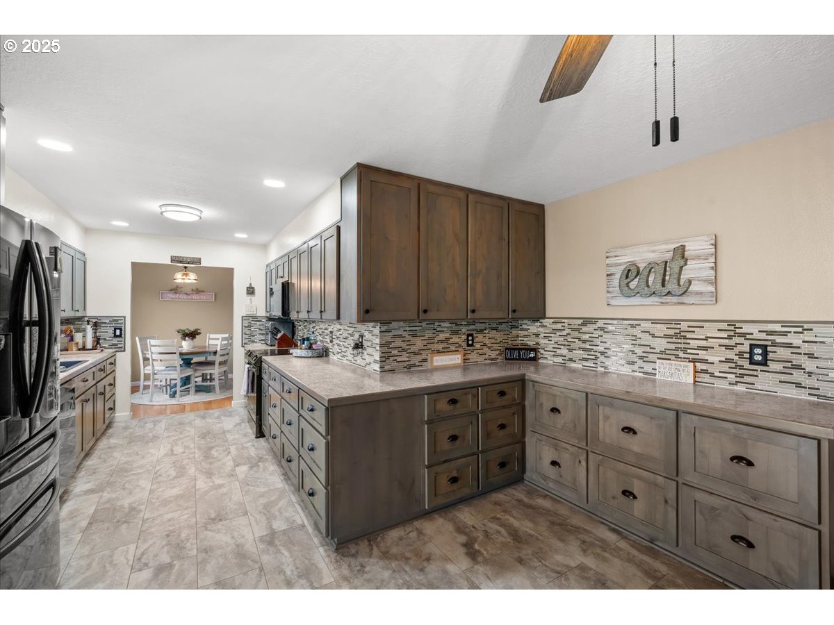 Prime Banks location with country surroundings. Updated one-level ranch on 0.6 acres backing to farmland, offering 4 bedrooms, 2 baths, 1,644 sq ft, refinished oak floors, a painted brick fireplace, and great natural light. The 2021 kitchen remodel includes custom cabinetry, deep drawers, tile backsplash, Formica counters, and black stainless appliances. Dining area overlooks the private backyard. Bedrooms feature hardwood floors, and the 2021 hall bath includes a new shower tile surround, and double vanity. LVT flooring added in 2021. Property features a private yard, 20x23 covered patio with epoxy finish and 2022 hot-tub-ready wiring, detached garage/shop, and RV parking. Major updates include new septic tank (2020), kitchen/bath remodel and flooring (2021), electrical panel (2022), heat pump (2023), vapor barrier (2024), and well pump, motor, and lines (2025). Easy access to Hwy 26.