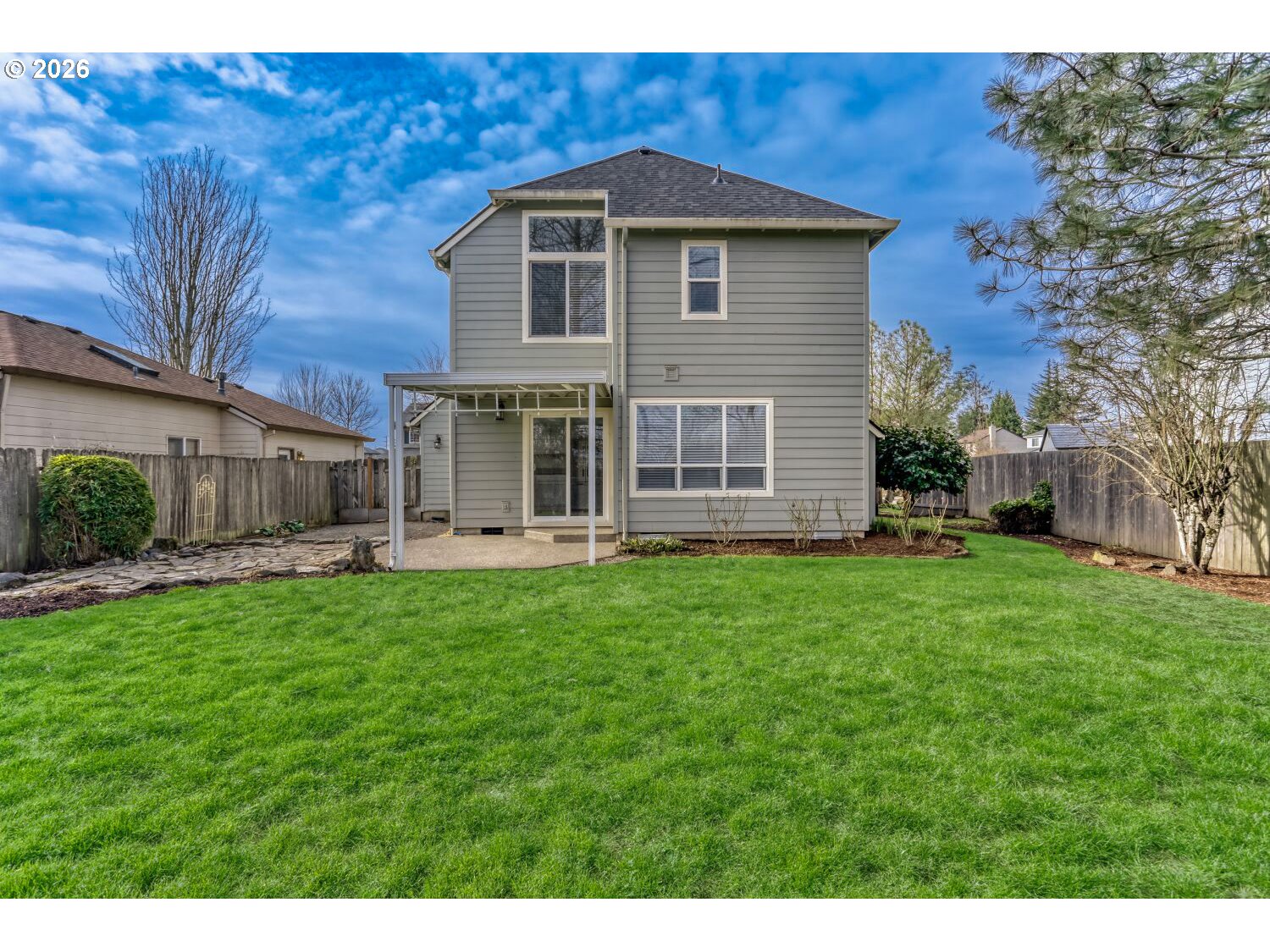 Turn-key Rock Creek traditional backing to greenspace! Situated on a large, private lot on a quiet street, this home has been meticulously maintained and fully updated with a brand-new roof, recent fiber cement siding, all-new interior paint, new carpet, and more. A two-story entry introduces a spacious living room with laminate flooring and soaring ceilings and numerous windows for excellent natural light. A freshly updated, open-concept kitchen features just-painted cabinetry, solid surface countertops, brand-new stainless steel appliances, and pantry. The upper level boasts three spacious bedrooms, including a deluxe primary suite with vaulted ceilings, french doors, and attached bathroom with new LVT flooring, double sinks, walk-in shower, and oversized walk-in closet. High-quality construction with large room sizes, high ceilings, white doors and millwork, abundant storage space, and more. Fully fenced backyard with covered patio, mature landscaping, and outstanding privacy. Sought-after Rock Creek location, close to THPRD trails and parks, Rock Creek Country Club, and great schools!