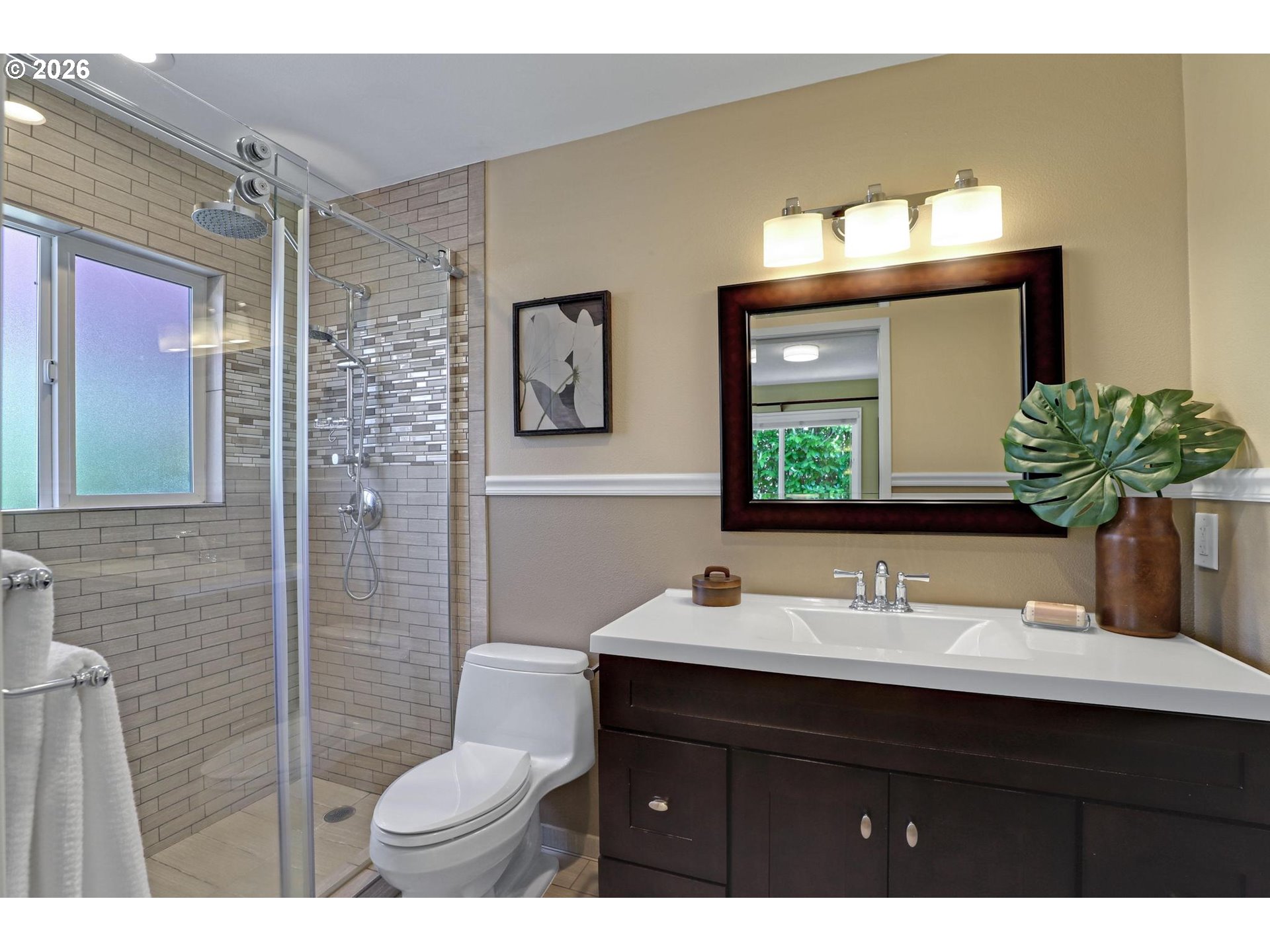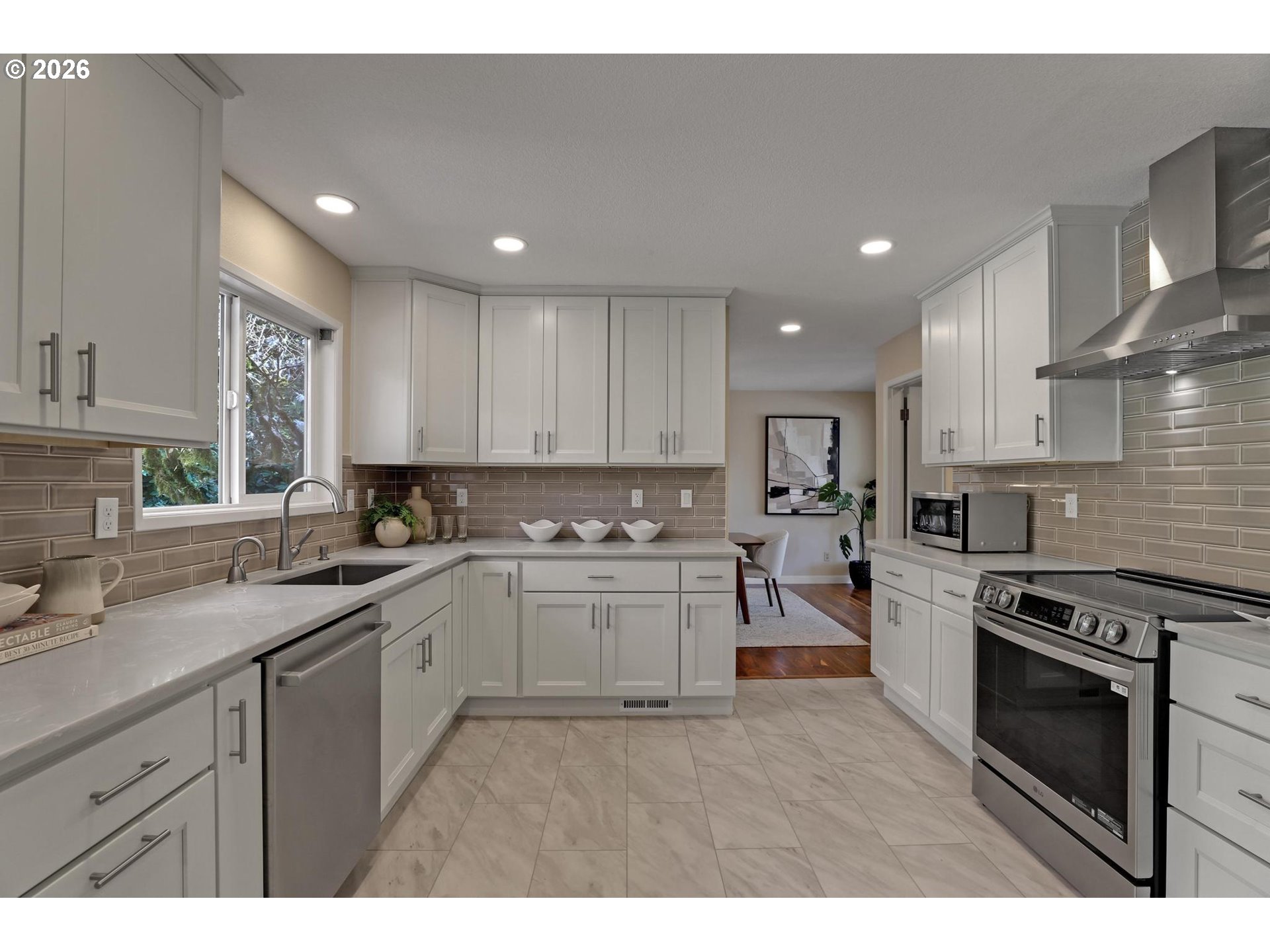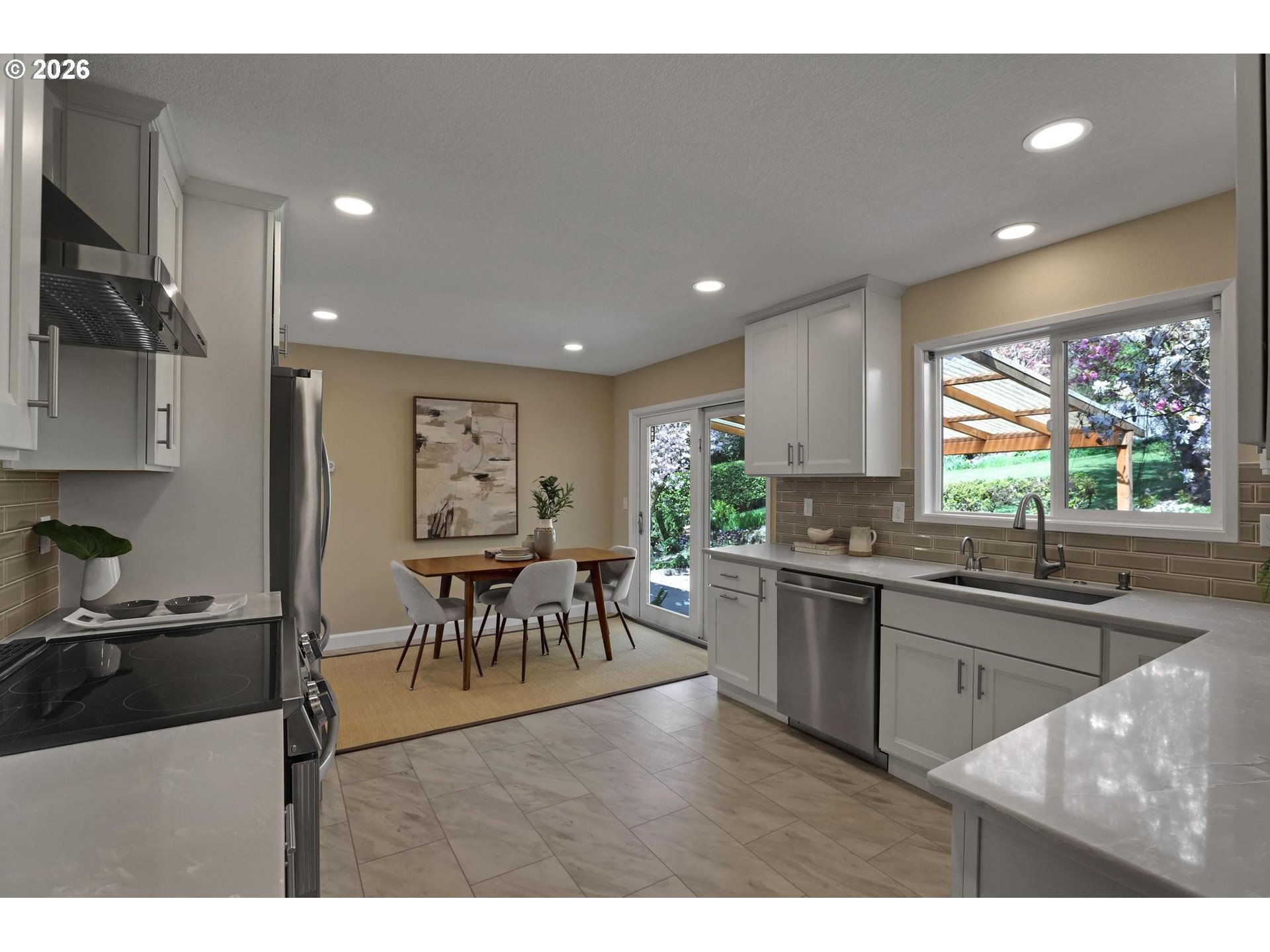 Close-in Washington County fully remodeled home with convenient access to Hwy 26, downtown Portland, and the Zoo, offering a comfortable balance of accessibility and privacy. Set on a 0.28-acre lot, the backyard is a standout—private, quiet, and surrounded by mature landscaping with established plantings and garden space. The interior has been thoughtfully renovated and offers a turnkey 3 bed, 3 bath layout with a functional floor plan, plenty of storage throughout, and an oversized 2-car garage. The main level includes a remodeled kitchen (2024) with slab quartz countertops, LG stainless steel appliances, and an eating area with direct access to the patio and beautiful backyard. The living and dining spaces are open and filled with natural light. The primary suite includes a remodeled bathroom featuring a walk-in tiled shower. Two additional bedrooms are well-sized, and a hall bathroom completes the main level. The lower level adds flexibility with a large family room, full bathroom, and a spacious utility/workshop area with built-in storage. Recent improvements include a new composite roof (2025) & electrical panel (2024), making this a move-in ready home. Schools: Bridlemile, West Sylvan, Lincoln