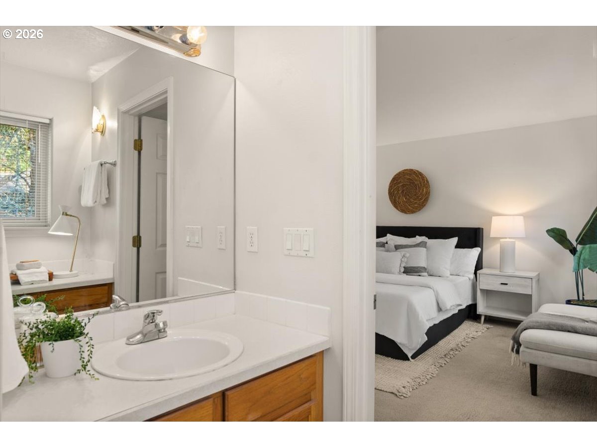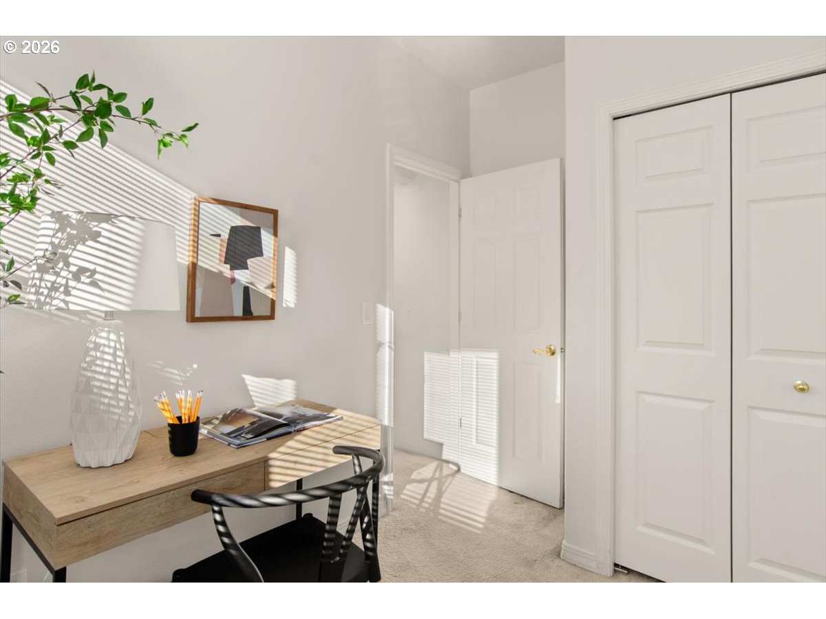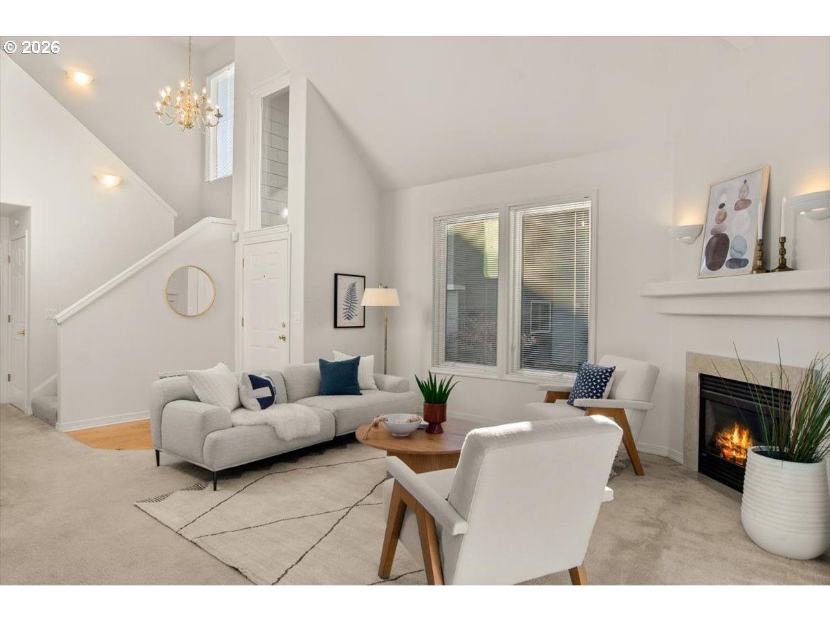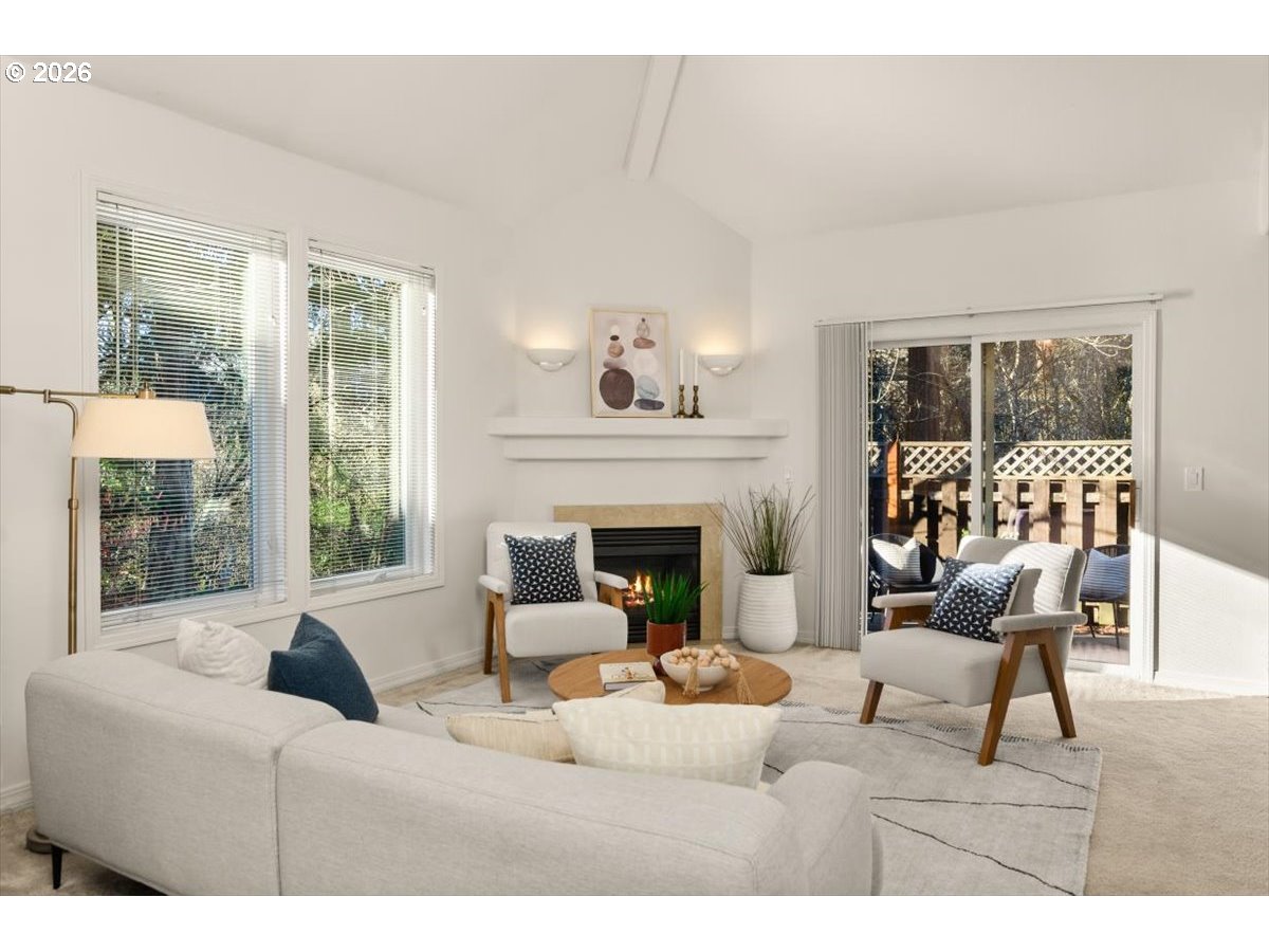 Tucked into a quiet, natural setting, this tranquil townhome offers a peaceful place to come home to, surrounded by quiet greenspace. The home features a light-filled living room with vaulted ceilings, a gas fireplace, and a comfortable flow for daily living. The adjoining dining area opens to a patio with peaceful views of trees—perfect for relaxing or enjoying your morning coffee. The main level also includes a flexible bedroom or office, a convenient half bath, and a laundry room with direct access to the oversized one-car garage. Upstairs, the primary suite includes a walk-in shower, two vanities, and a generous walk-in closet. With a setting surrounded by natural habitat, this home offers comfortable, low maintenance living in a beautifully calm environment. Located in a quaint community near Murray Hill, you’ll enjoy the balance of serenity and convenience, with easy access to highways, parks, shopping, restaurants, Nike, Tektronix, Intel, and public transportation.