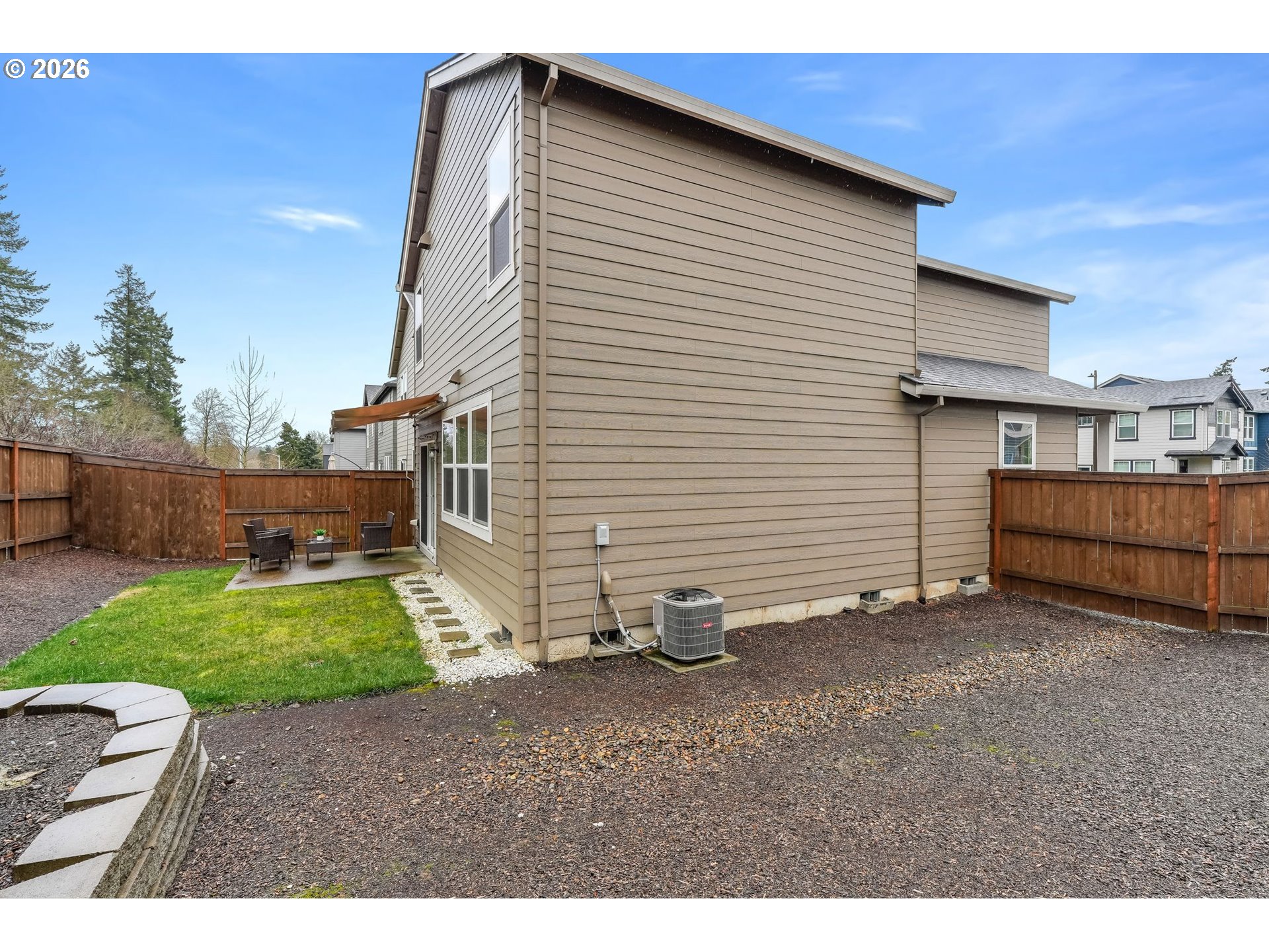 Immaculate 2021-built home in a highly desirable Tigard community, formerly the neighborhood’s model home. Positioned on the largest lot in the community, this corner property offers both a spacious backyard and a rare side yard, creating exceptional outdoor space and privacy. As you enter, you’re welcomed by a light-filled hallway that leads into the home’s bright, open-concept living spaces. The stunning kitchen is the centerpiece of the home, featuring quartz countertops, stainless steel appliances, designer finishes, and abundant natural light. It flows seamlessly into the dining and living areas, where a cozy gas fireplace creates a warm and inviting gathering space.Upstairs you’ll find three bedrooms, two baths, and a spacious loft or landing area—perfect for a second living room, office, or flex space—along with convenient upper-level laundry. The home’s thoughtful layout combines style and functionality with modern finishes throughout. Located in a highly walkable and bikeable neighborhood near the scenic Fanno Creek Trail system, this home also offers close proximity to great schools, shopping, restaurants, freeway access and public transit. With a low HOA and model-home quality throughout, this beautifully maintained home offers the perfect blend of comfort, design and convenience in a sought-after Tigard location.
